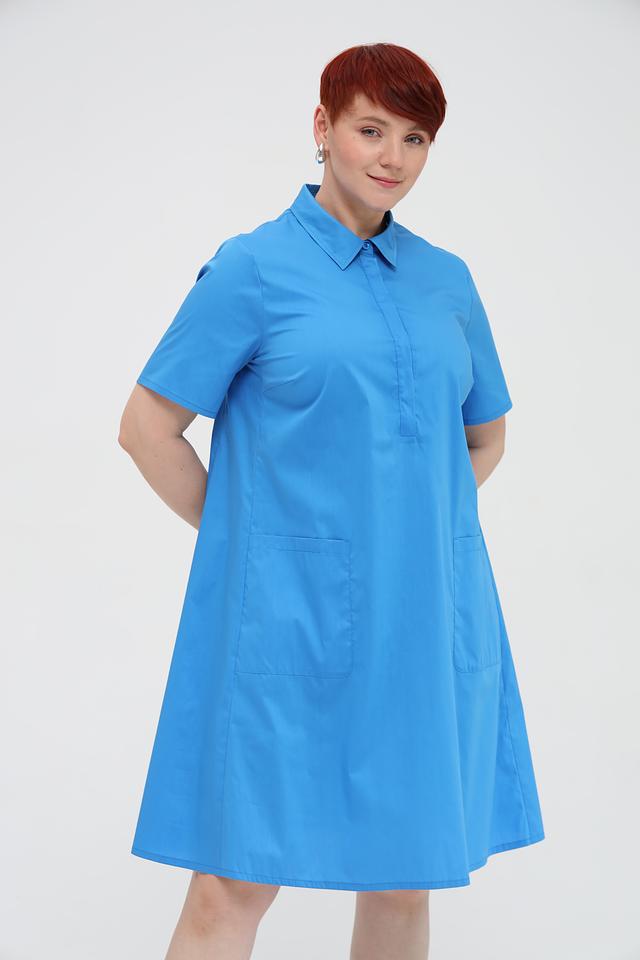 Платье с короткими рукавами и воротником-стойкой, застегивается на ряд пуговиц. На передней части платья расположены два накладных кармана, добавляющие практичности и непринужденности образу. Ткань платья – это сочетание хлопка, полиамида и эластана, что обеспечивает комфорт в носке, воздухопроницаемость и небольшую эластичность.