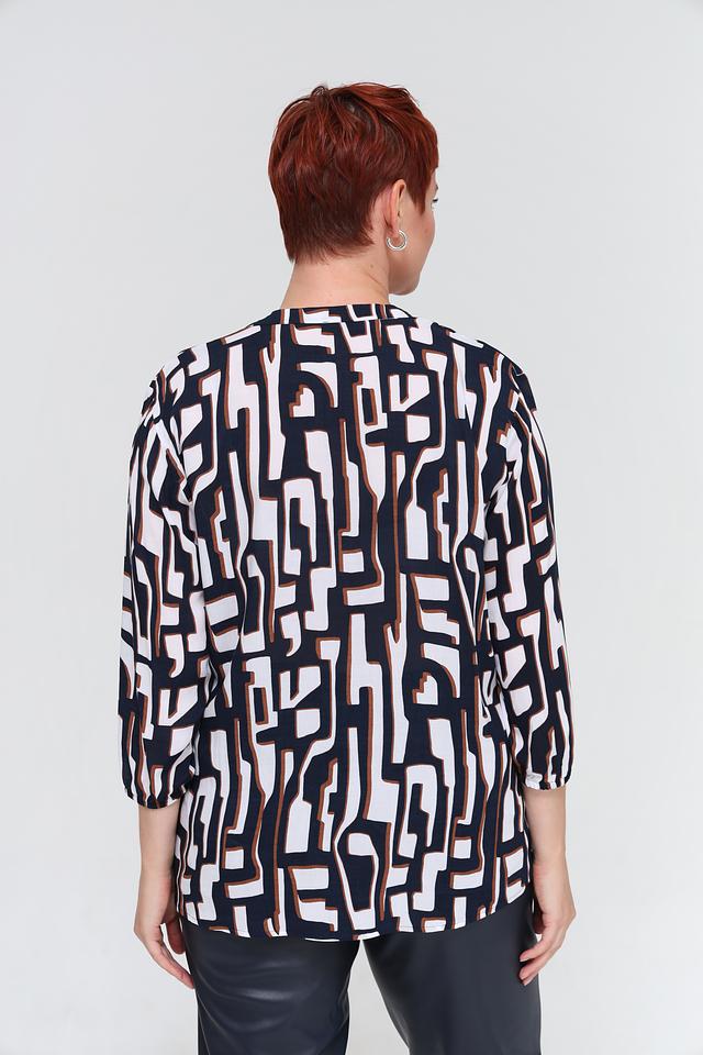 Блуза имеет оригинальный принт, сочетающий в себе оттенки синего, белого и коричневого. V-образный вырез горловины и рукава длиной 3/4 придают модели элегантный и женственный вид.