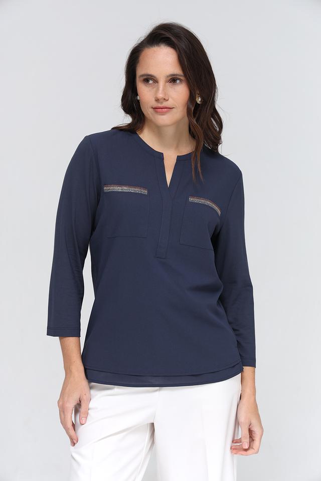 Модель имеет удобный V-образный вырез горловины и рукава длиной 3/4, что делает ее подходящей для любого времени года. На груди расположены два накладных кармана с декоративной отделкой, добавляющие блузе оригинальности.