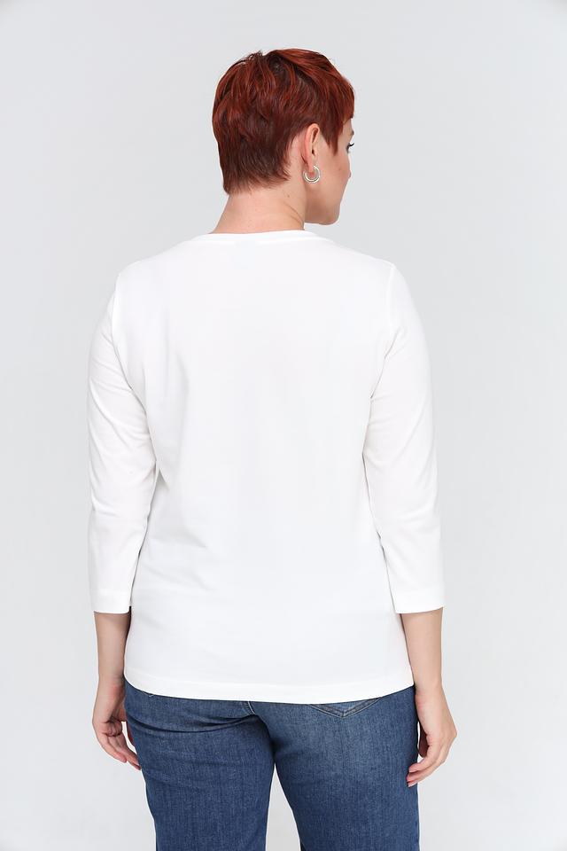 Белая футболка Rabe collection с оригинальным принтом и рукавом 3/4. Изготовлена из мягкого хлопка с добавлением эластана для комфорта и хорошей посадки. Состав: хлопок 92%, эластан 8%