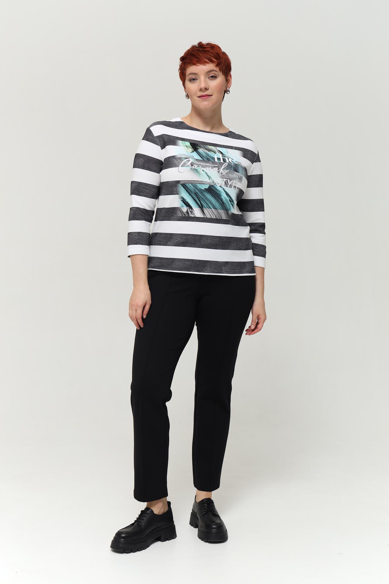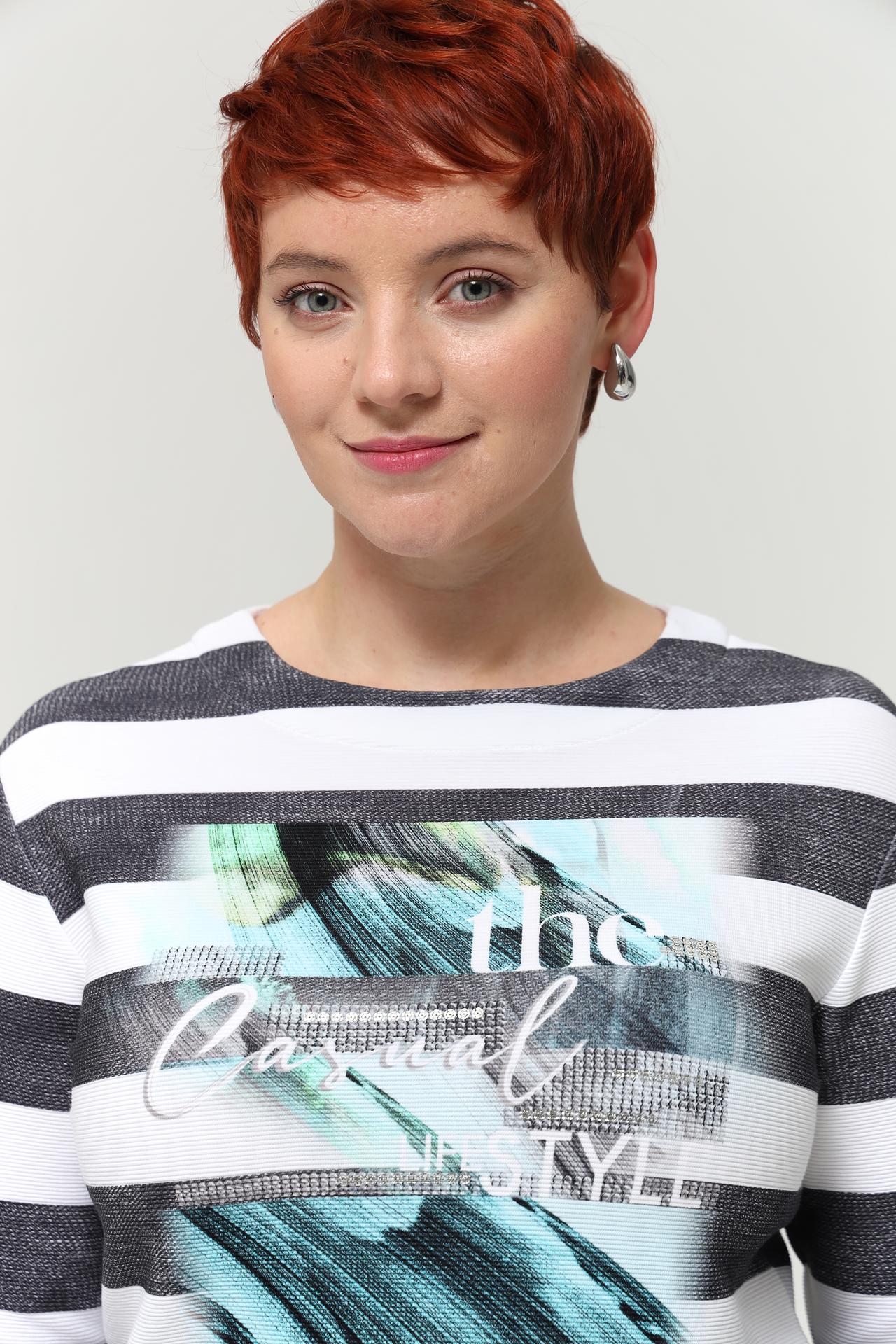 Эта модель сочетает в себе элегантность и практичность, подходя как для работы, так и для повседневных встреч. Полосатый принт в сочетании с декоративным рисунком добавляет изюминку и позволяет легко комбинировать блузку с различными элементами гардероба.