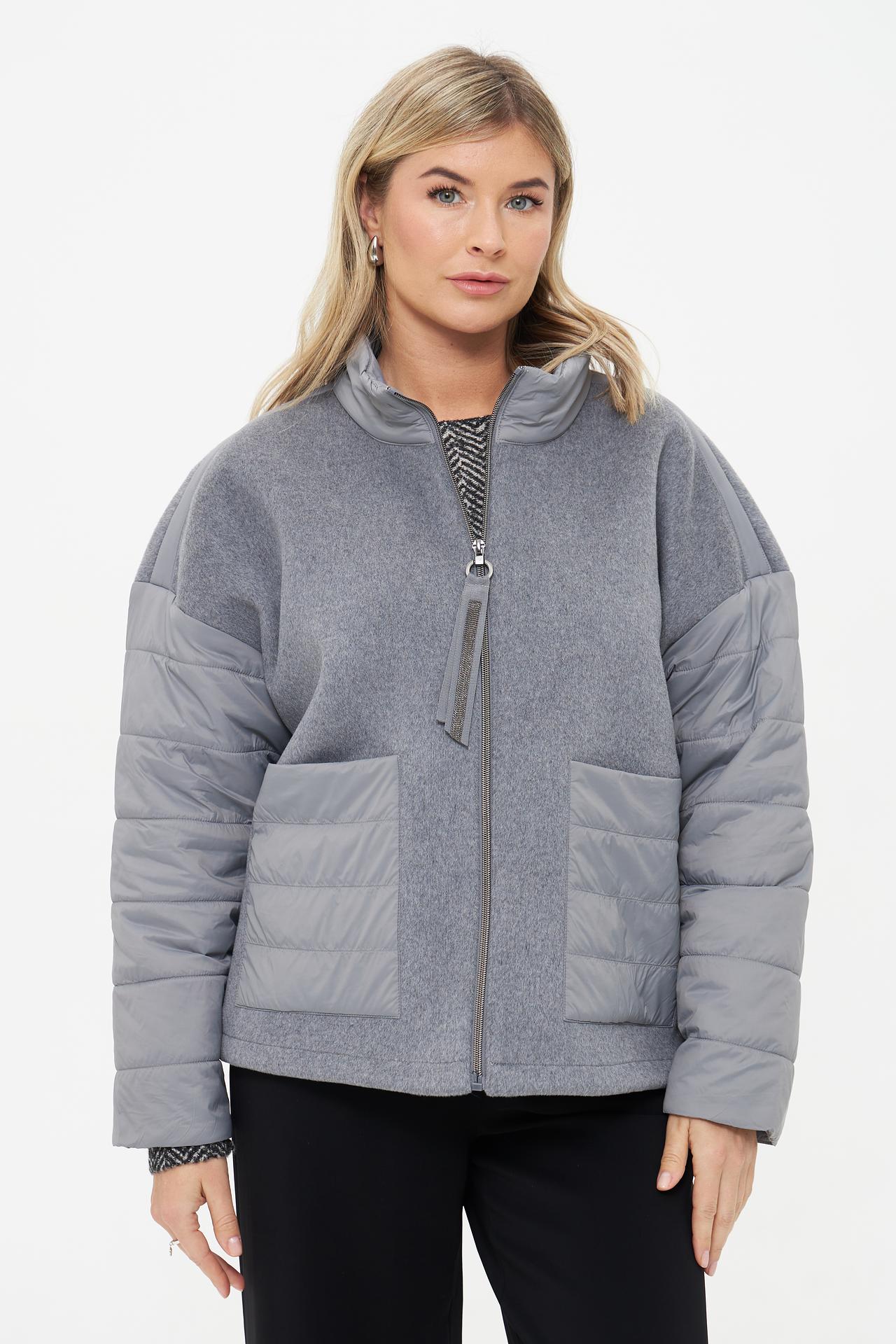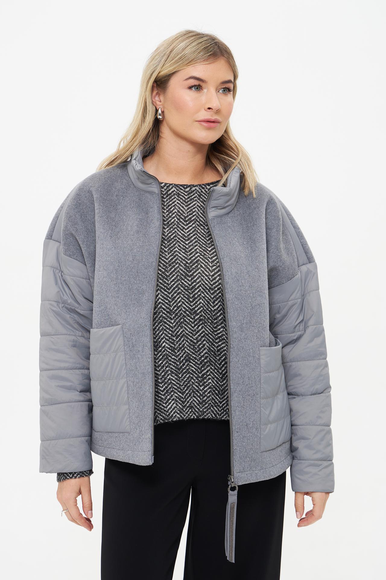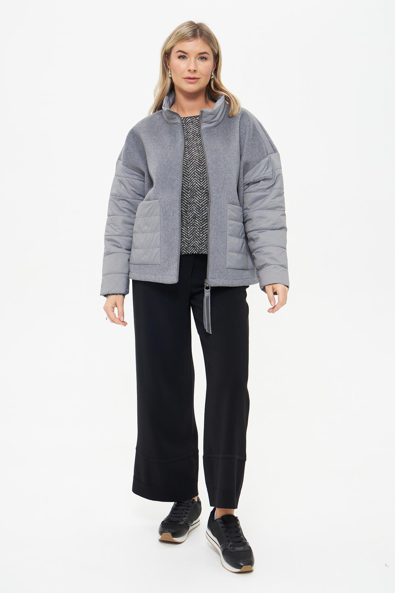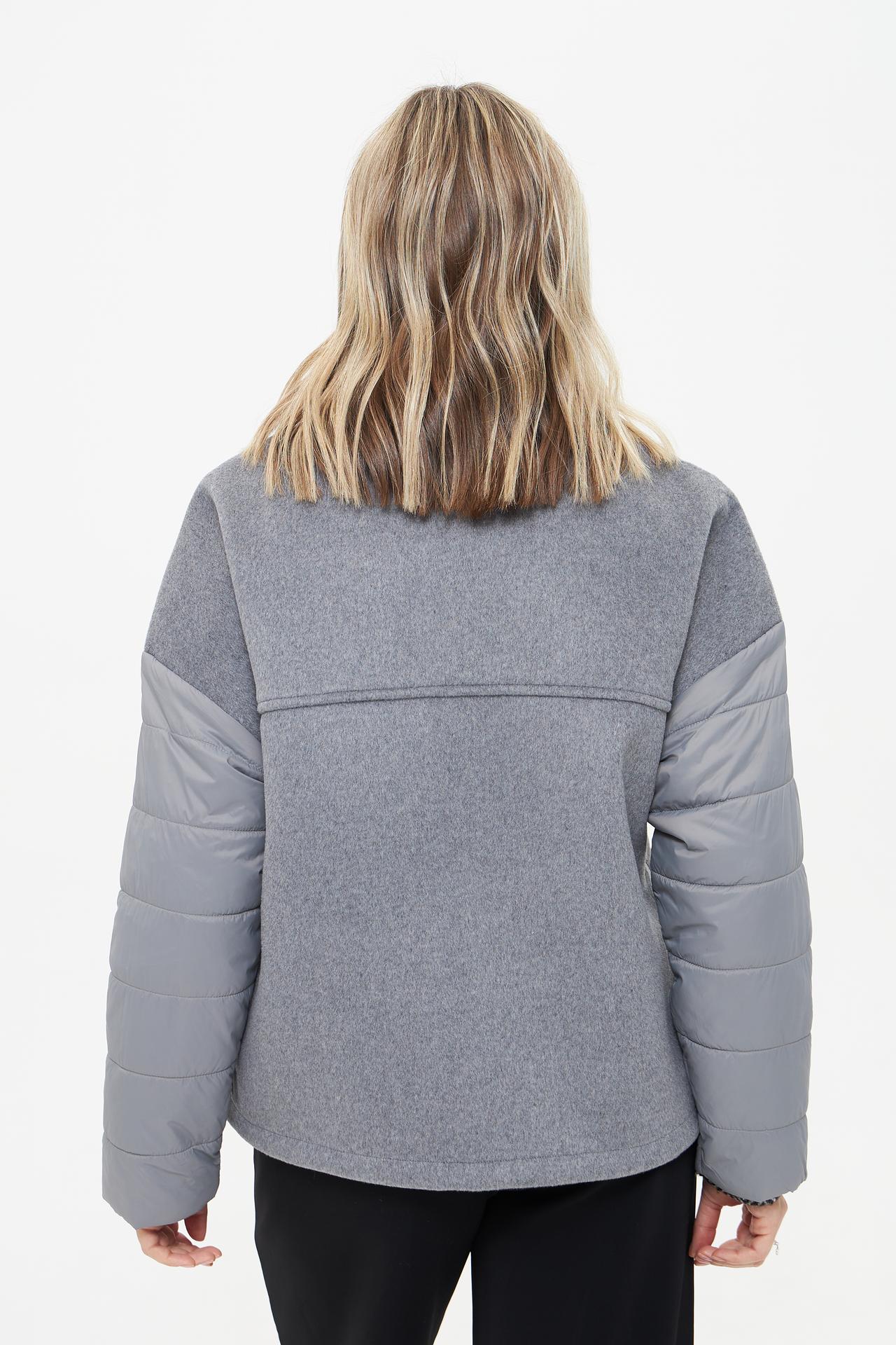- Комбинированный дизайн: Сочетание разных фактур ткани — шершавого трикотажа и гладкого стеганого полиэстера — создает интересный визуальный эффект и добавляет куртке оригинальности.