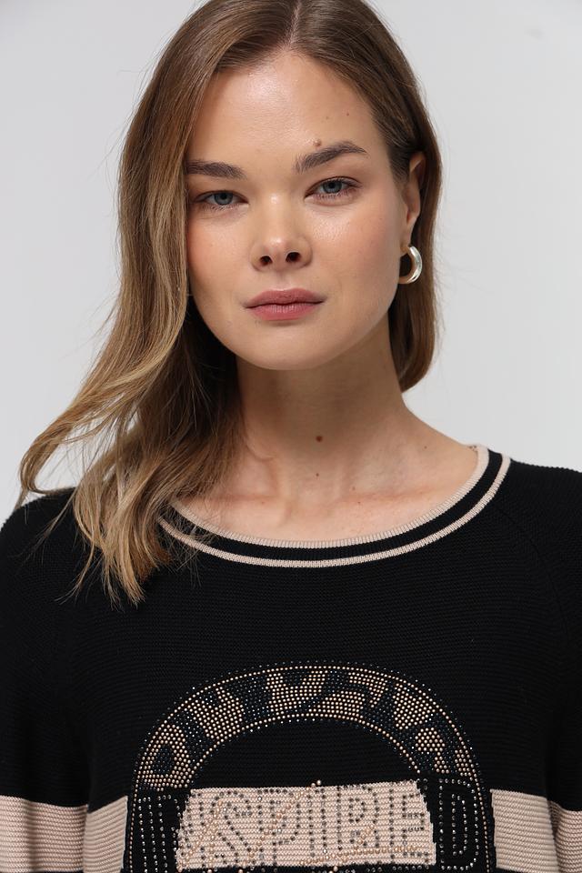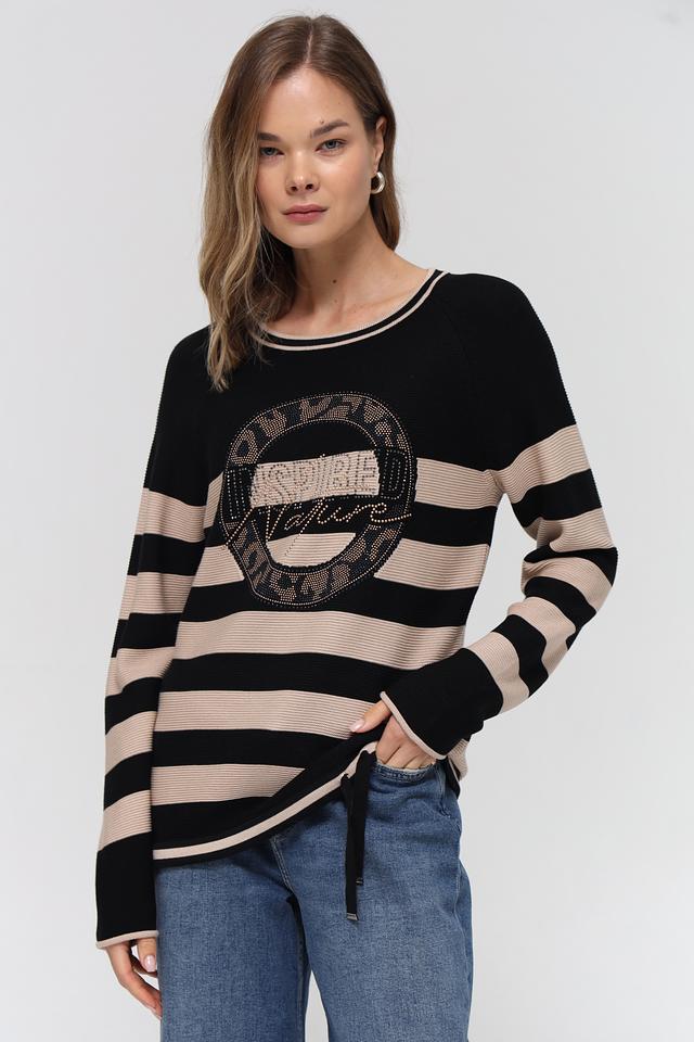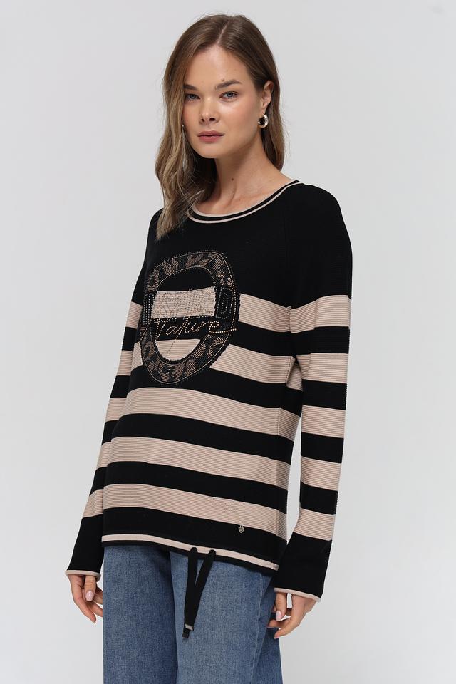 Основной цвет изделия – чёрный, дополнен бежевыми полосами, создающими эффектный контраст. Передняя часть пуловера украшена крупной декоративной аппликацией с блестящими элементами, придающей изделию изысканность.