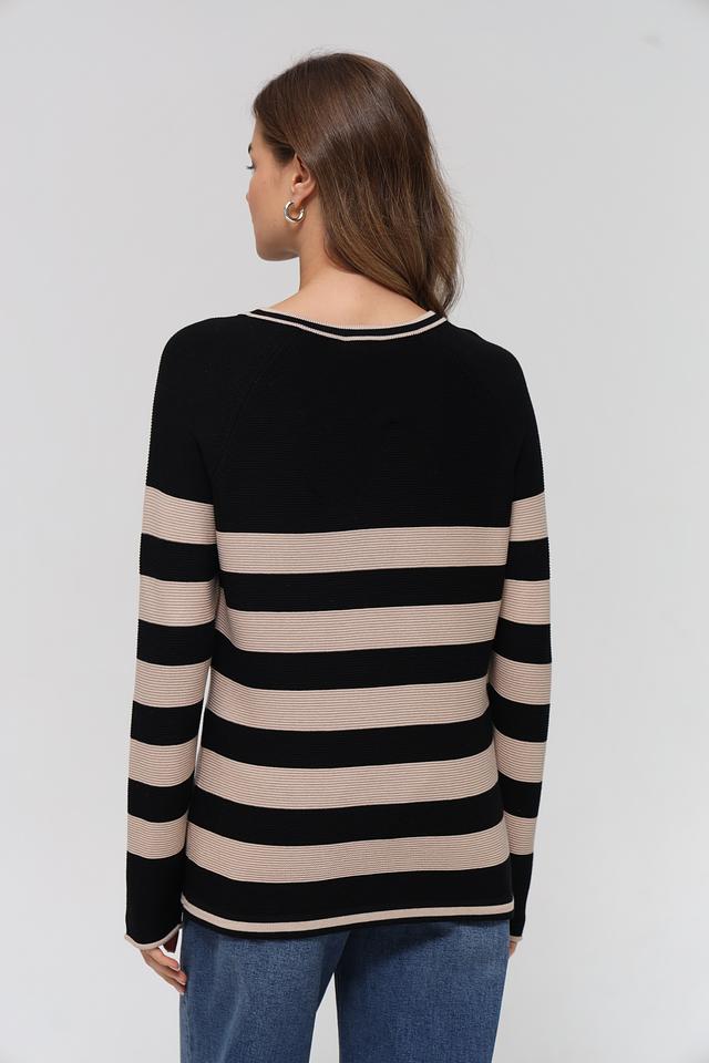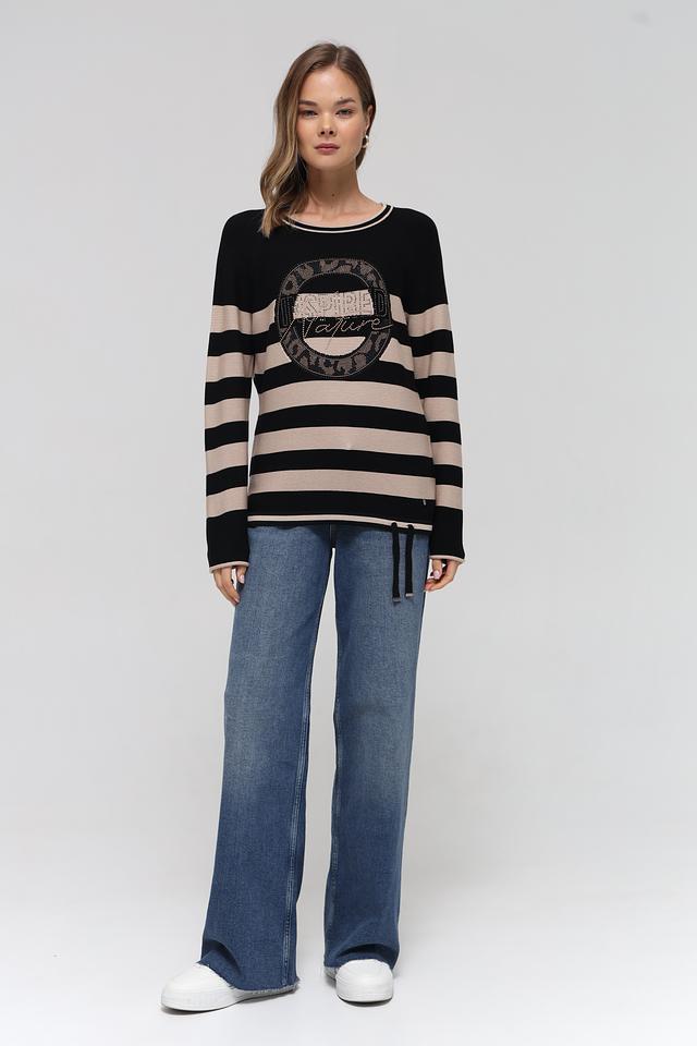 Женский пуловер Rabe collection чёрно-бежевого цвета с полосатым узором и декоративной аппликацией. Изготовлен из мягкого сочетания хлопка и полиакрила, обеспечивающего комфорт и удобство в носке. Состав: хлопок 50%, полиакрил 50%
