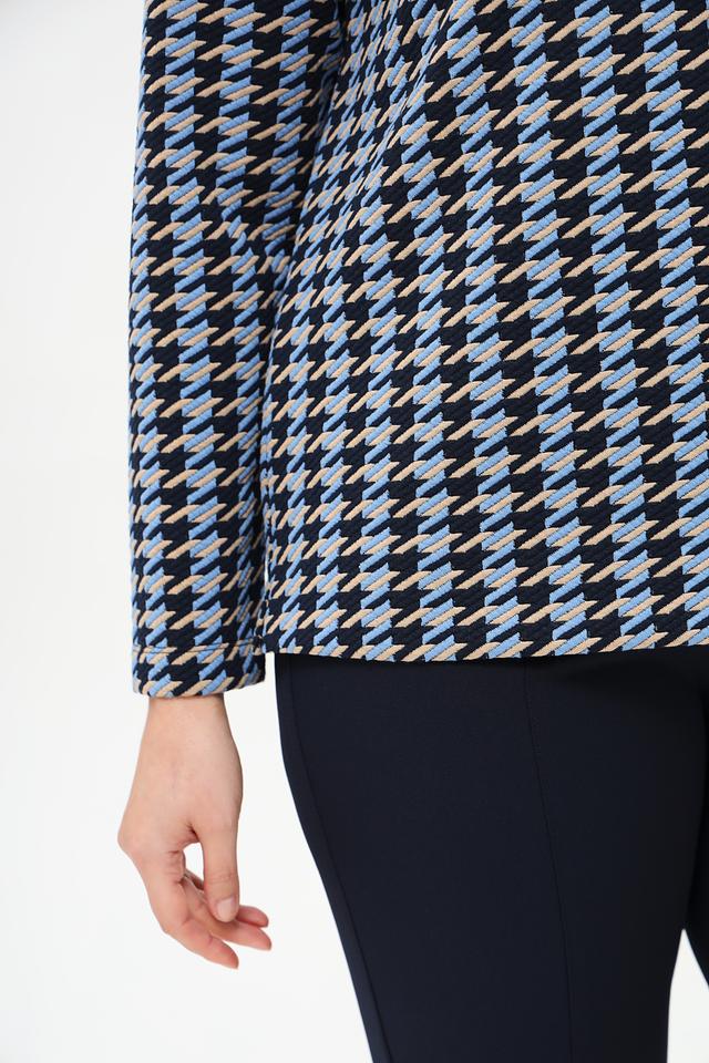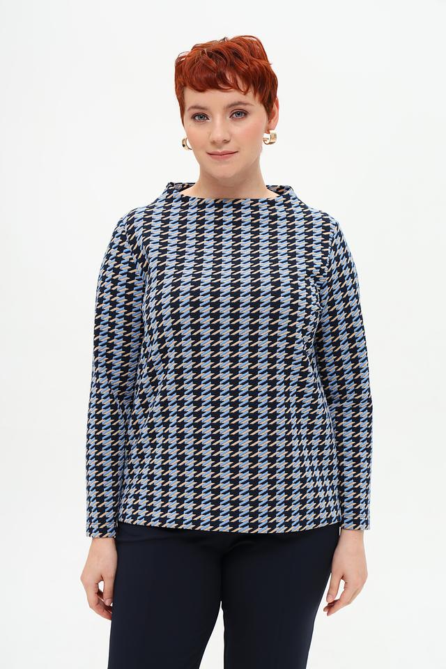 Женский пуловер Rabe collection голубого и тёмно-синего цвета с геометрическим принтом. Модель выполнена из мягкого и приятного к телу трикотажа, имеет округлый вырез горловины и длинные рукава. Состав: полиэстер 70%, вискоза 28%, эластан 2%