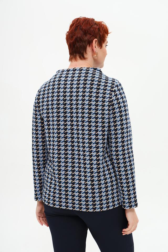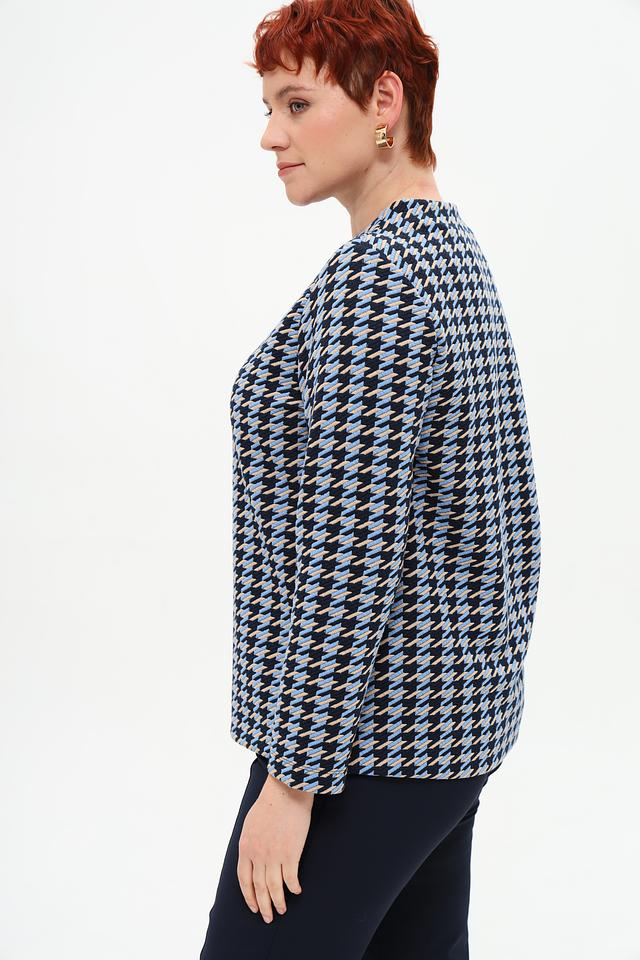 Пуловер имеет классический крой с длинными рукавами и округлым вырезом горловины. Его особенностью является яркий геометрический принт в голубых и тёмно-синих тонах, который придаёт образу свежесть и оригинальность.