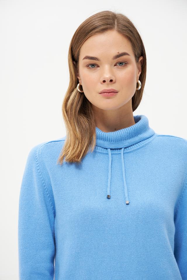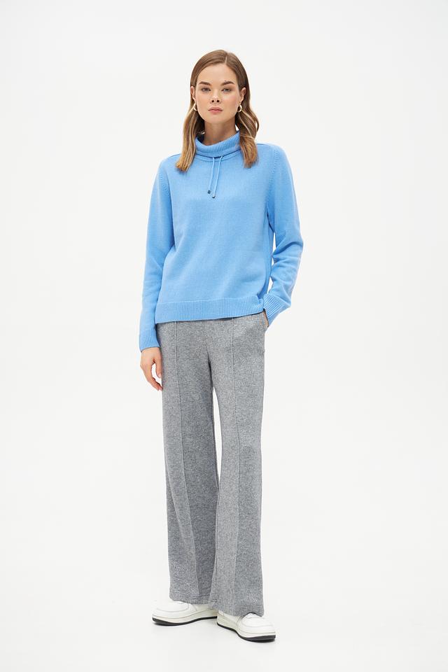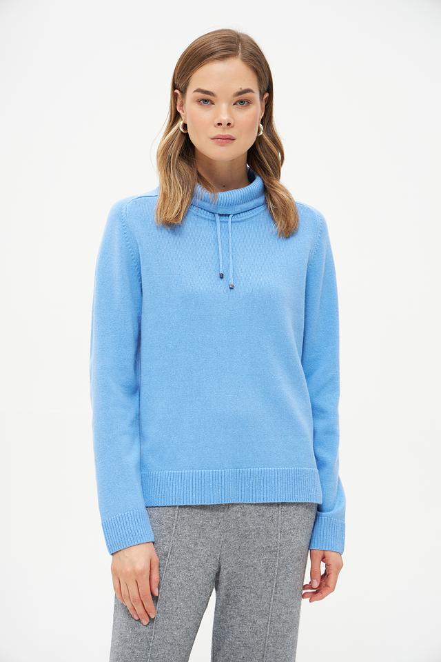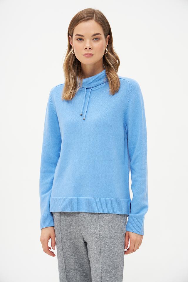 Голубой пуловер от Rabe collection из мягкой смеси шерсти, полиамида и модала. Модель с воротником-стойкой и декоративными шнурками. Идеальный выбор для создания уютного и стильного образа. Состав: шерсть 50%, полиамид 30%, модал 20%