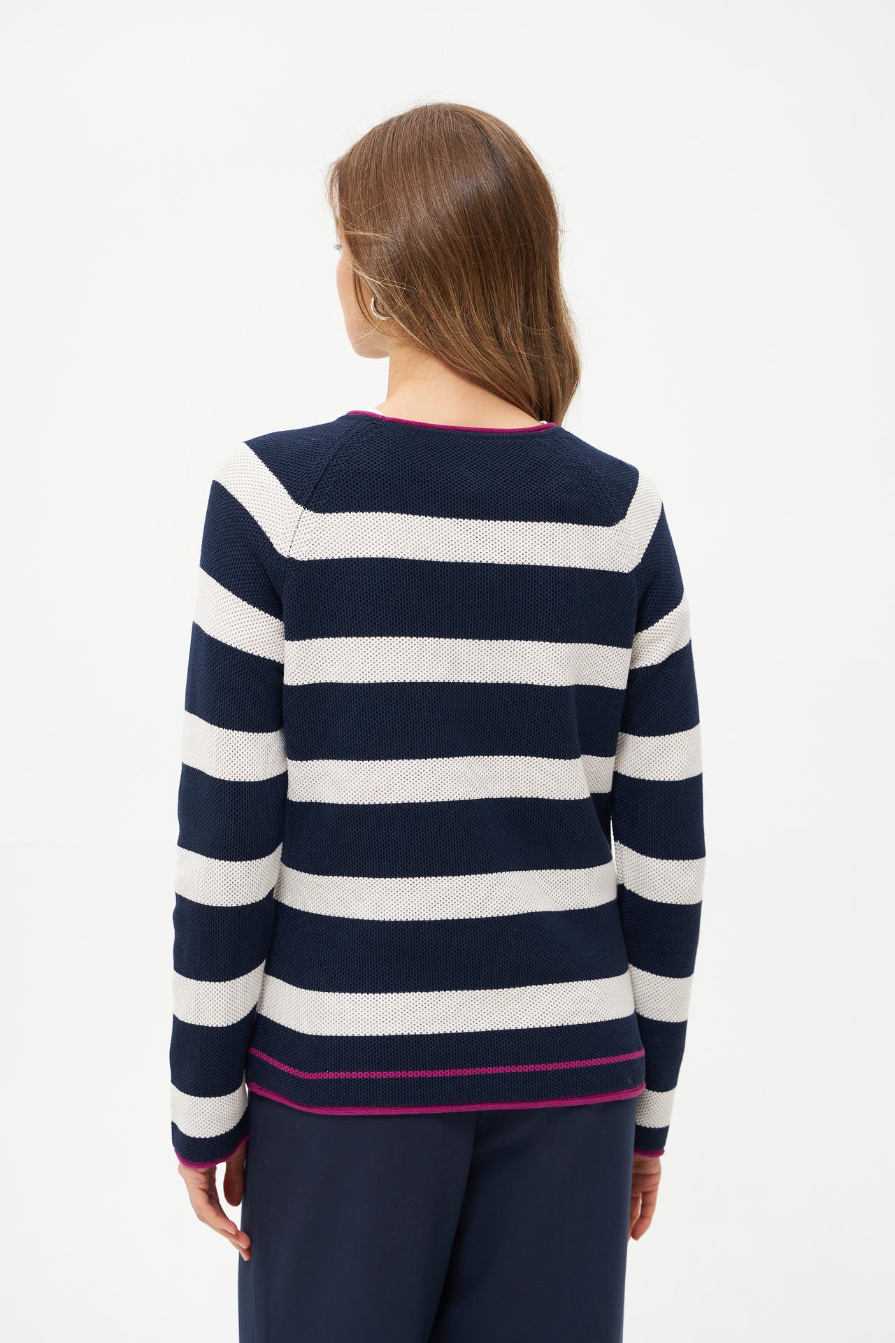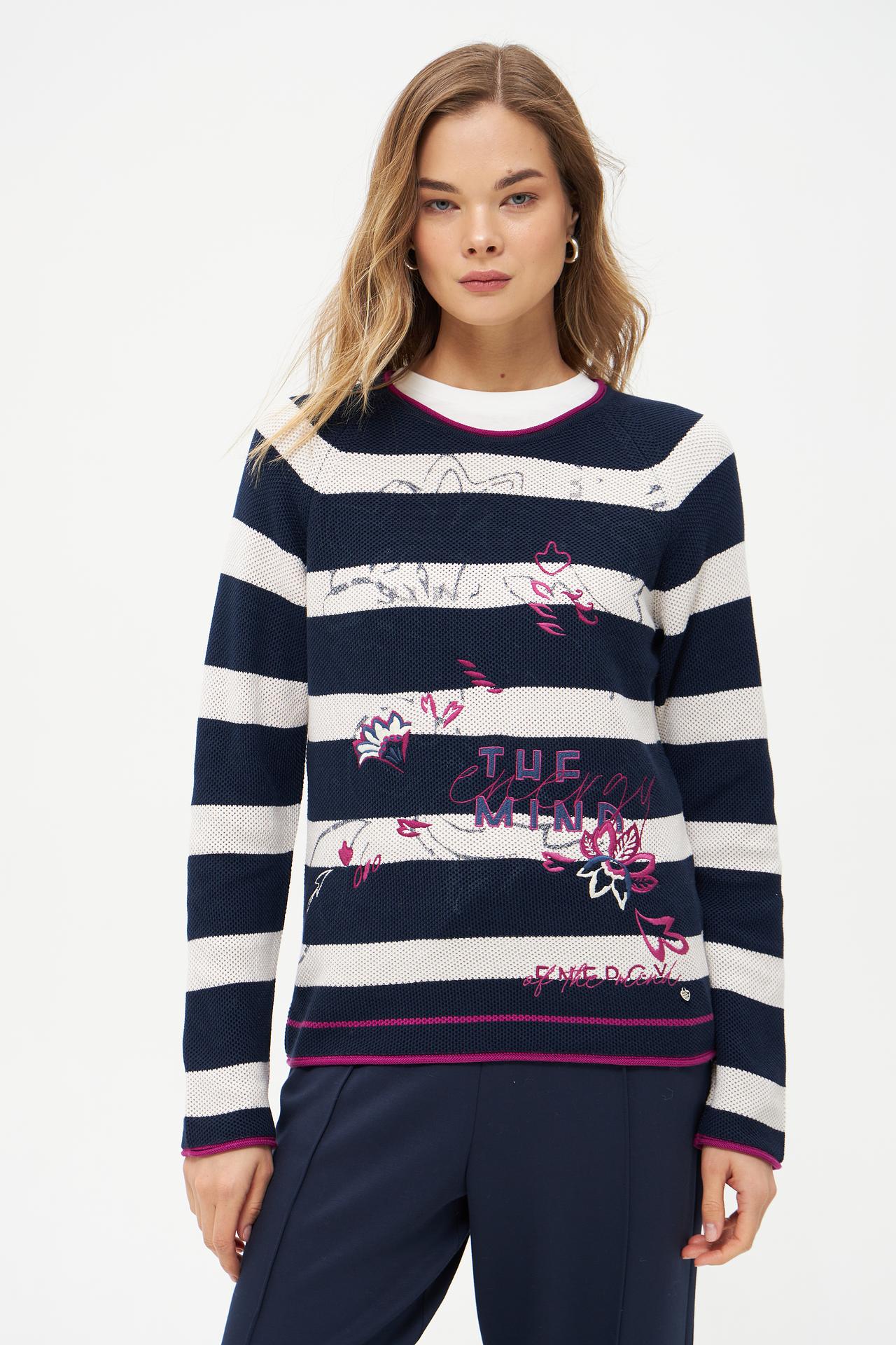 Этот стильный женский пуловер Rabe collection станет прекрасным дополнением к вашему гардеробу. Выполненный из мягкого и приятного к телу материала (50% хлопок, 50% полиакрил), он обеспечит комфорт в течение всего дня. Изделие отличается оригинальным дизайном в полоску и украшено принтом, добавляющим образу индивидуальности. Пуловер идеально подходит для создания модных и непринужденных образов в стиле casual.