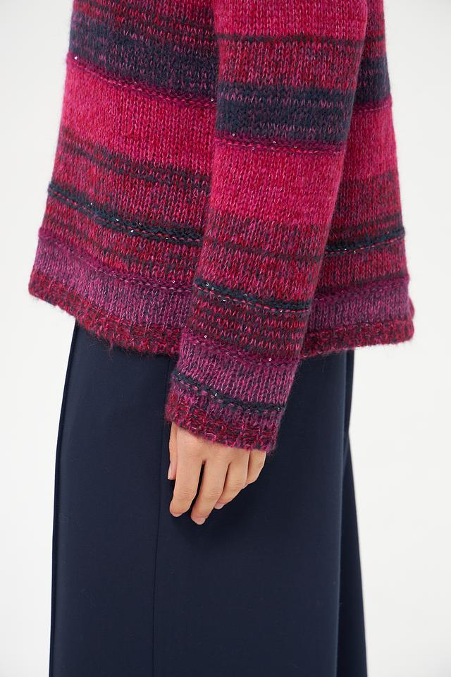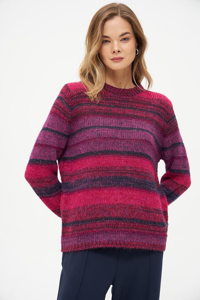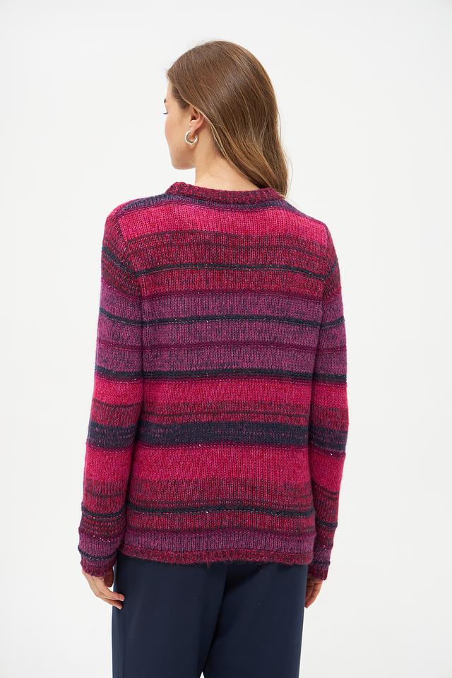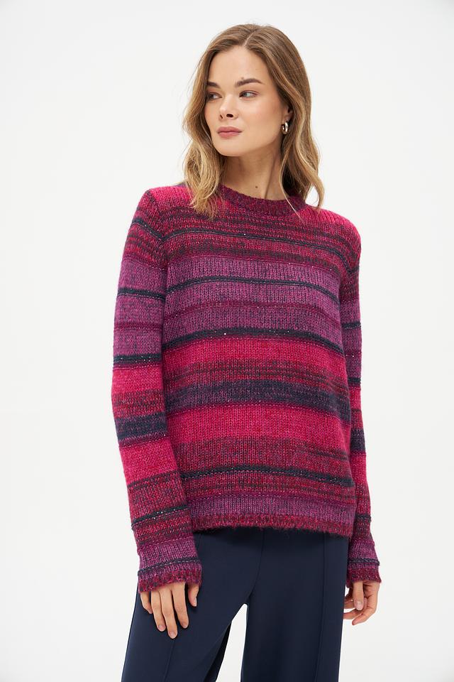 Этот стильный пуловер от Rabe collection выполнен в яркой цветовой гамме с полосатым узором. Преобладающий цвет – фуксия, который разбавлен более темными оттенками, создавая интересный визуальный эффект.