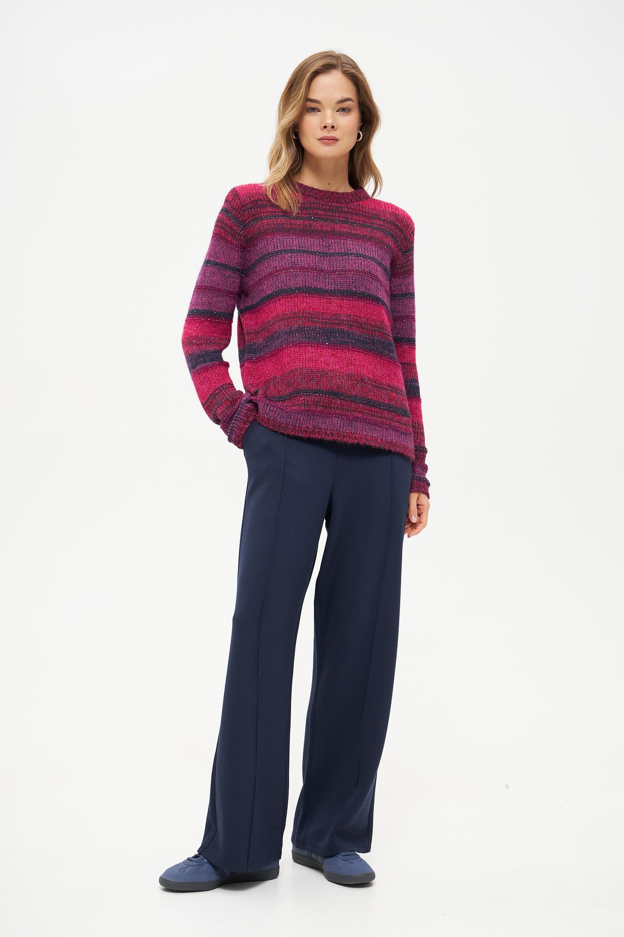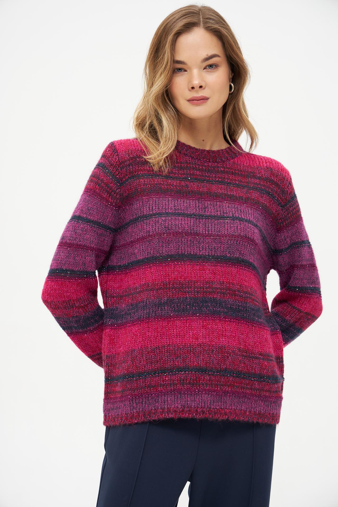 - Стильный дизайн: Модный полосатый узор с переходом оттенков розового, бордового, фиолетового и синего, дополненный легкими блестящими вкраплениями, создает динамичный и выразительный образ. Пуловер идеально подходит для создания ярких акцентов в повседневном и элегантном стиле.