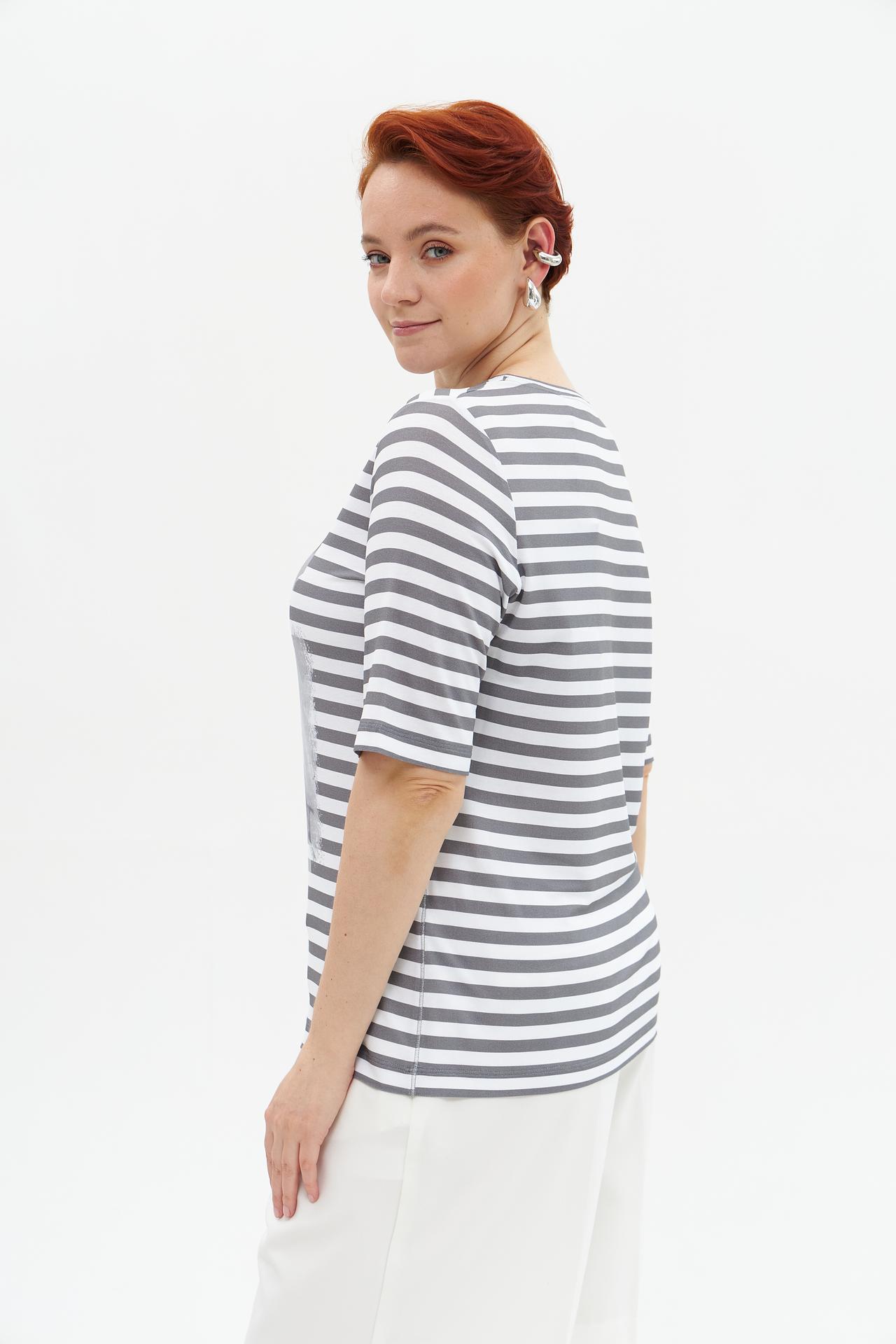 - Дизайн: Классический крой с коротким рукавом и круглым вырезом горловины. Горизонтальная полоска в серых и белых тонах дополнена стильным черно-белым принтом на груди, который придает футболке индивидуальность.