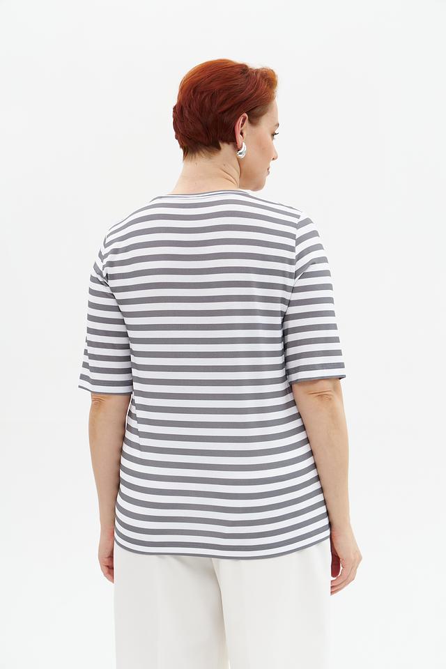 Женская футболка от бренда Rabe collection выполнена в серо-белую полоску. Модель имеет прямой, слегка свободный крой, который обеспечивает комфортную посадку по фигуре.
