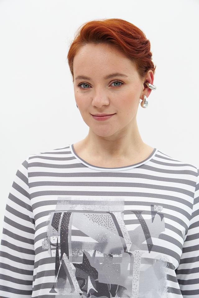 Женская футболка Rabe collection серого цвета с горизонтальной полоской и графичным принтом. Изготовлена из мягкой вискозы с добавлением эластана для комфорта и свободы движений. Идеальный выбор для создания стильного повседневного образа. Состав: вискоза 96%, эластан 4%