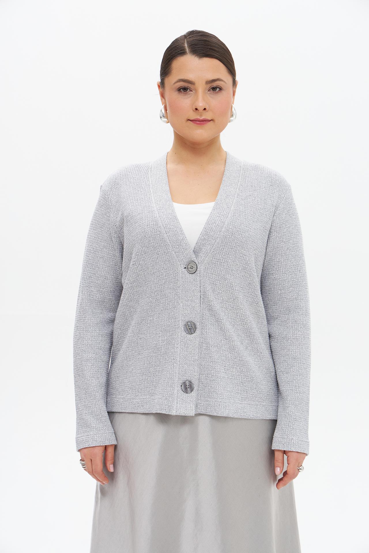 - Дизайн: Классический крой с V-образным вырезом и застежкой на пуговицы. Жакет подходит для различных случаев, от офиса до неформальных встреч.