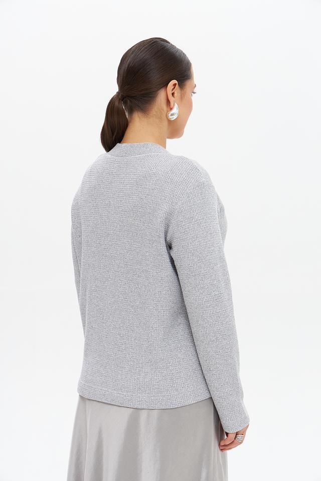 Жакет застегивается на четыре пуговицы, что позволяет регулировать степень прилегания. Длинные рукава делают его подходящим для прохладной погоды. Текстура ткани – мелкая вязка, придающая изделию аккуратный и элегантный вид.