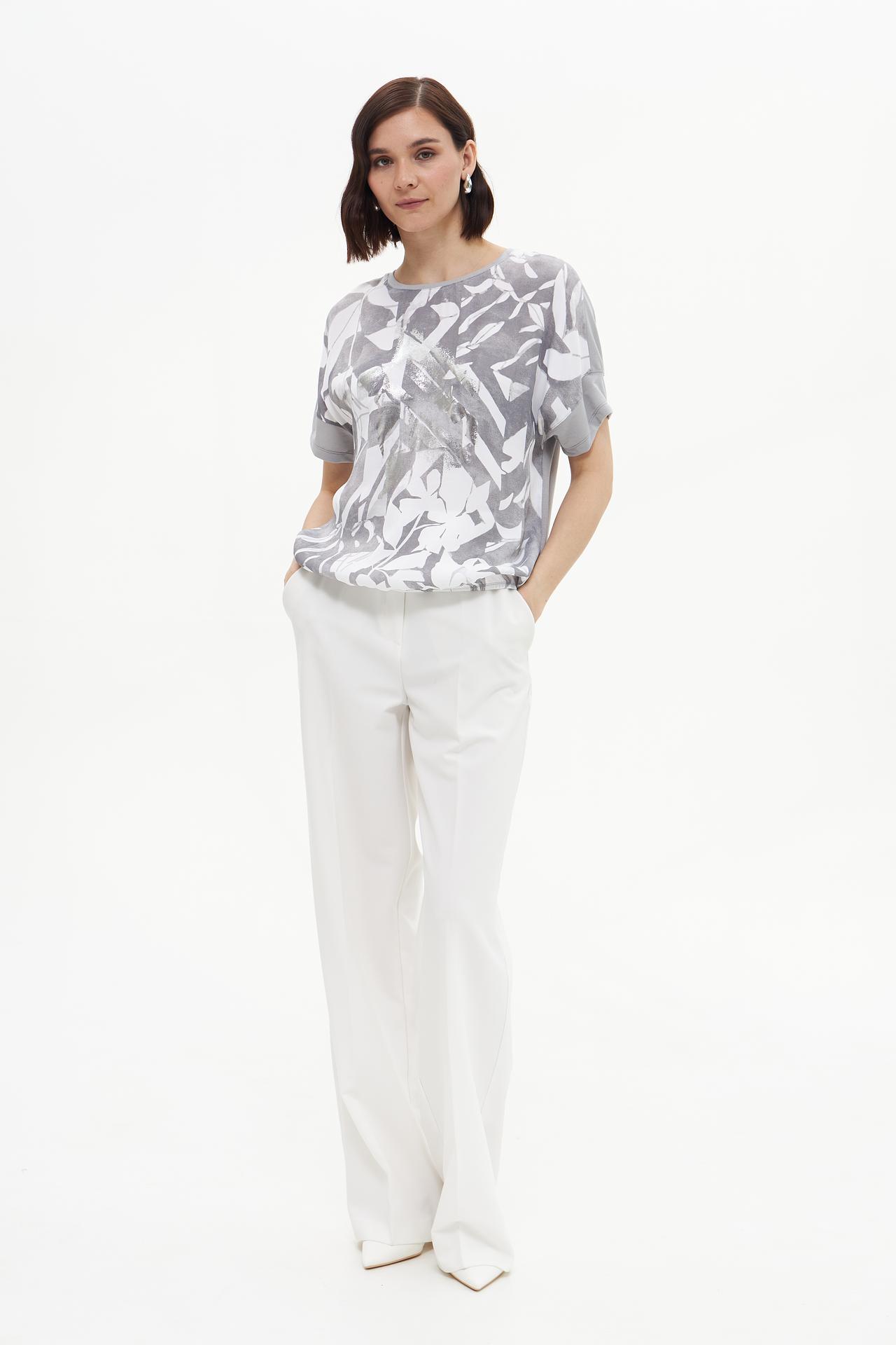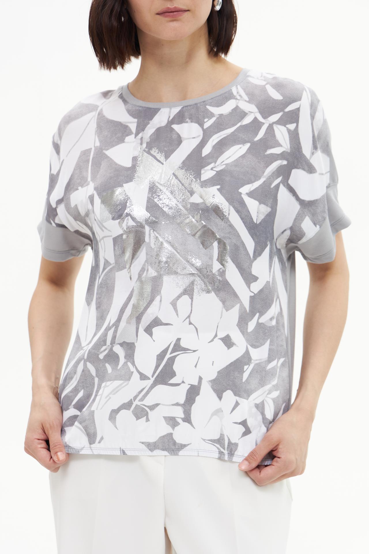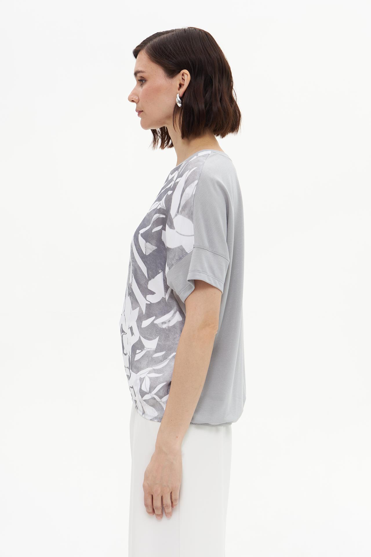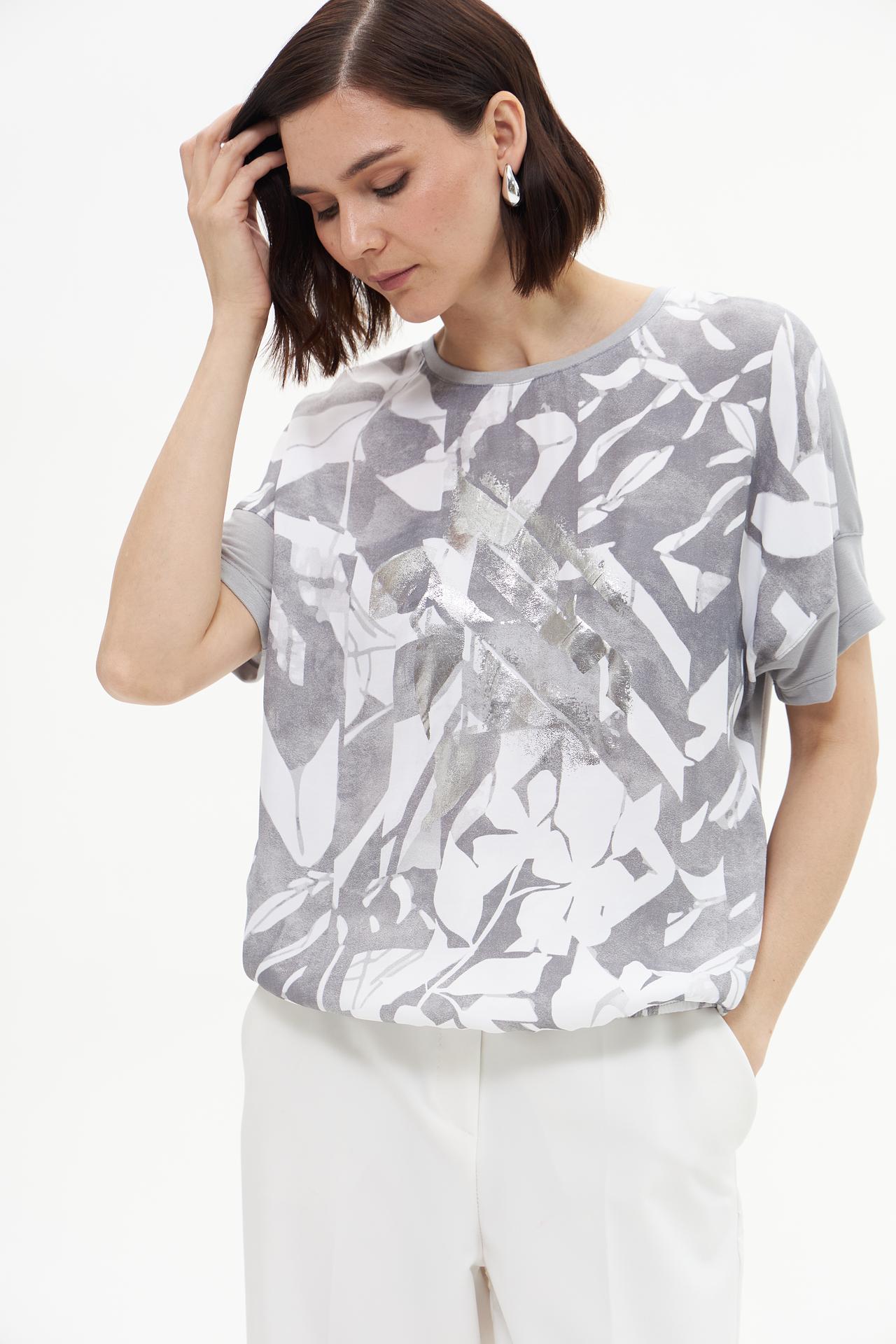 Стильная футболка Rabe collection станет незаменимой частью вашего гардероба. Оригинальный абстрактный принт в серо-белых тонах и серебристые акценты добавляют модели изысканности и современного шарма. Футболка прекрасно сочетается как с повседневными, так и с более элегантными образами.