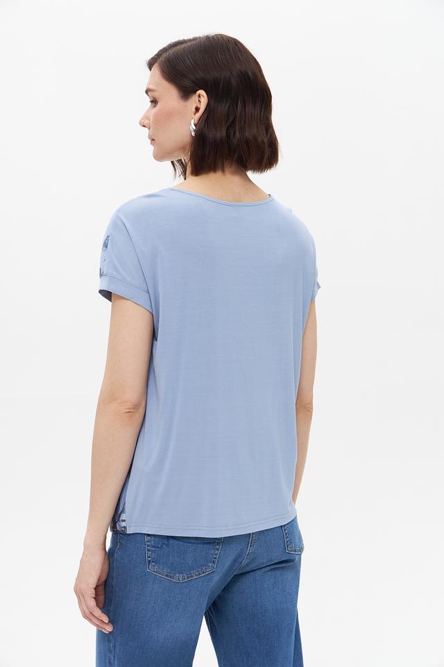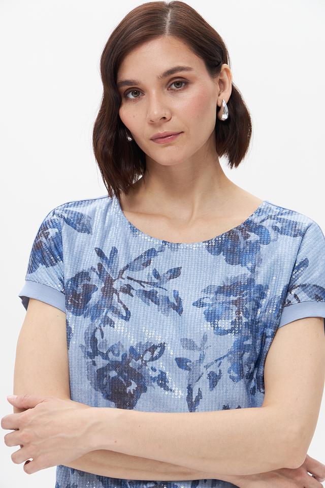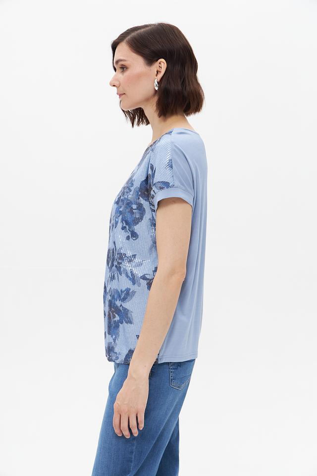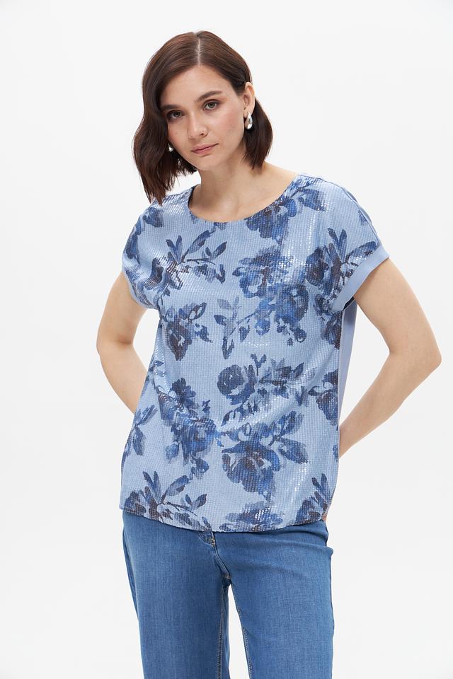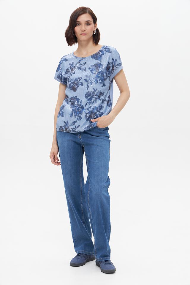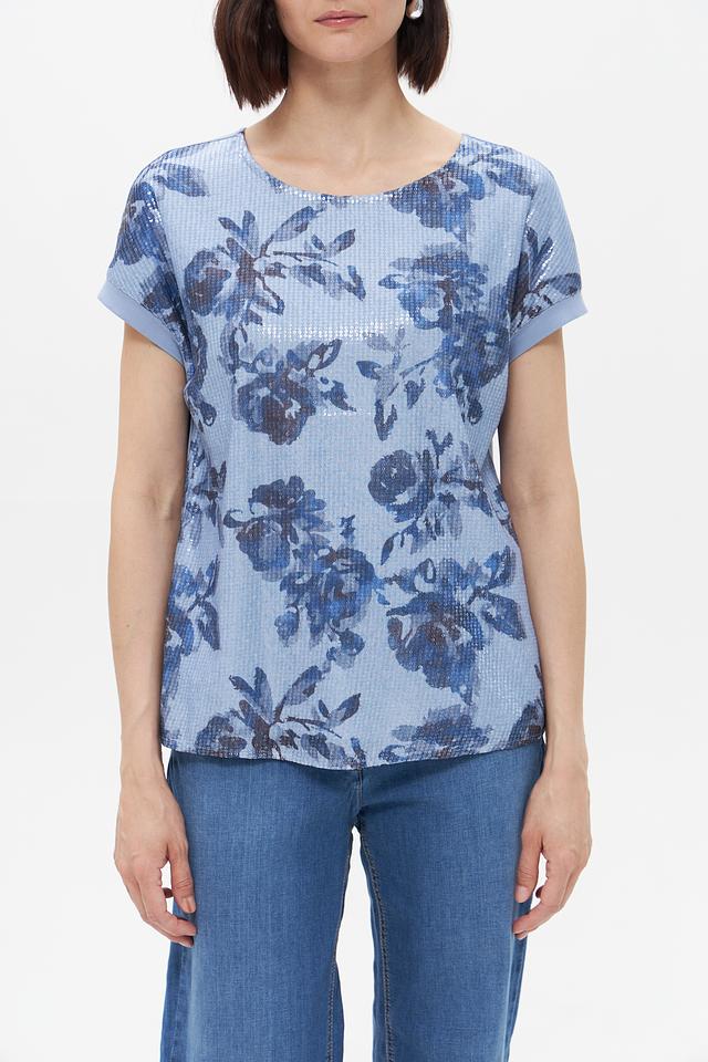Женская футболка Rabe collection голубого цвета с цветочным принтом. Изготовлена из мягкой вискозы с добавлением эластана для комфорта и лучшей посадки. Идеальный выбор для создания стильного повседневного образа. Состав: вискоза 95%, эластан 5%