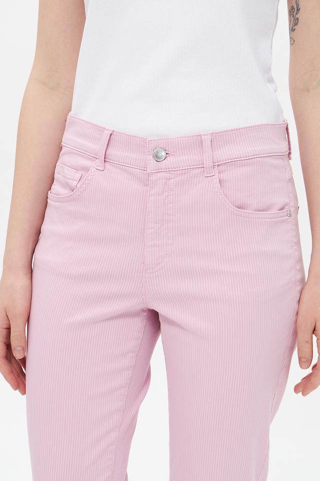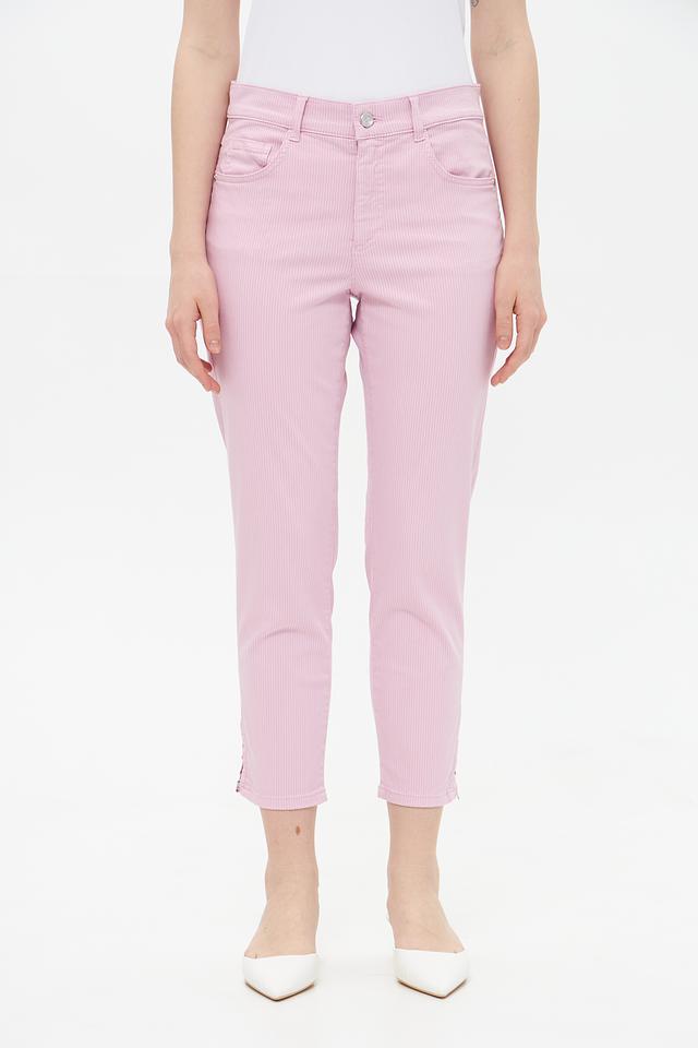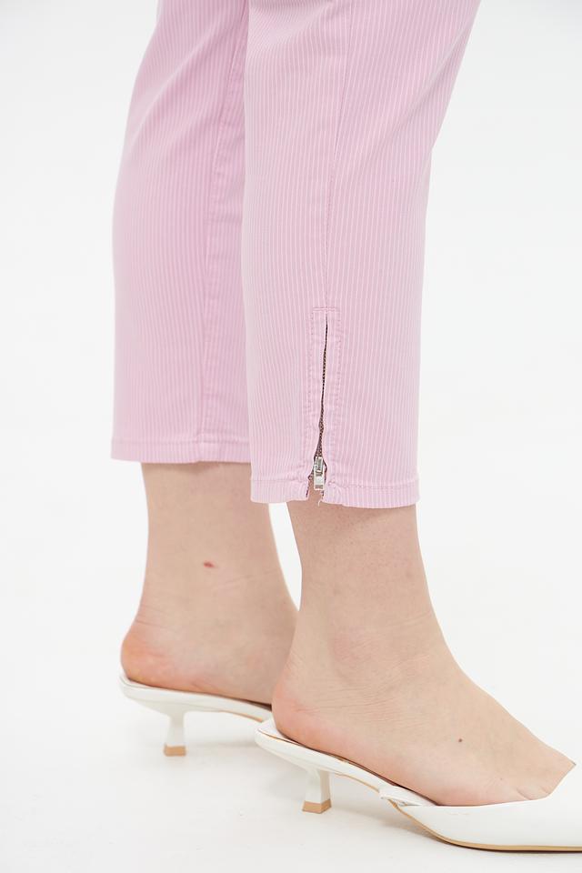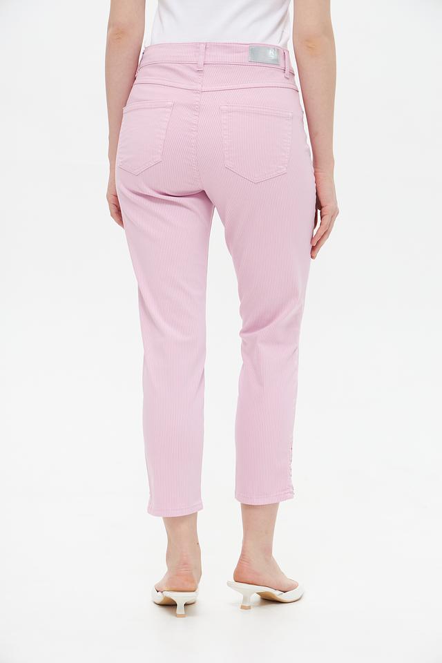 Женские джинсы Rabe collection нежного розового цвета с вертикальной полоской. Изготовлены из хлопка с добавлением полиэстера и эластана для комфорта и удобства. Модель с застежкой на молнию и пуговицу. Состав: хлопок 74%, полиэстер 23%, эластан 3%