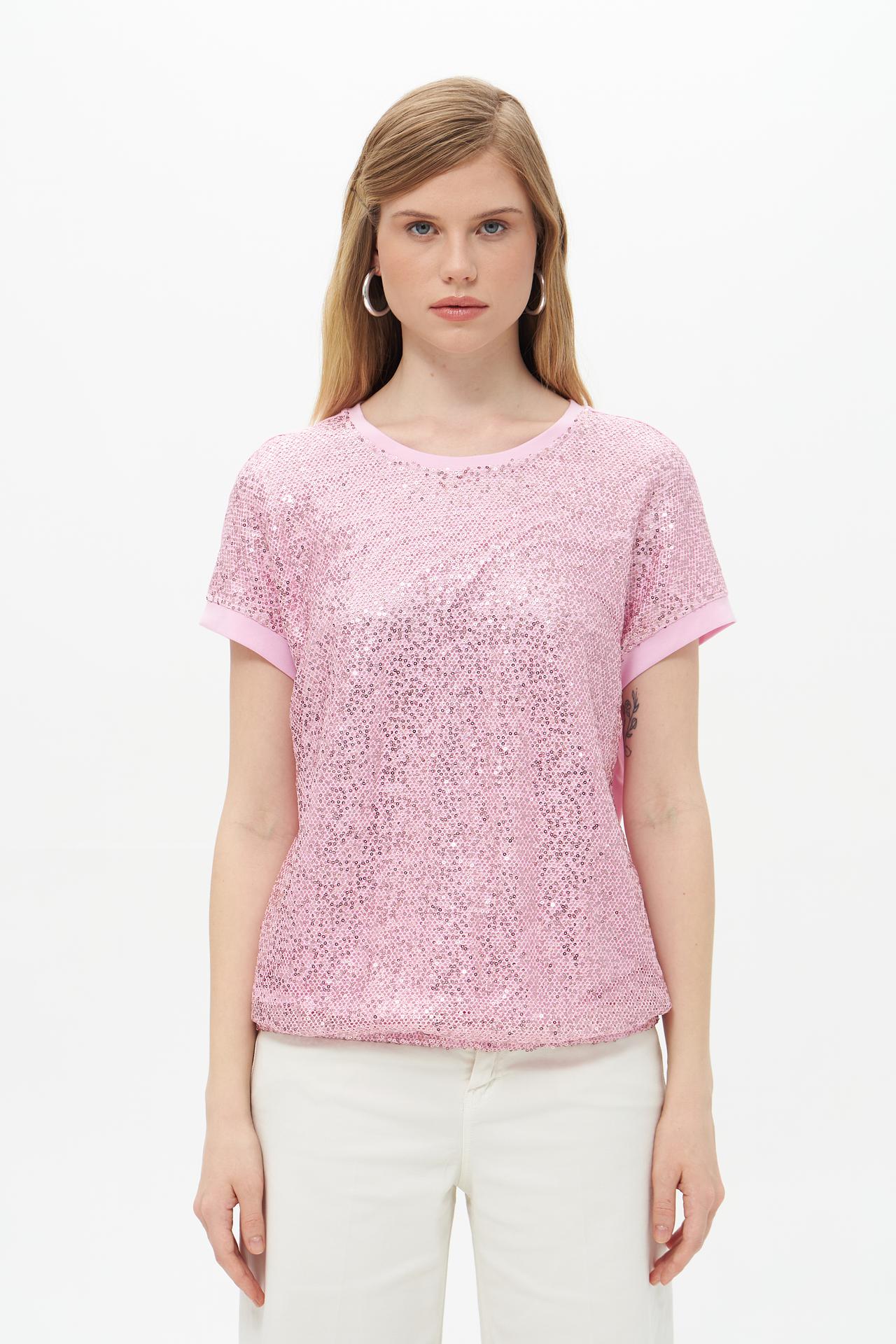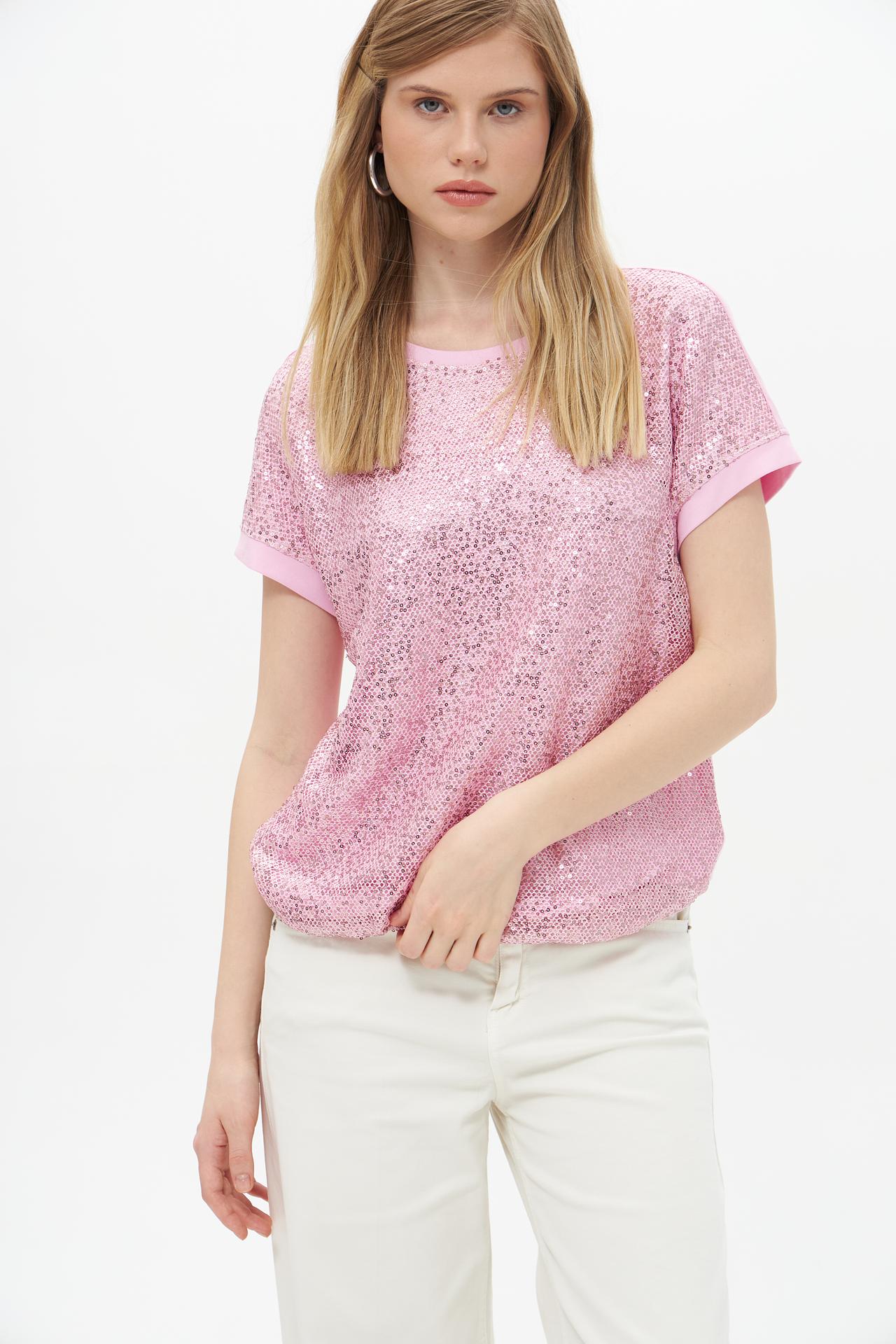 - Элегантный дизайн: Пайетки придают футболке нарядный и изысканный вид.