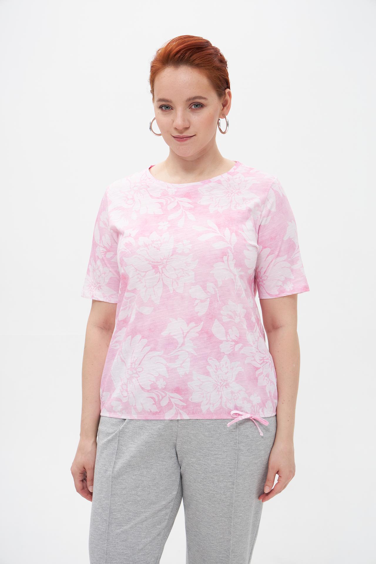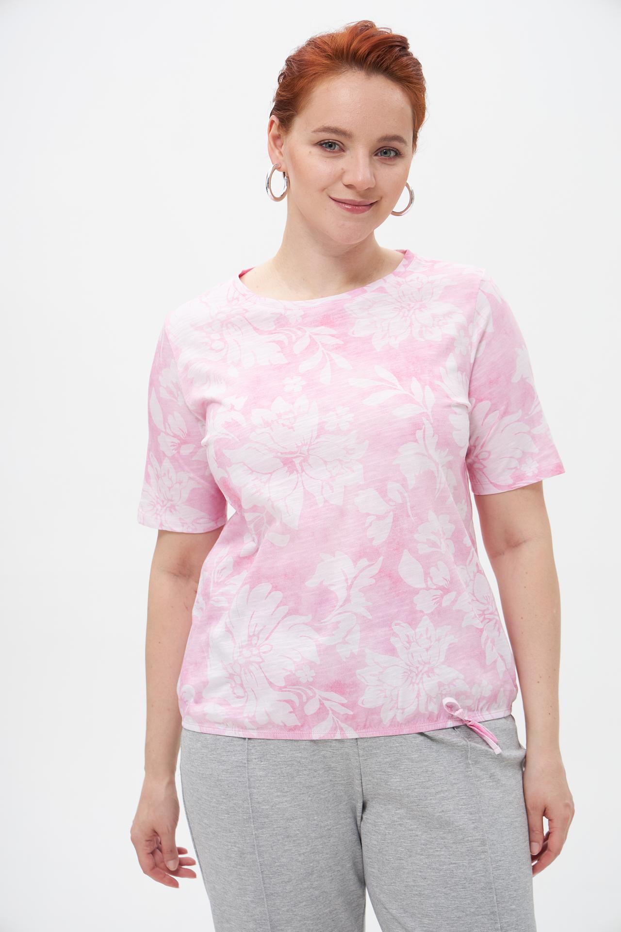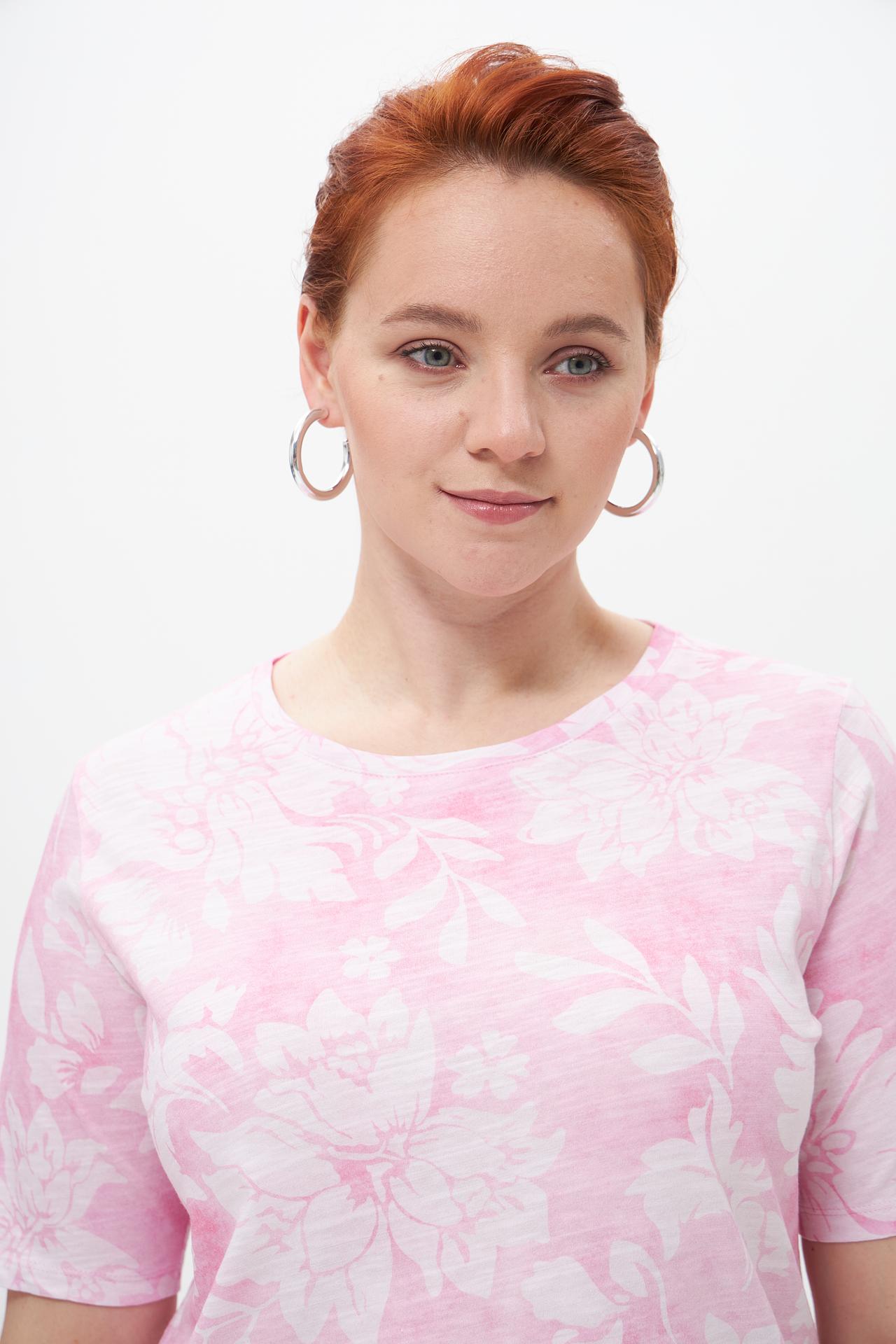 Привлекательный розовый цвет футболки дополнен изысканным белым цветочным принтом, создающим нежный и женственный образ. Дизайн универсален и легко сочетается с различными элементами гардероба, от джинсов до классических брюк. Круглый вырез горловины и короткий рукав подчеркивают классический крой.