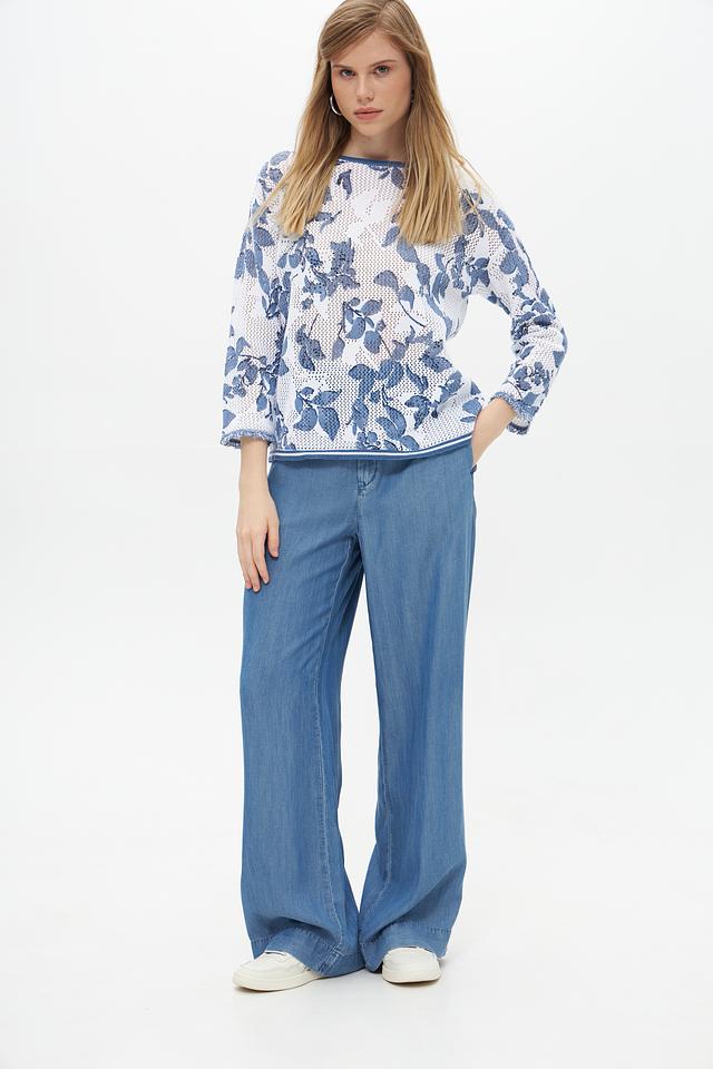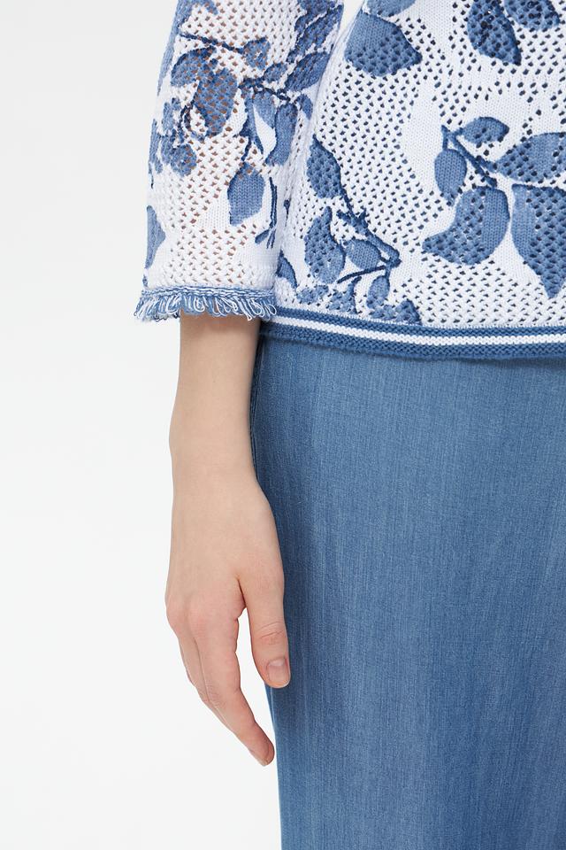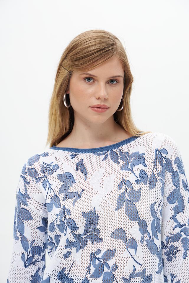Пуловер имеет лёгкий, воздушный дизайн благодаря ажурной вставке, которая придает ему изысканность. Цветочный принт в голубых тонах добавляет образу романтичности и свежести. Округлый вырез горловины и короткие рукава делают этот пуловер идеальным для тёплой погоды.