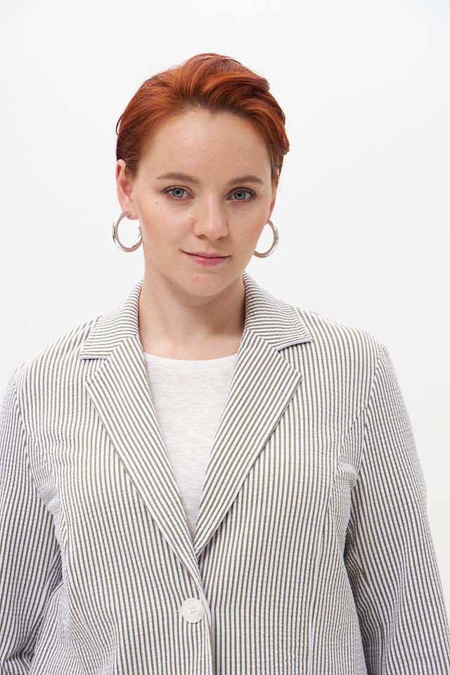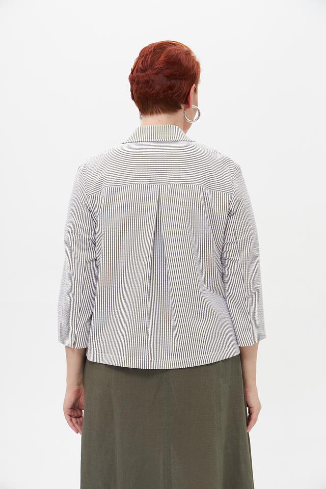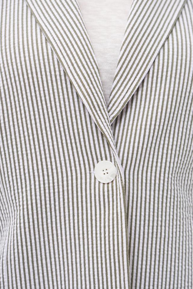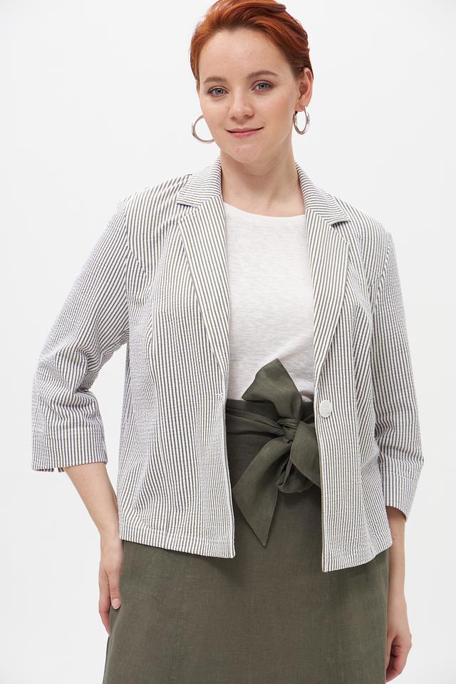 Этот жакет от Rabe collection станет отличным дополнением к вашему гардеробу. Модель выполнена в серой полоску, что делает ее универсальной и легко сочетаемой с различными вещами.
