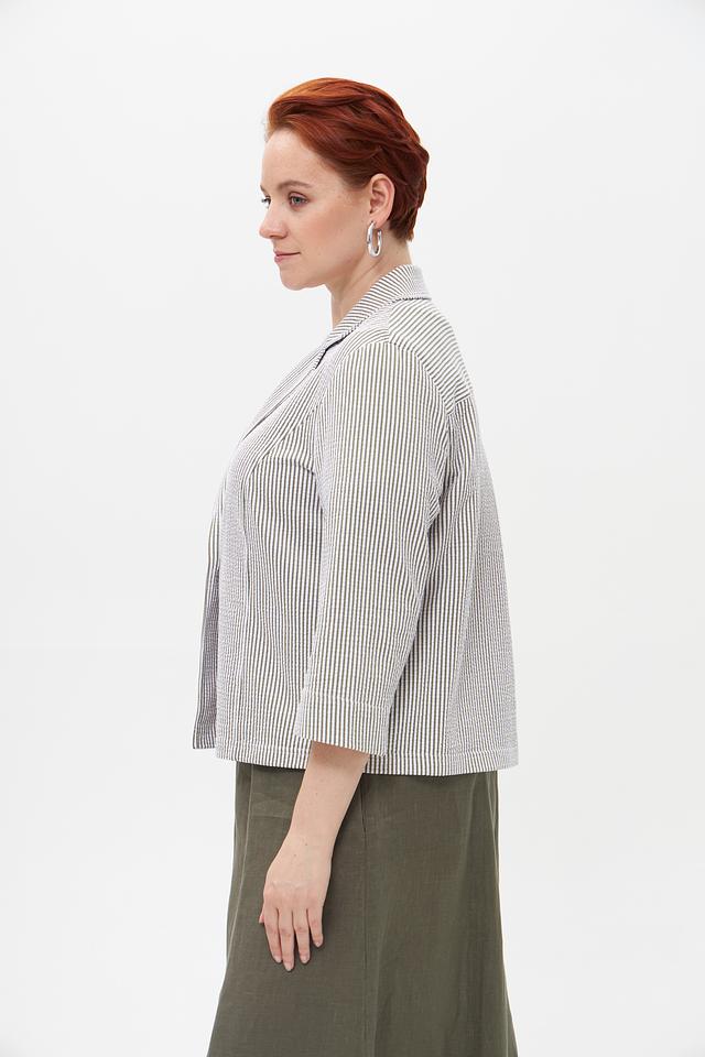 Жакет имеет классический крой с лацканами, застегивается на одну пуговицу. Укороченная длина и рукава ¾ придают образу современный и легкий вид. Состав ткани включает хлопок, полиэстер и эластан, что обеспечивает комфорт в носке, хорошую посадку и устойчивость к сминанию.