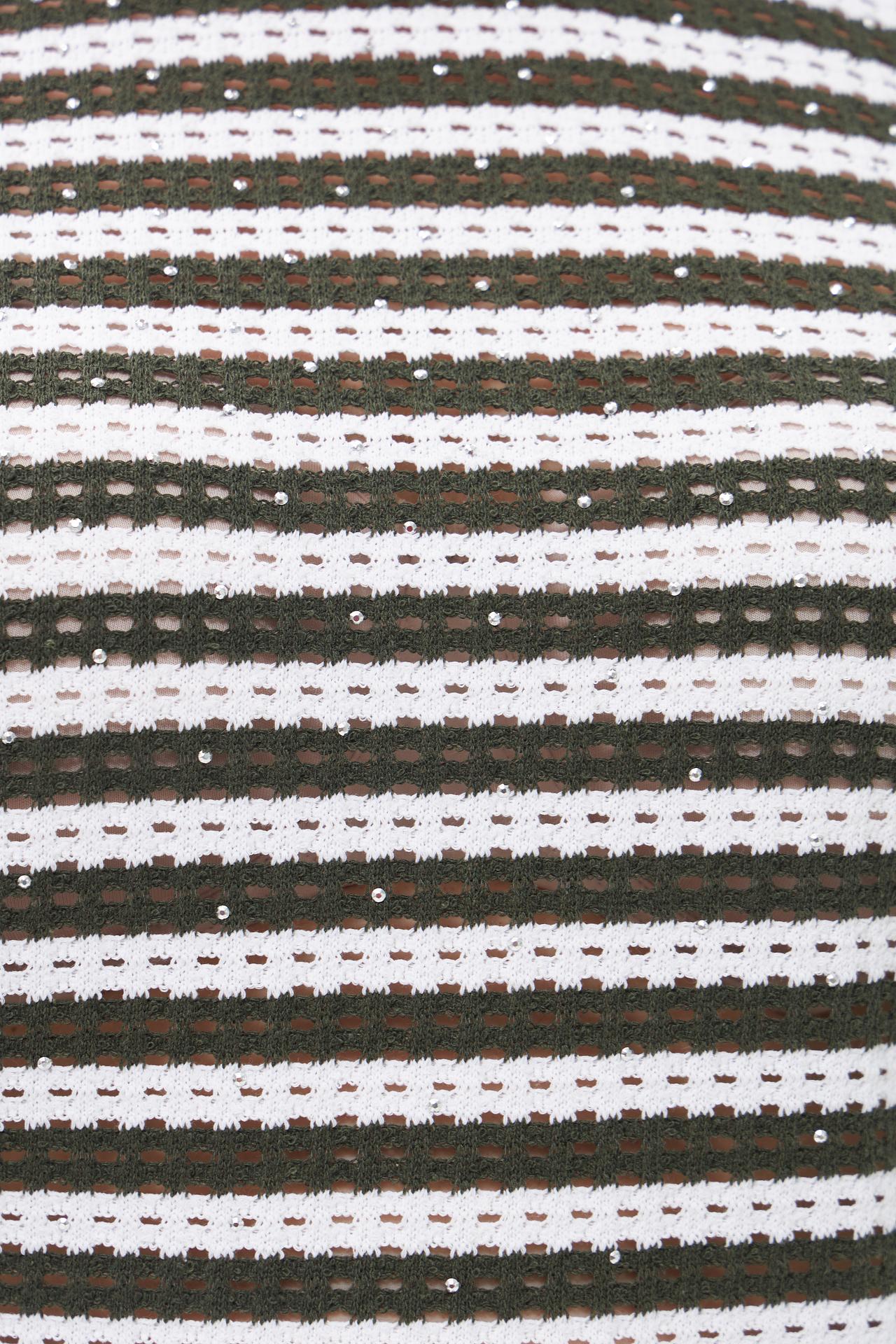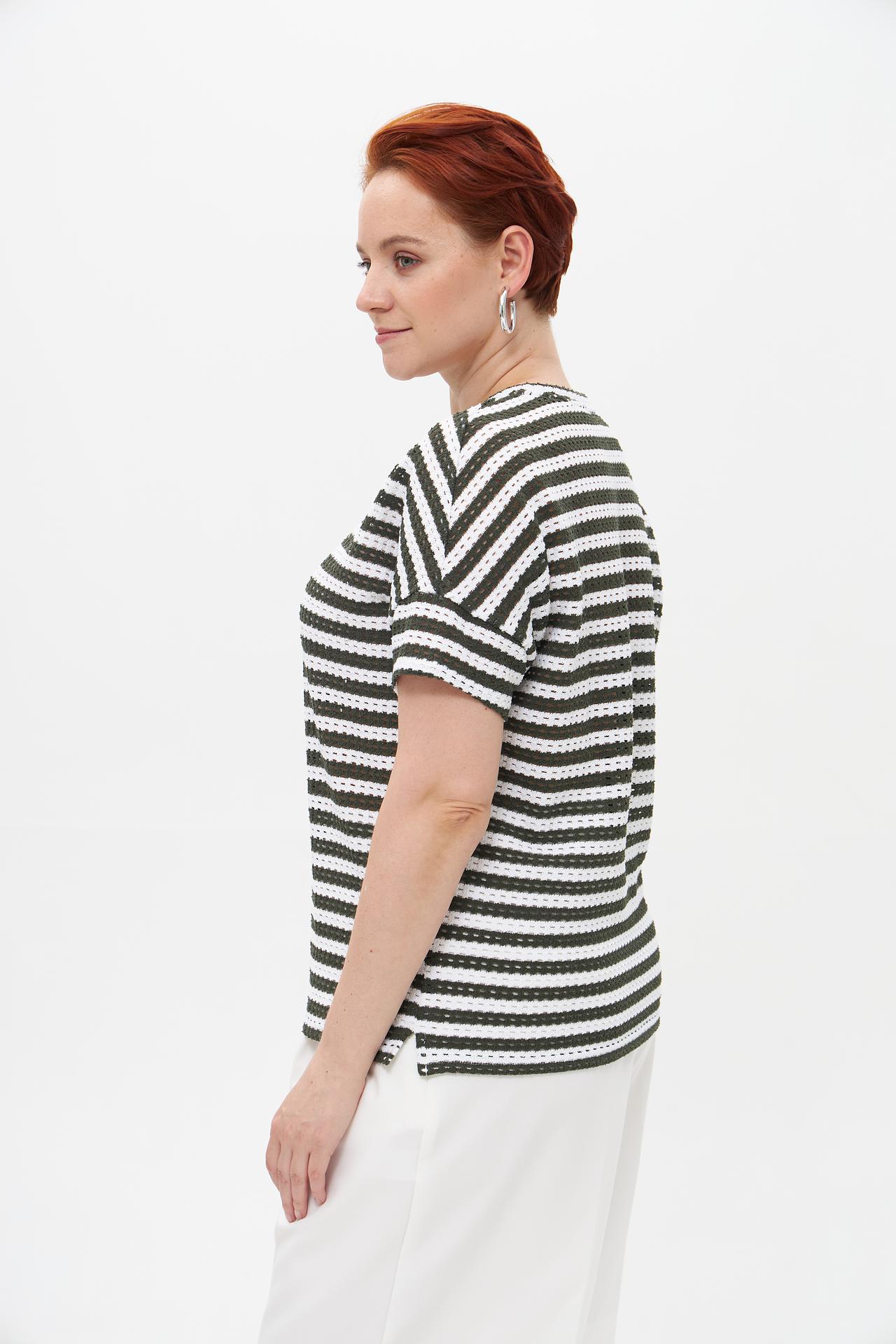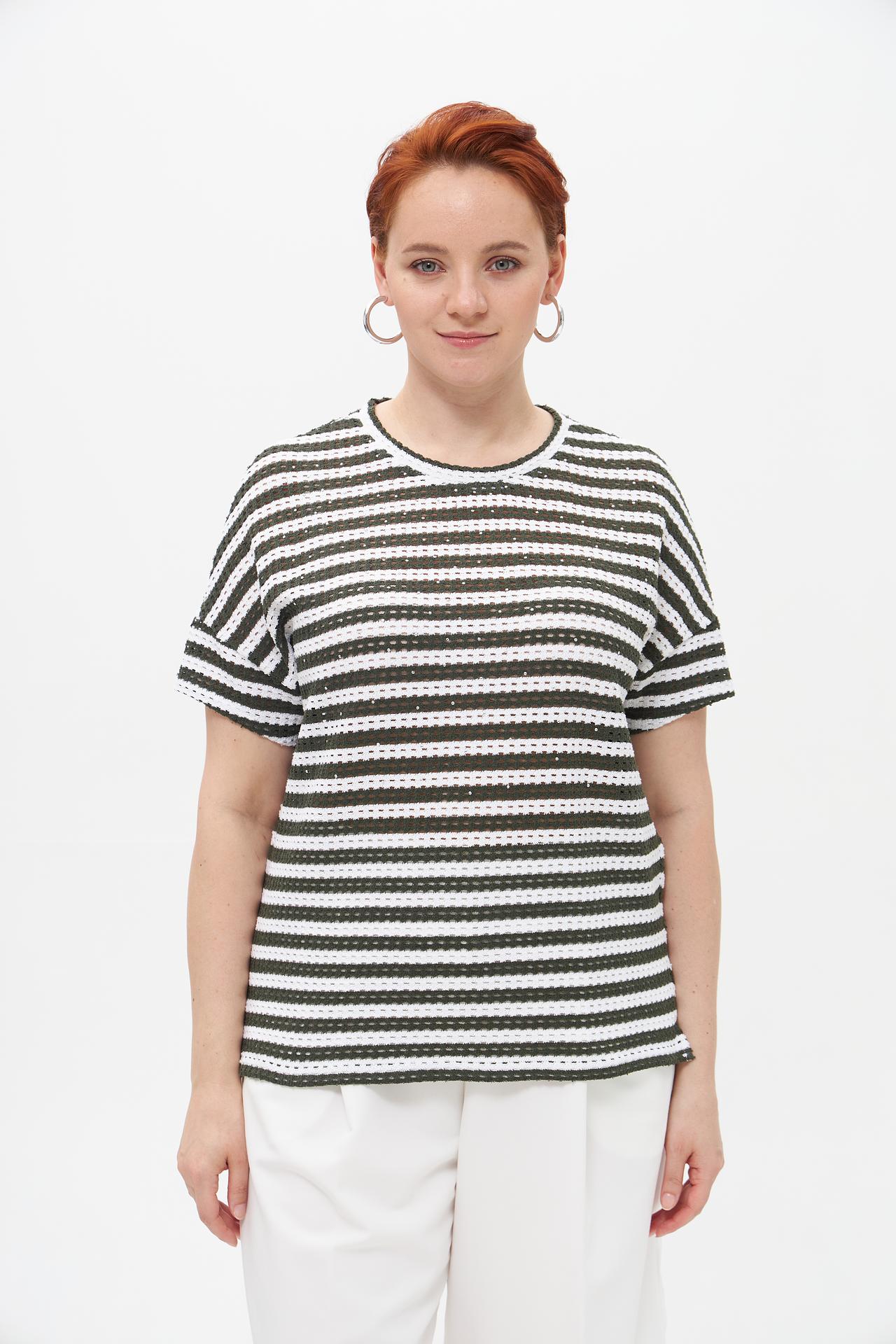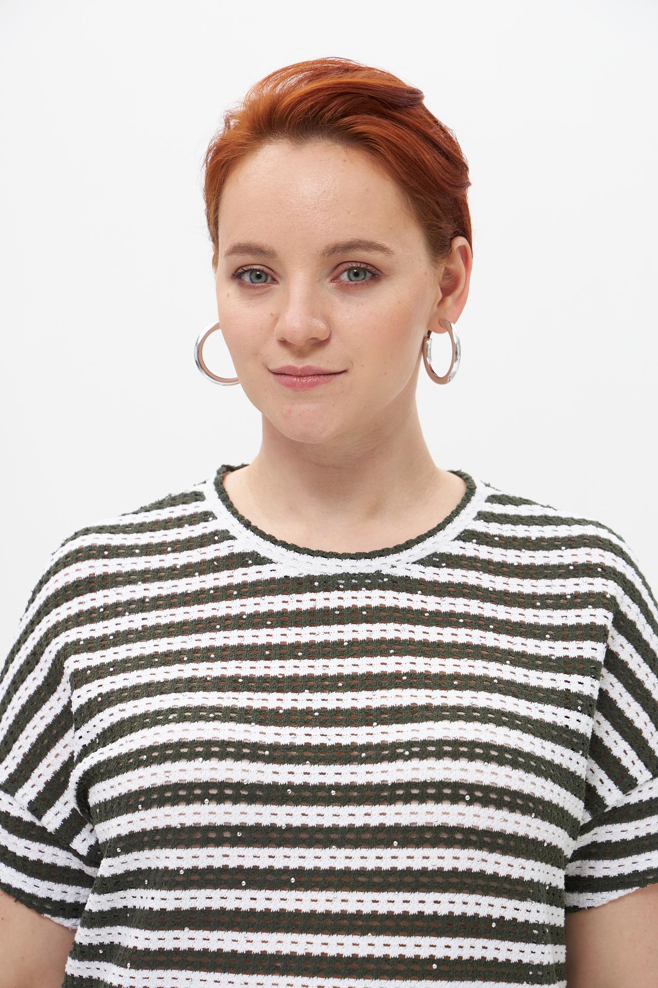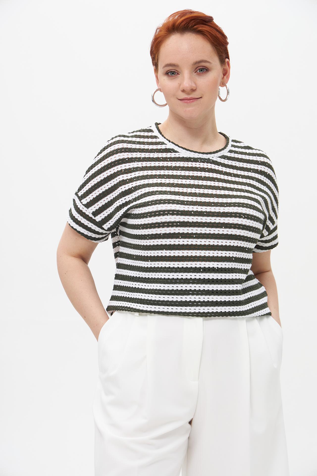 - Дизайн в полоску и мерцающие детали. Элегантный полосатый принт гармонично дополнен деликатными мерцающими элементами, которые придают футболке особый шарм и изысканность, делая ее стильной вещью для любого случая.