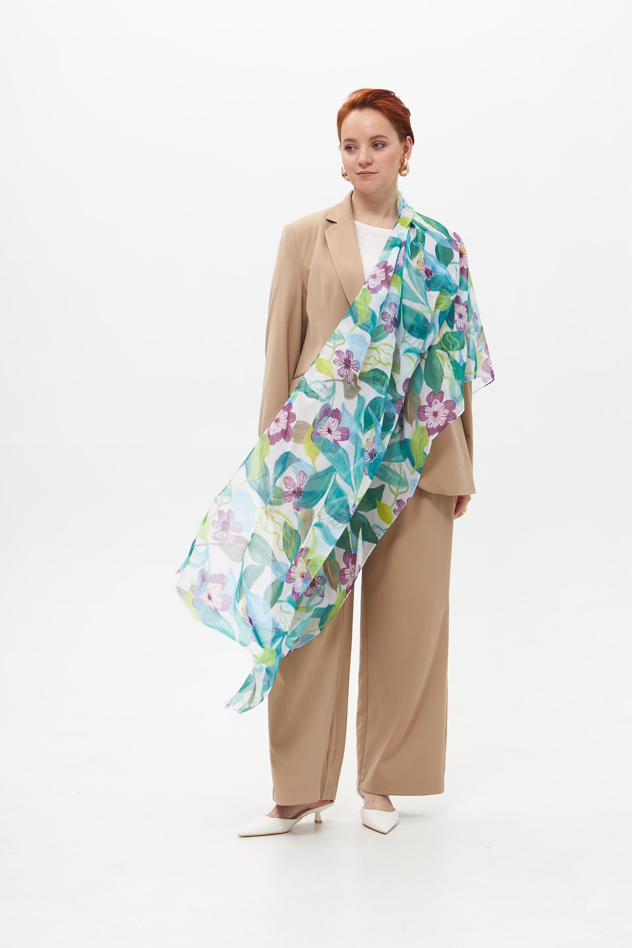 Этот шарф станет вашим надежным спутником в любое время года, защищая от легкого ветра и придавая образу завершенность. Шарф с цветочным принтом – это актуальный тренд, который всегда в моде.