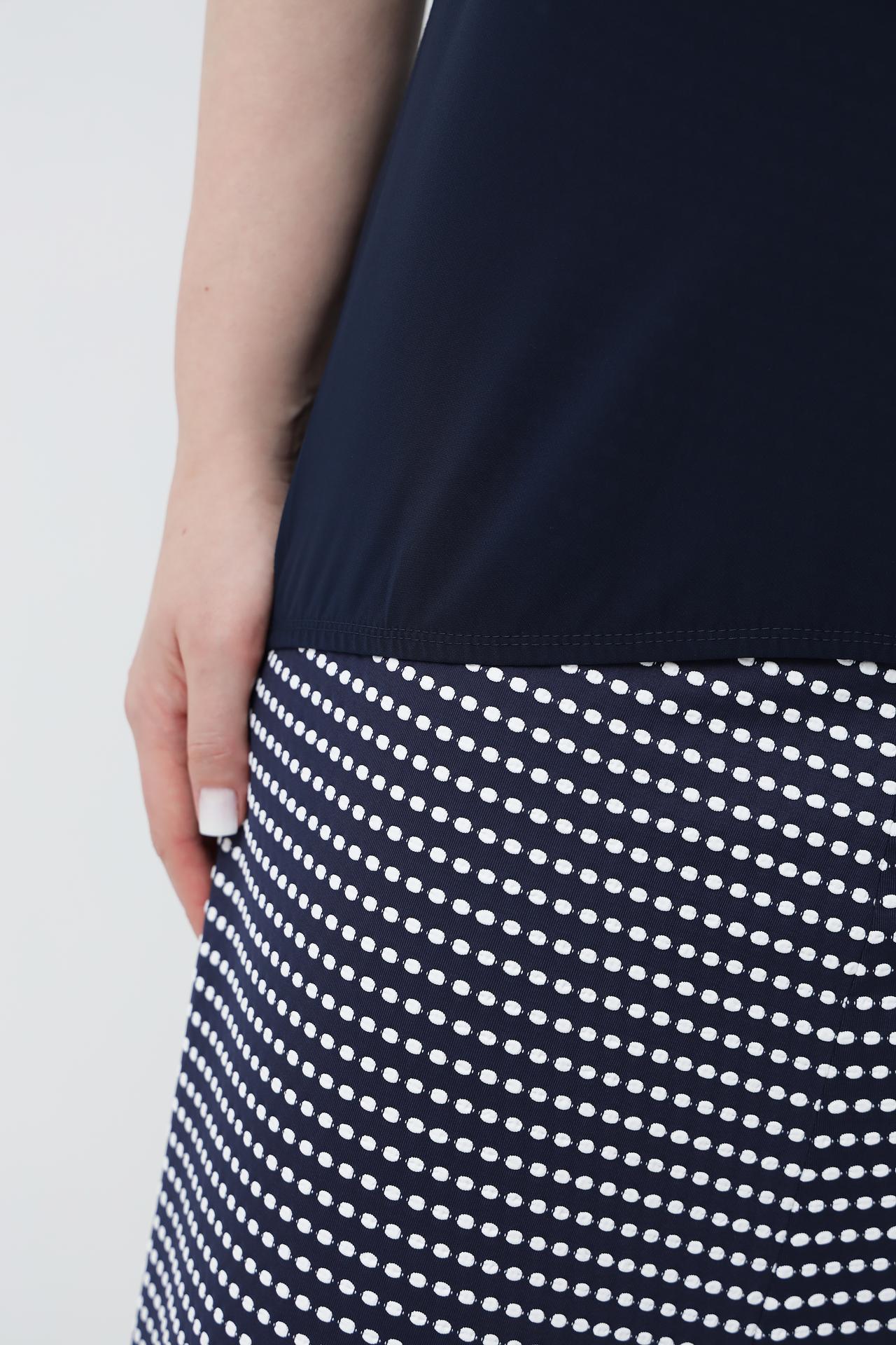 Модель выполнена в глубоком синем цвете, что придает ей особую изысканность. Детали, такие как V-образный вырез с короткой молнией и стильные декоративные нагрудные карманы, добавляют уникальности и современной нотки. Короткие рукава и прямой крой обеспечивают свободу движений и комфортную посадку на любую фигуру.