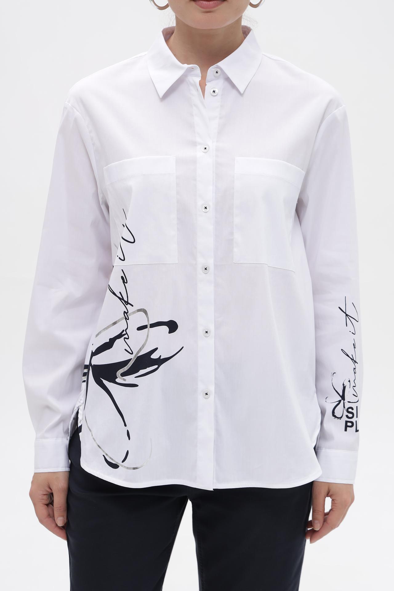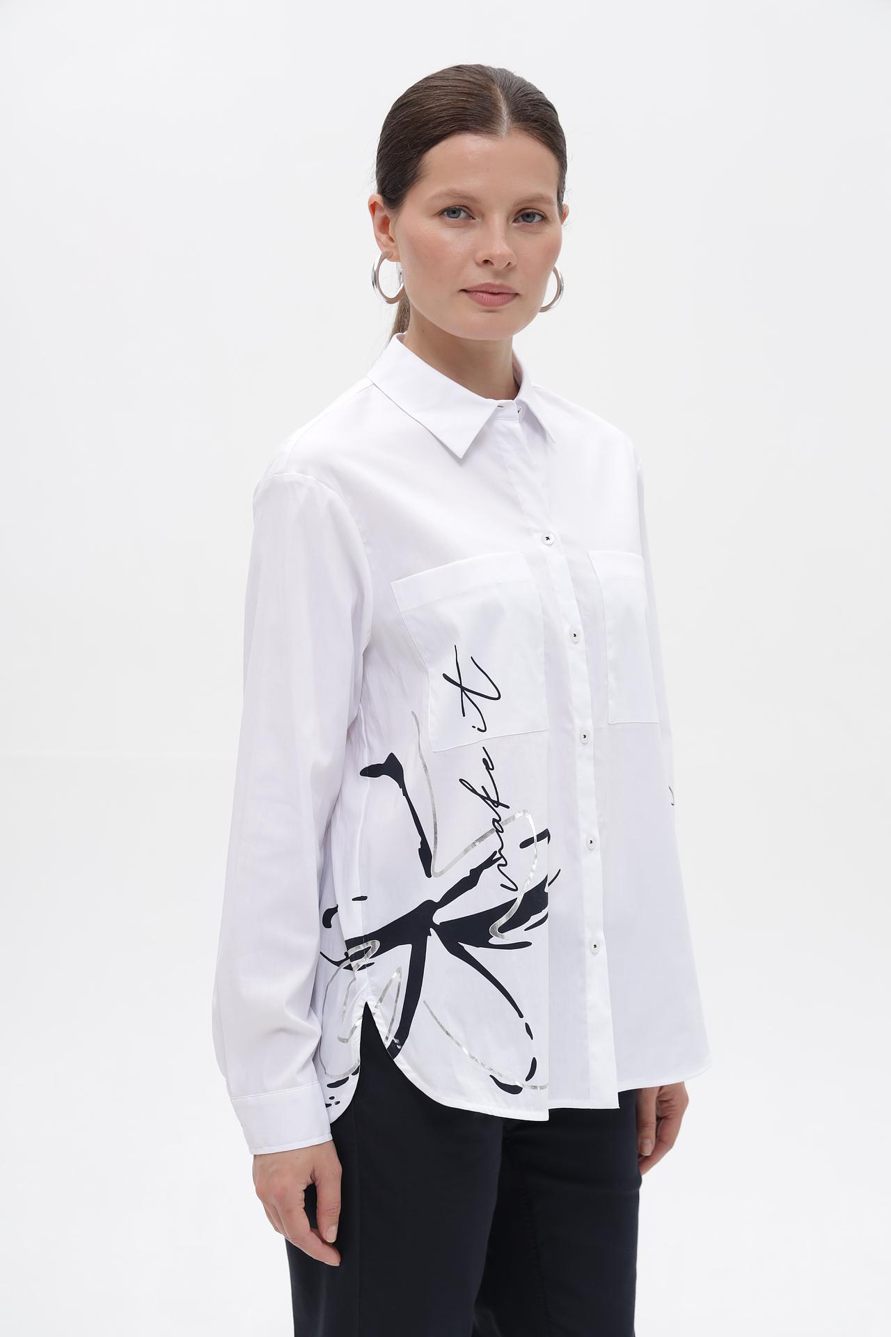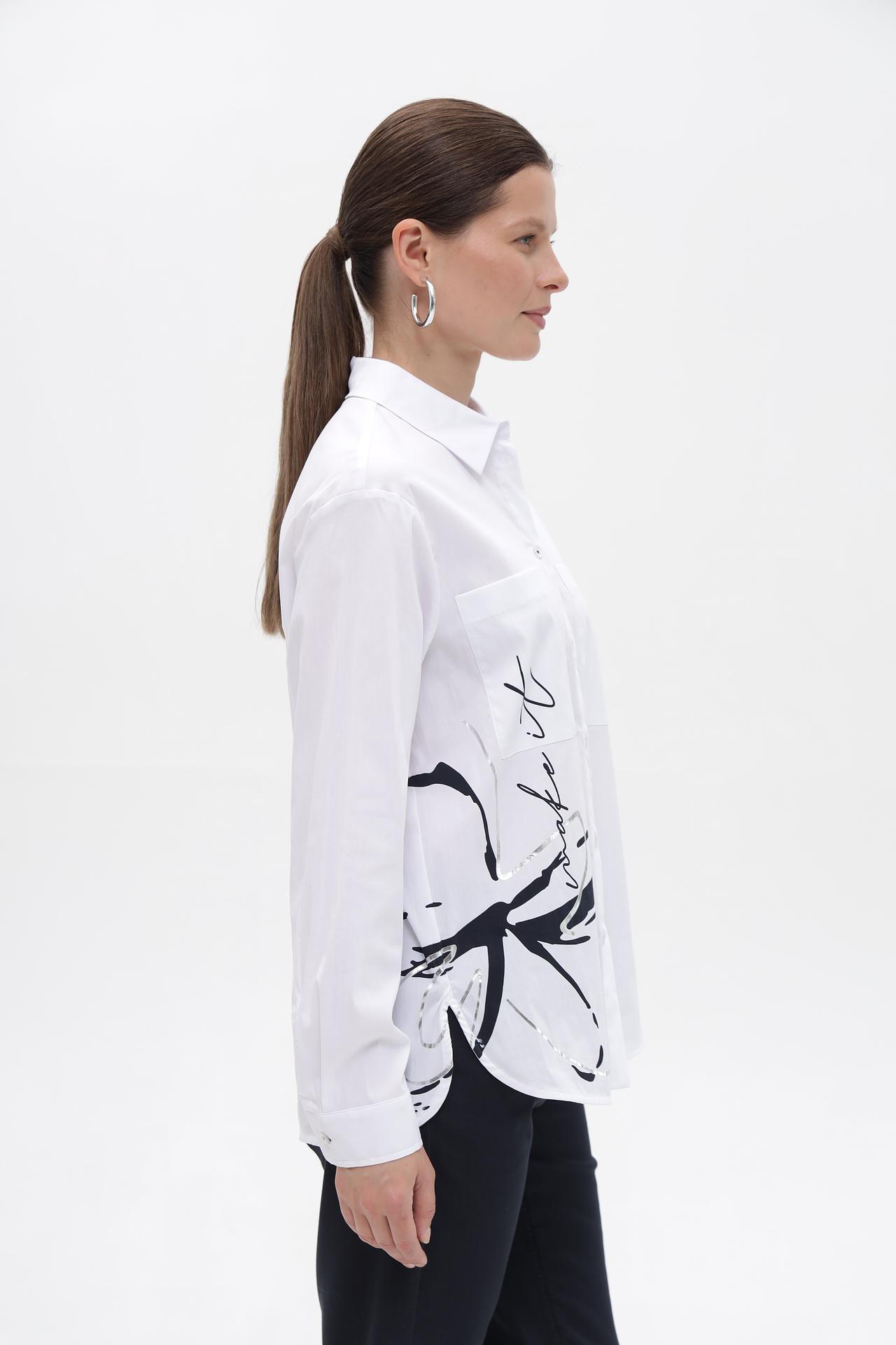 Модель украшена оригинальным черно-серебристым абстрактным принтом с текстовыми элементами, расположенным спереди и на рукаве, что придает ей современный и динамичный вид. Классический отложной воротник и пуговицы по всей длине делают блузку универсальной для различных образов.