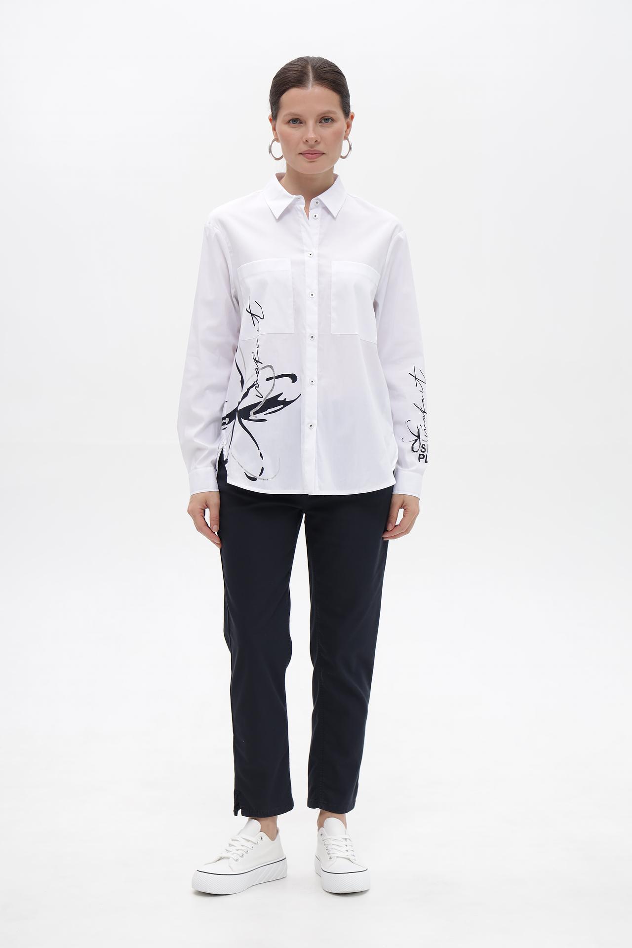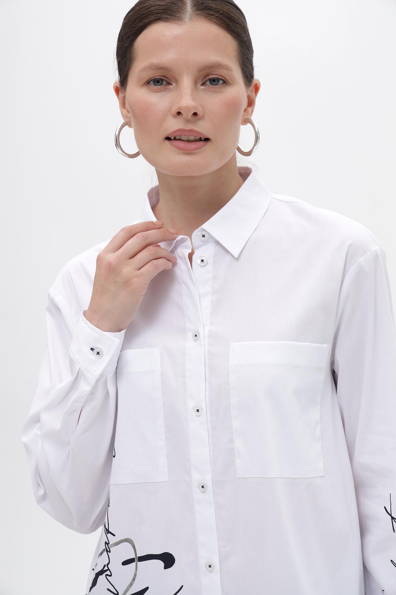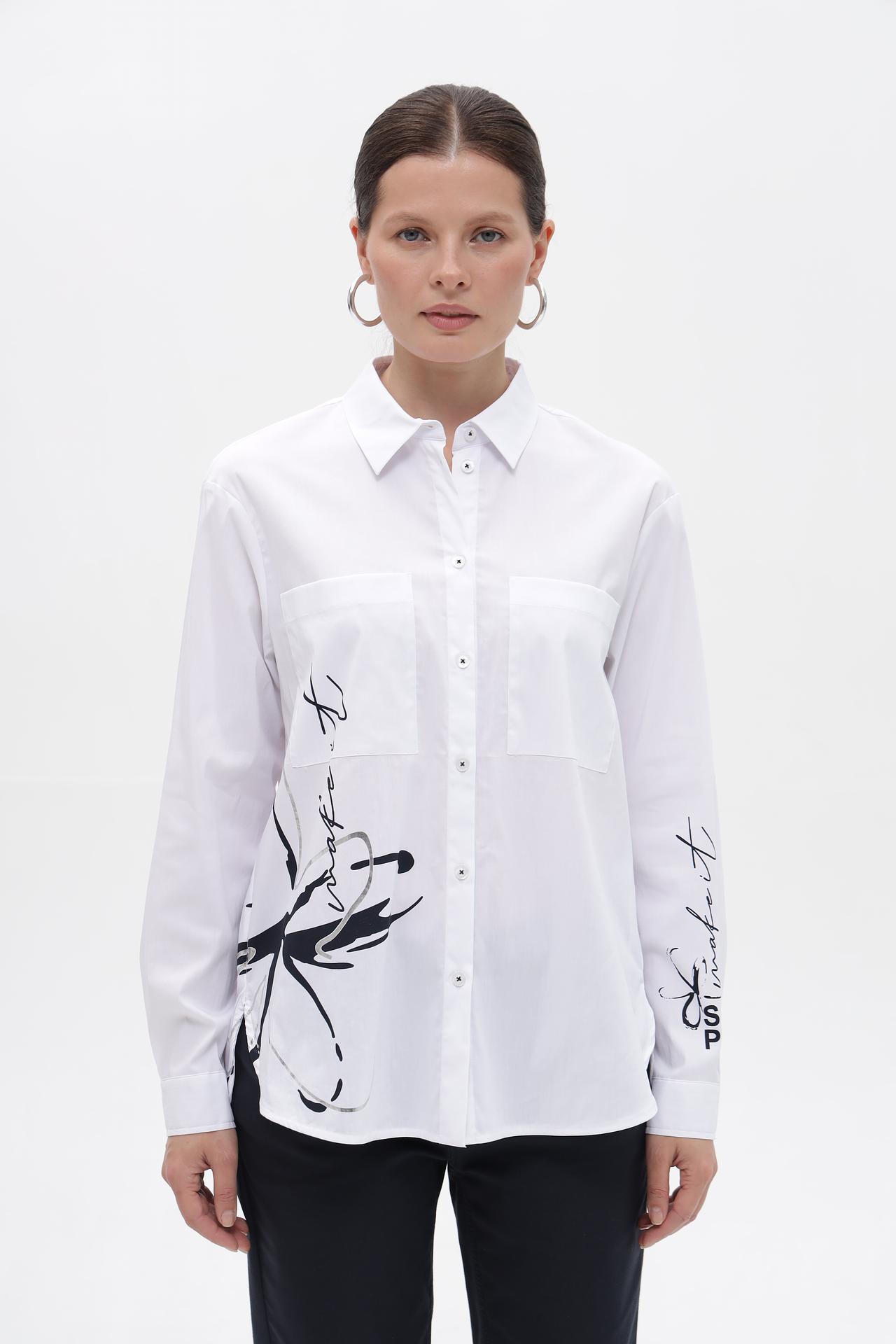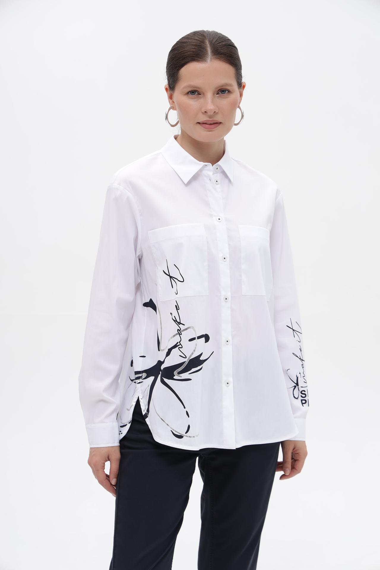 Модель украшена оригинальным черно-серебристым абстрактным принтом с текстовыми элементами, расположенным спереди и на рукаве, что придает ей современный и динамичный вид. Классический отложной воротник и пуговицы по всей длине делают блузку универсальной для различных образов.
