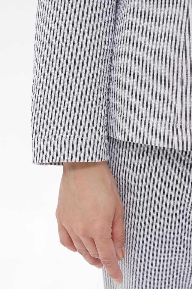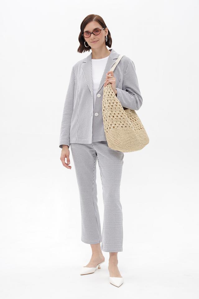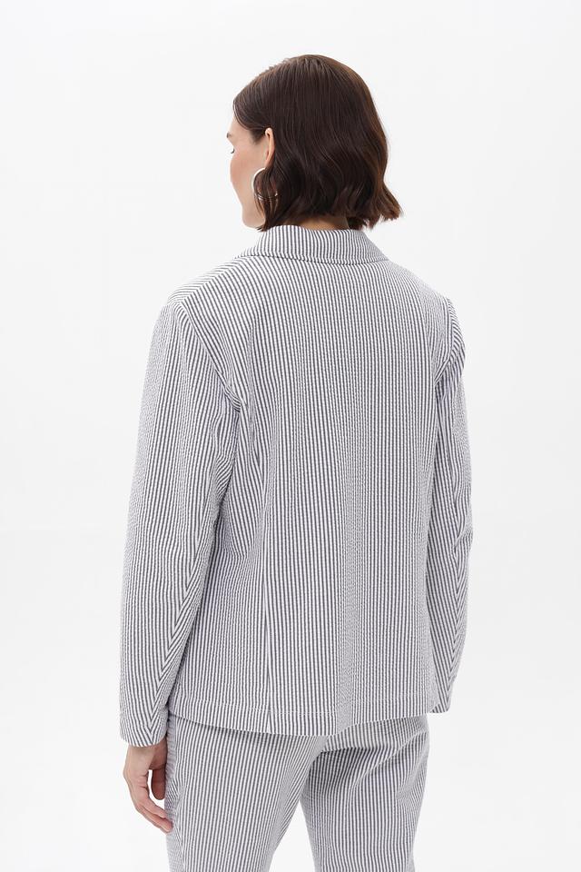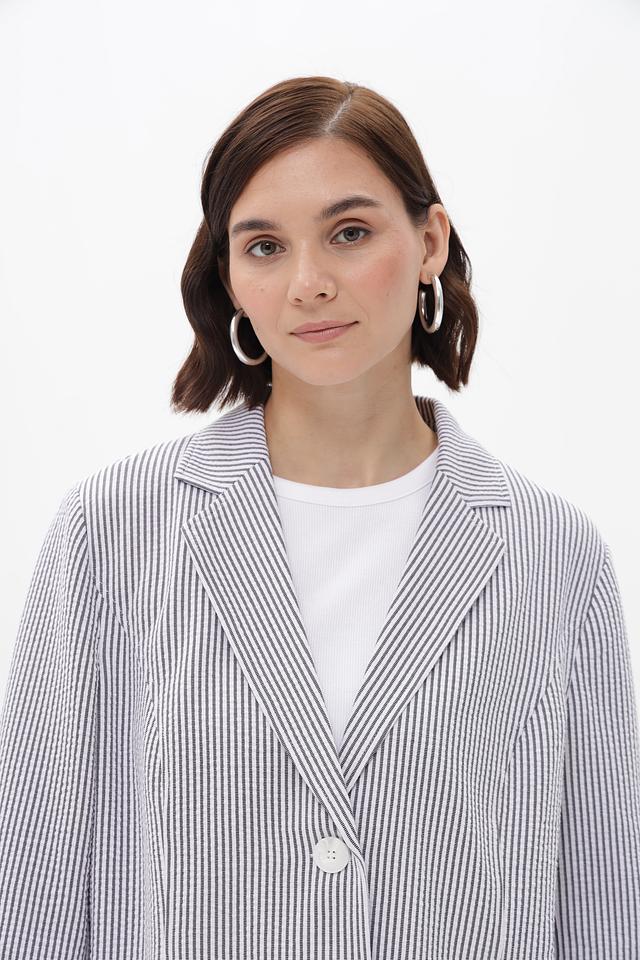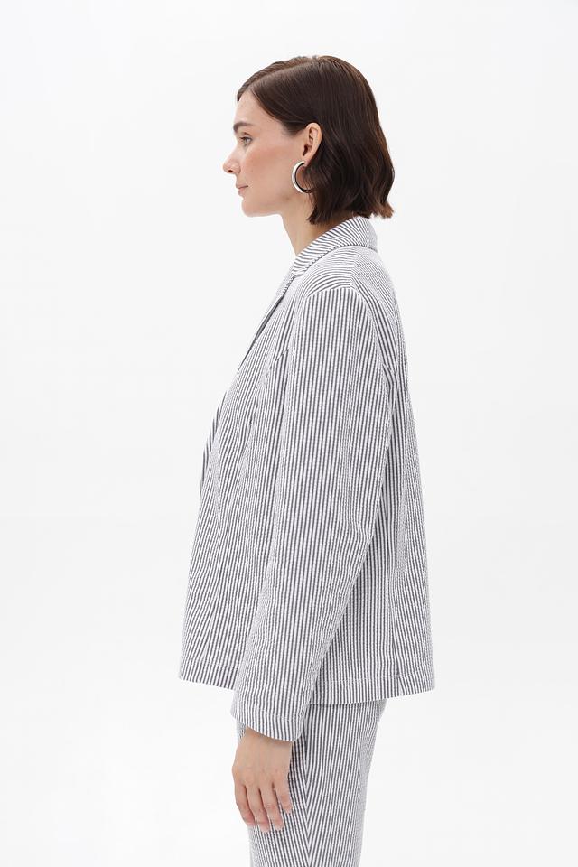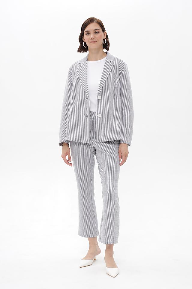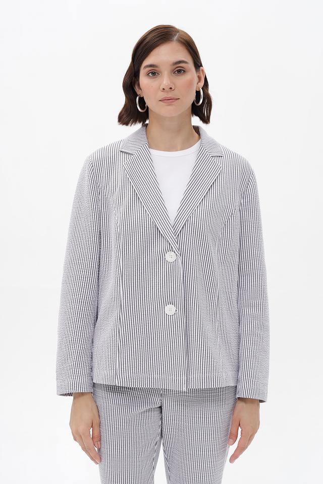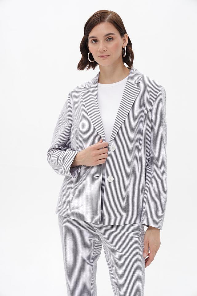 Жакет имеет однобортную застежку на две пуговицы, лацканы стандартной ширины и длинные рукава. Тонкая полоска синего и белого цветов придает изделию свежий и элегантный вид.