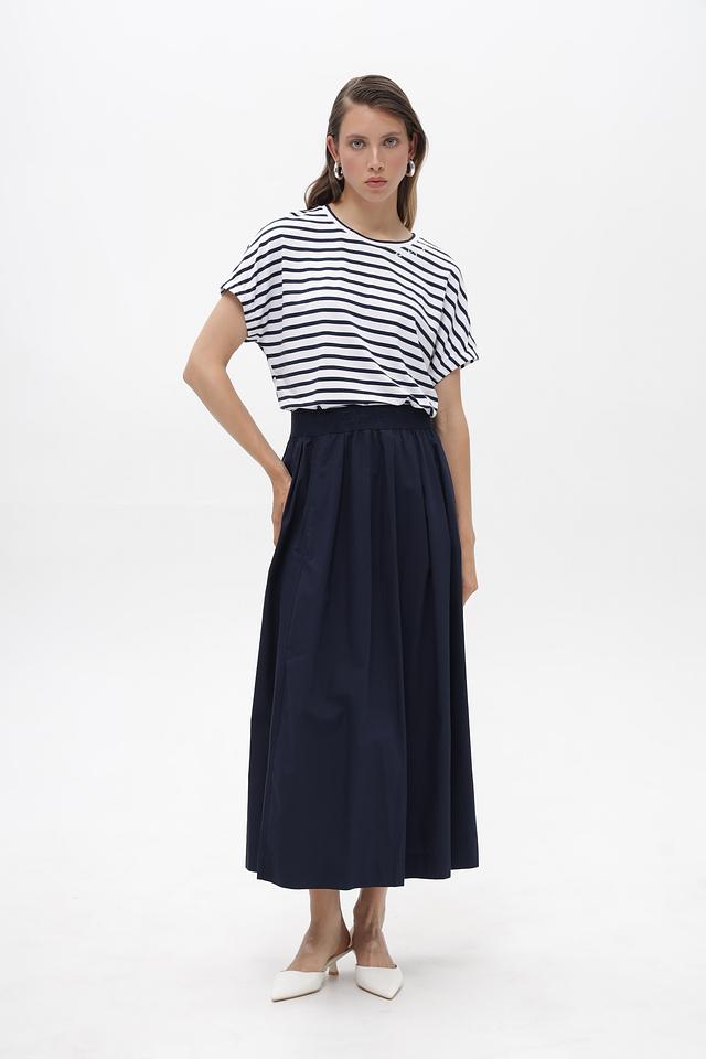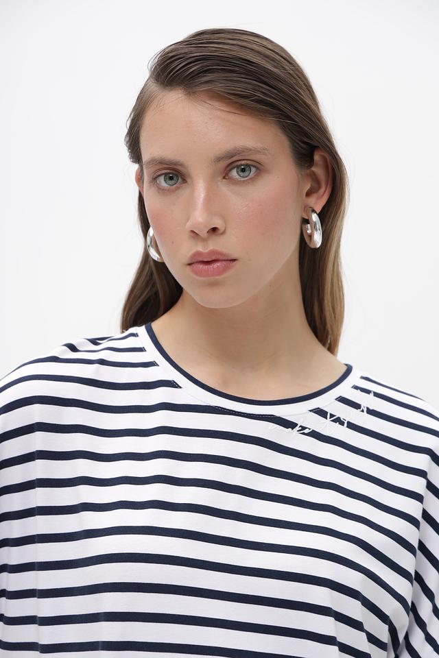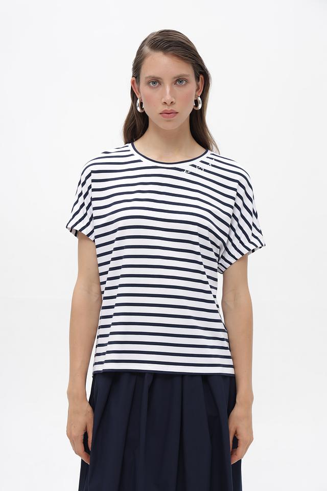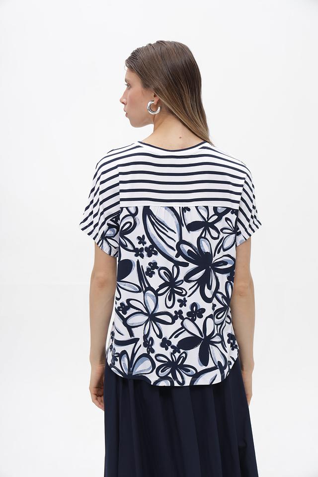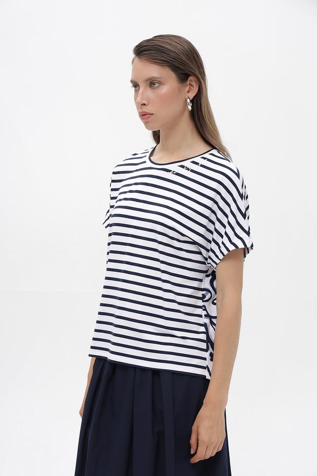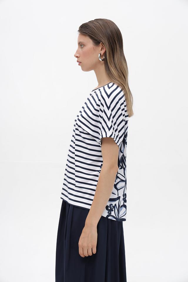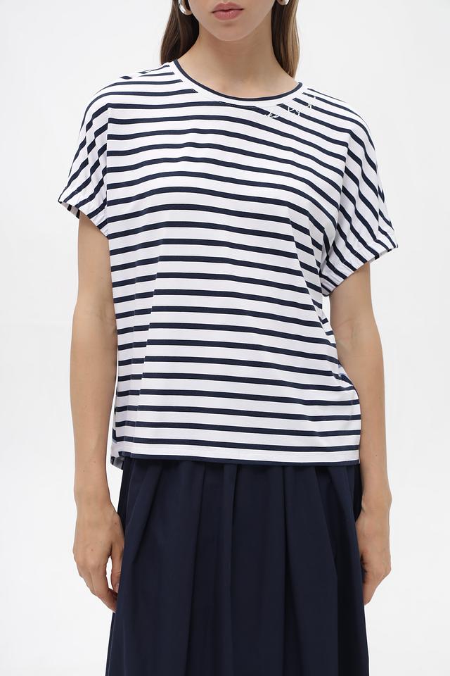 Женская футболка от Rabe collection белого цвета с классическим синим полосатым принтом. Изготовлена из мягкой вискозы с добавлением эластана для комфорта в носке. Состав: вискоза 92%, эластан 8%