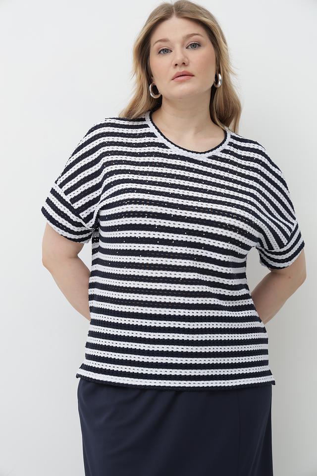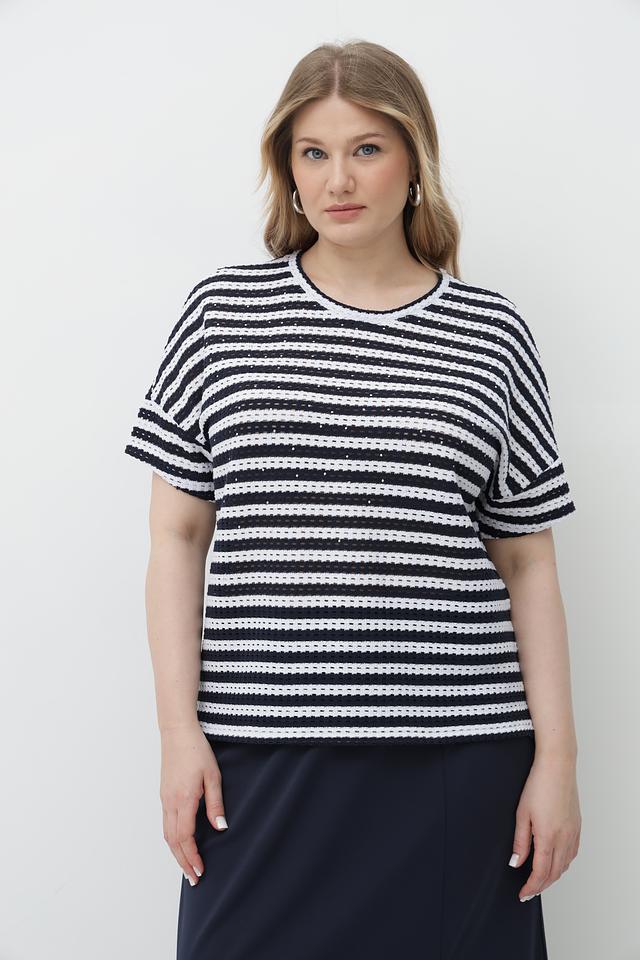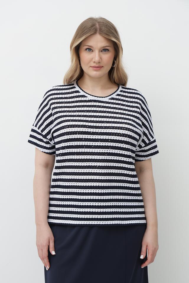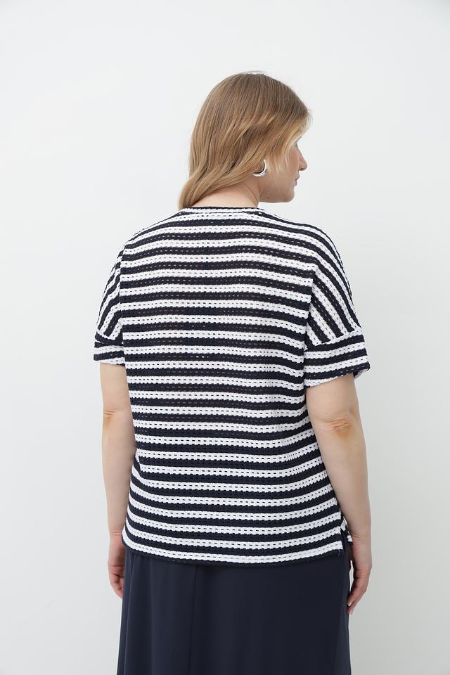 Женская футболка Rabe collection сине-белого цвета с короткими рукавами и круглым вырезом горловины. Изготовлена из мягкого трикотажа с добавлением хлопка и полиэстера, обеспечивающего комфорт и удобство в носке. Состав: хлопок 47%, полиэстер 47%, эластан 6%