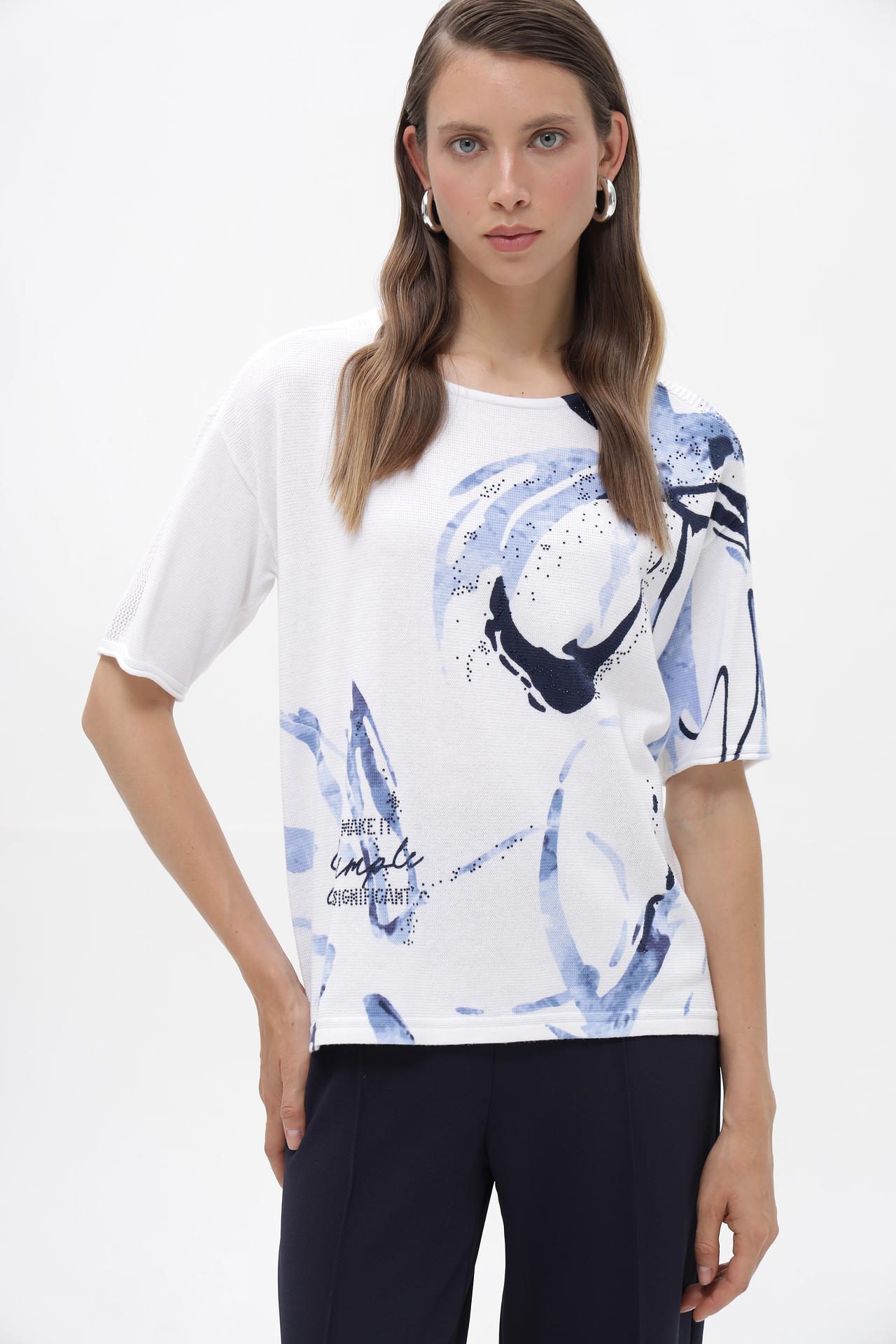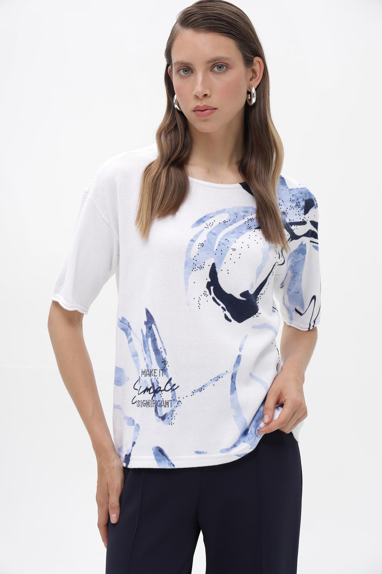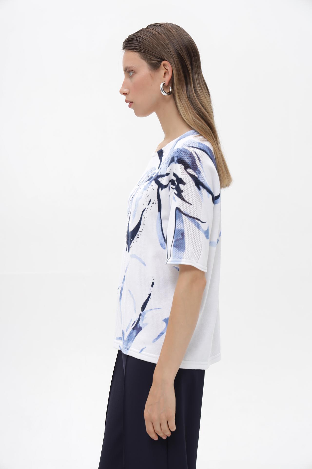 Яркий абстрактный принт в синих тонах на белом фоне придает изделию свежий и динамичный вид. Декоративные элементы в виде сияющих страз добавляют изысканности и утонченности. Оригинальные вставки из сетчатой вязки на рукавах подчеркивают индивидуальность дизайна.