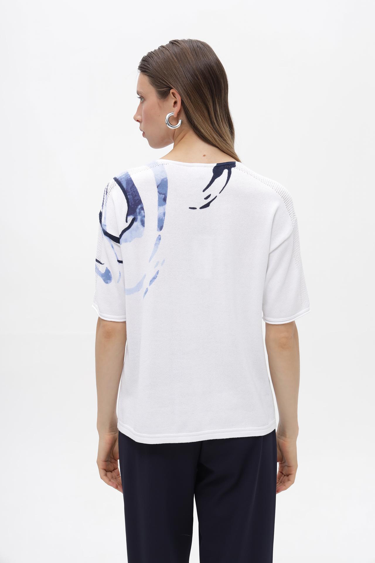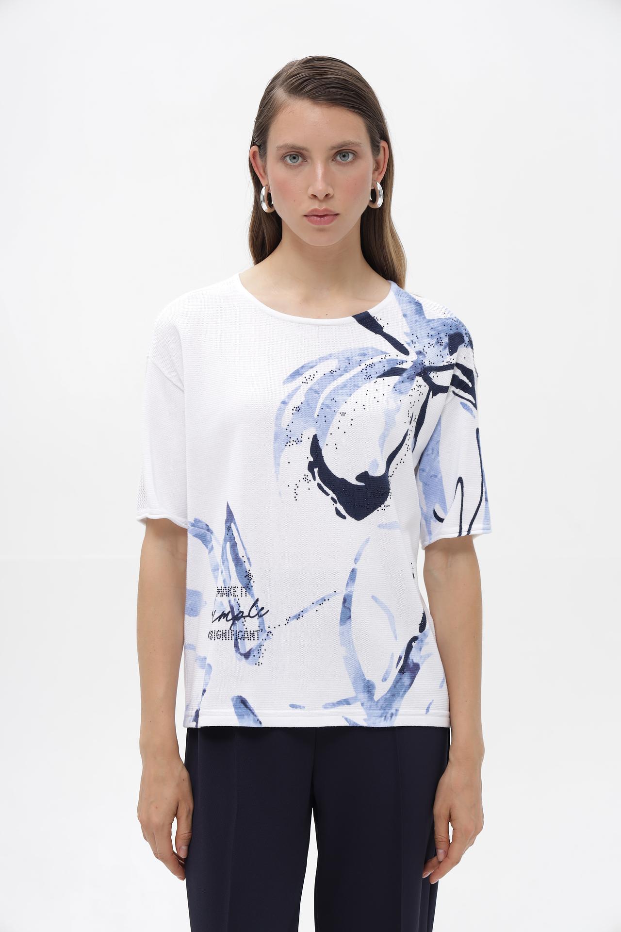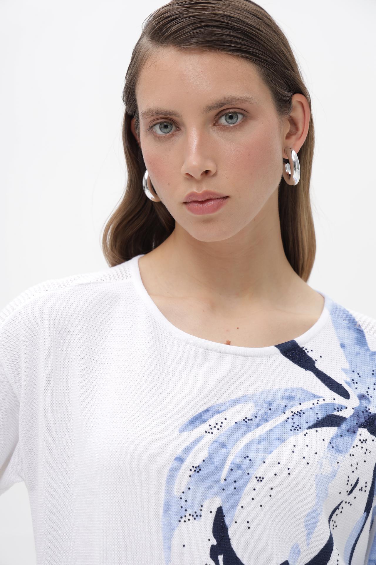 Яркий абстрактный принт в синих тонах на белом фоне придает изделию свежий и динамичный вид. Декоративные элементы в виде сияющих страз добавляют изысканности и утонченности. Оригинальные вставки из сетчатой вязки на рукавах подчеркивают индивидуальность дизайна.