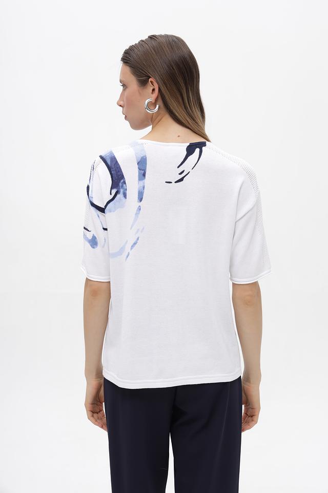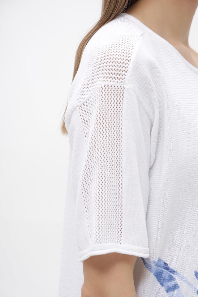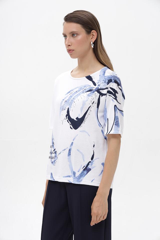 Представляем стильную футболку от бренда Rabe collection. Эта модель выполнена в белом цвете и украшена эффектным принтом в синих оттенках, добавляющим образу оригинальности.