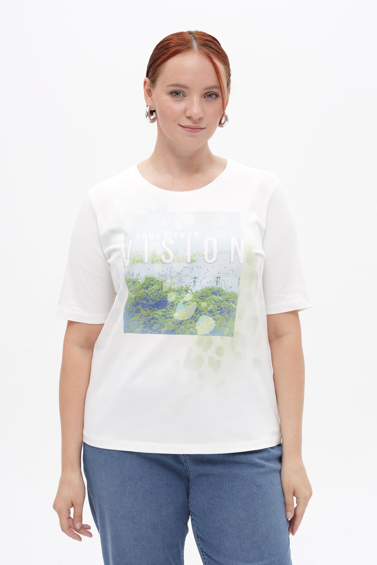 Футболка Rabe collection — идеальный выбор для вашего повседневного гардероба. Выполнена из высококачественного материала (95% хлопок, 5% эластан), что обеспечивает исключительную мягкость и комфорт в носке на протяжении всего дня. Модель украшена современным принтом с надписью «TRUST YOUR VISION» и изящными стразами, придающими изделию уникальность и стильный акцент.