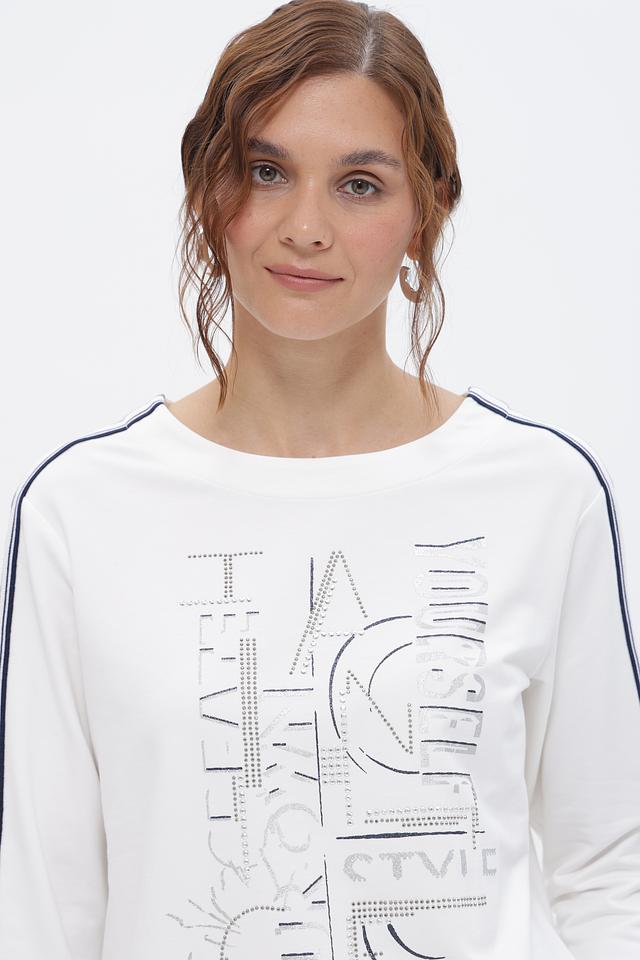 Передняя часть футболки украшена графичным принтом, выполненным с использованием мелких страз, что придает изделию изысканность и оригинальность. Контрастные синие полоски вдоль рукавов добавляют динамики и акцентируют внимание на деталях.