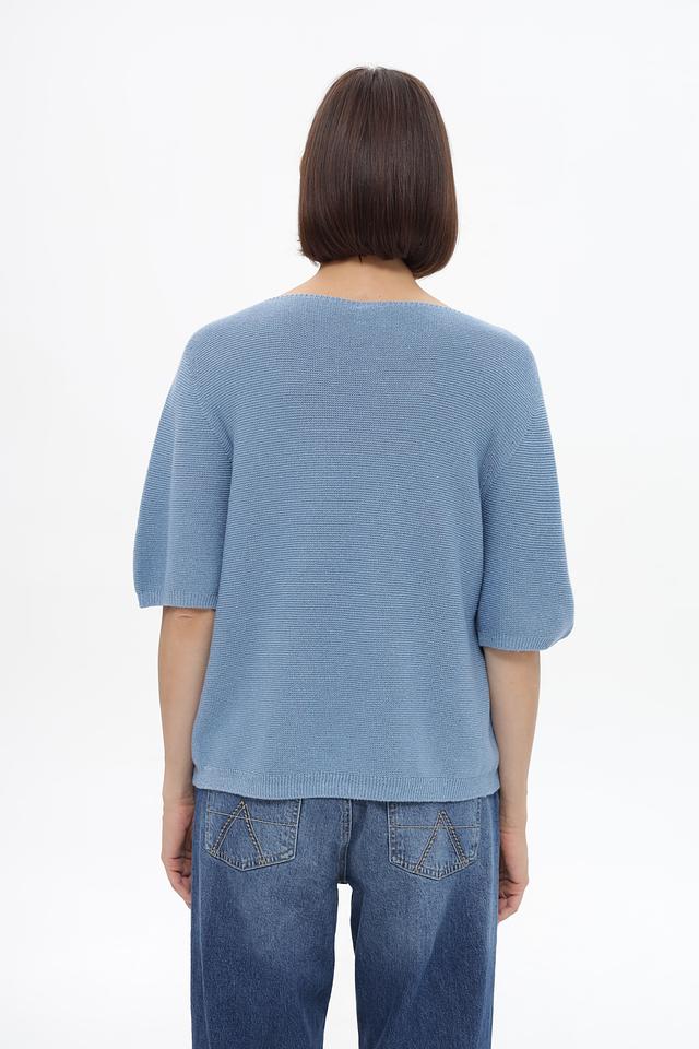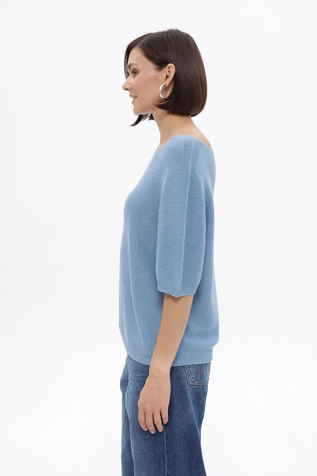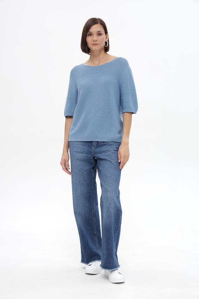 Пуловер имеет округлый вырез горловины и короткие рукава 3/4, что делает его идеальным для теплой погоды. Изготовлен из мягкого трикотажа, в состав которого входит хлопок, полиэстер и металлическая нить, что придает изделию лёгкий блеск и интересную фактуру.
