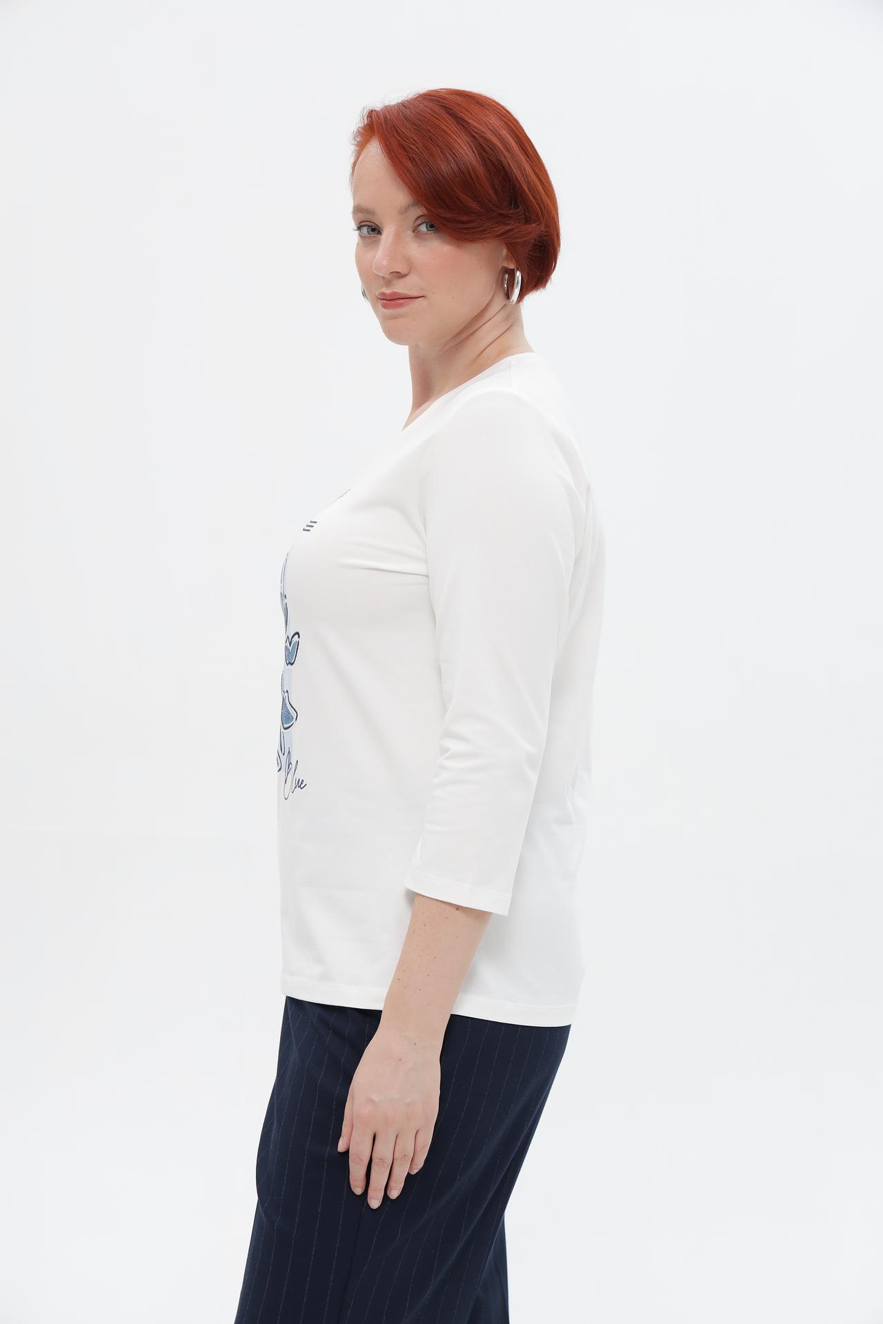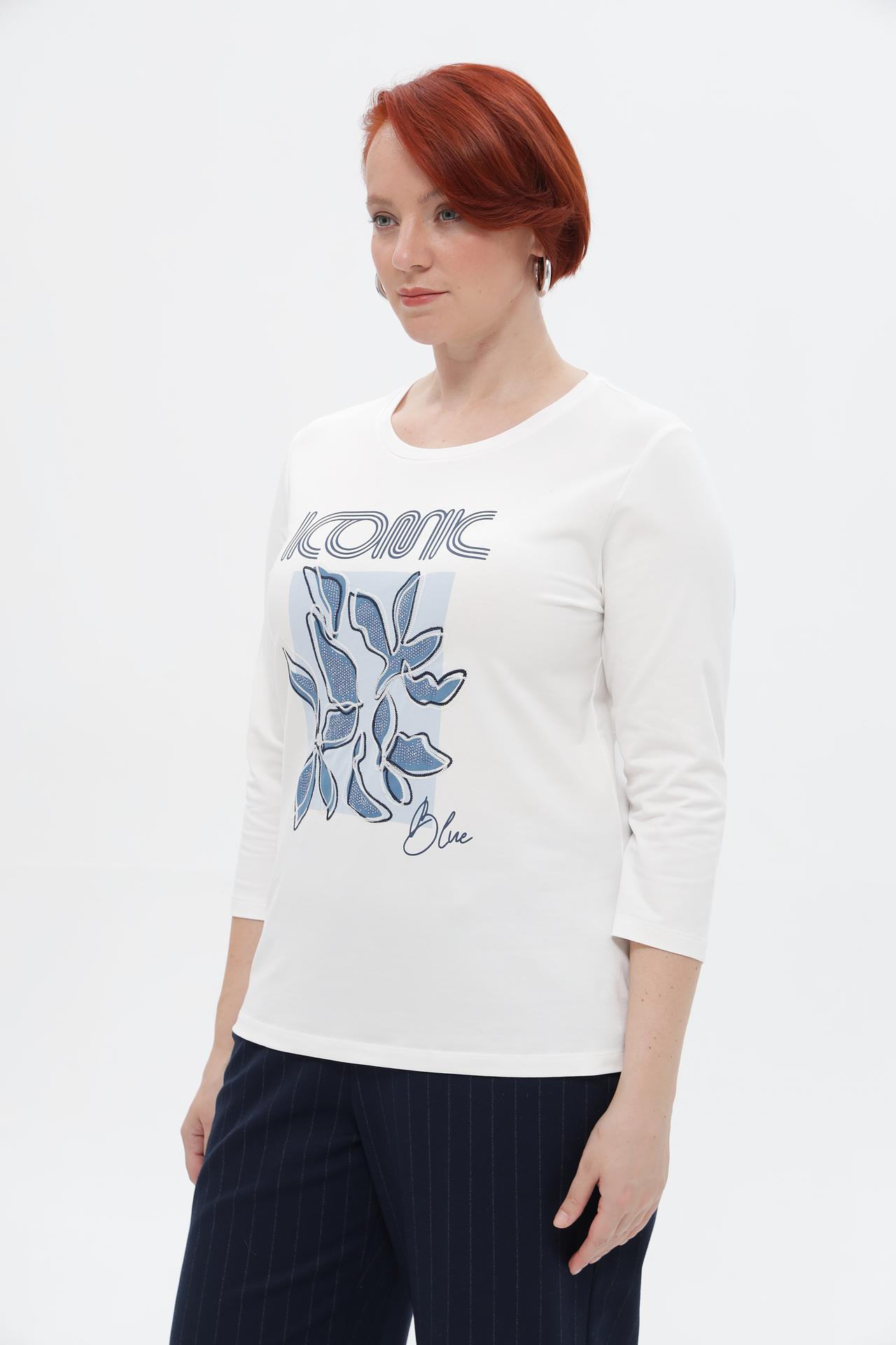 - Дизайн: Классический круглый вырез и рукав три четверти создают элегантный силуэт. На груди расположен стильный принт с изображением синих листьев и надписью, добавляющий футболке индивидуальности.