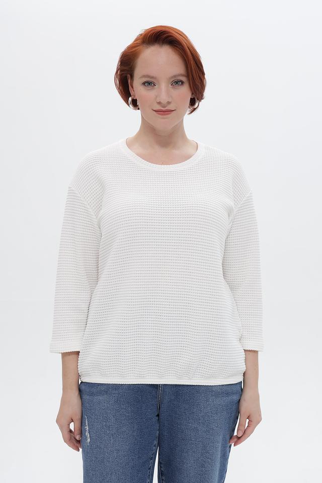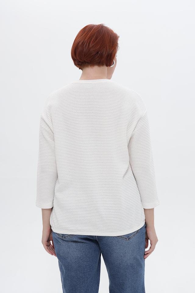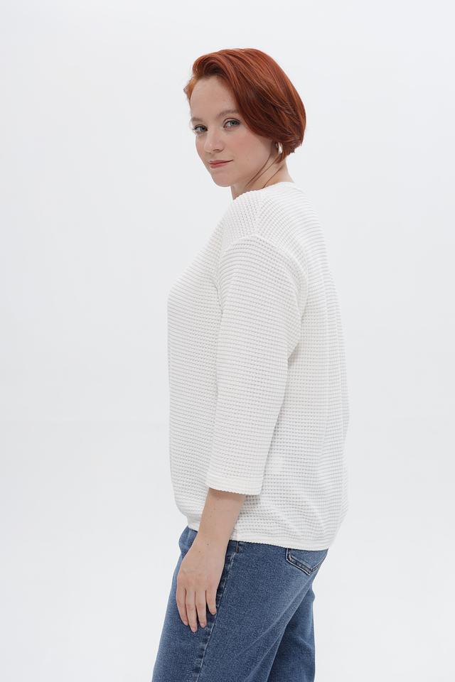 Блузка имеет круглый вырез горловины и рукава длиной 3/4, что делает ее универсальной для разных сезонов. Свободный крой обеспечивает комфортную посадку по фигуре.