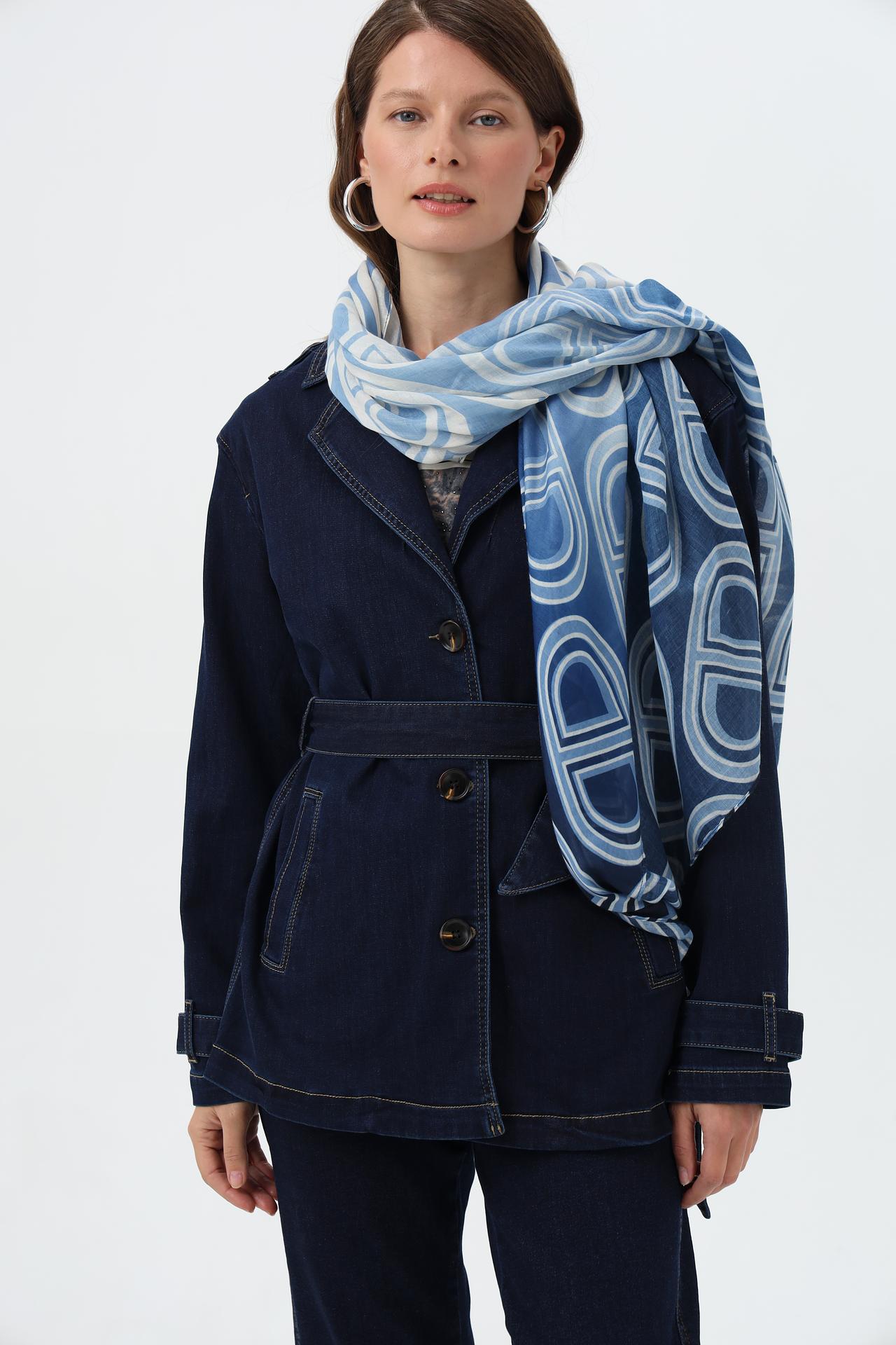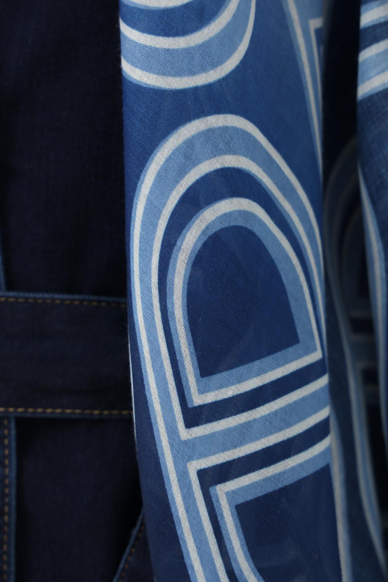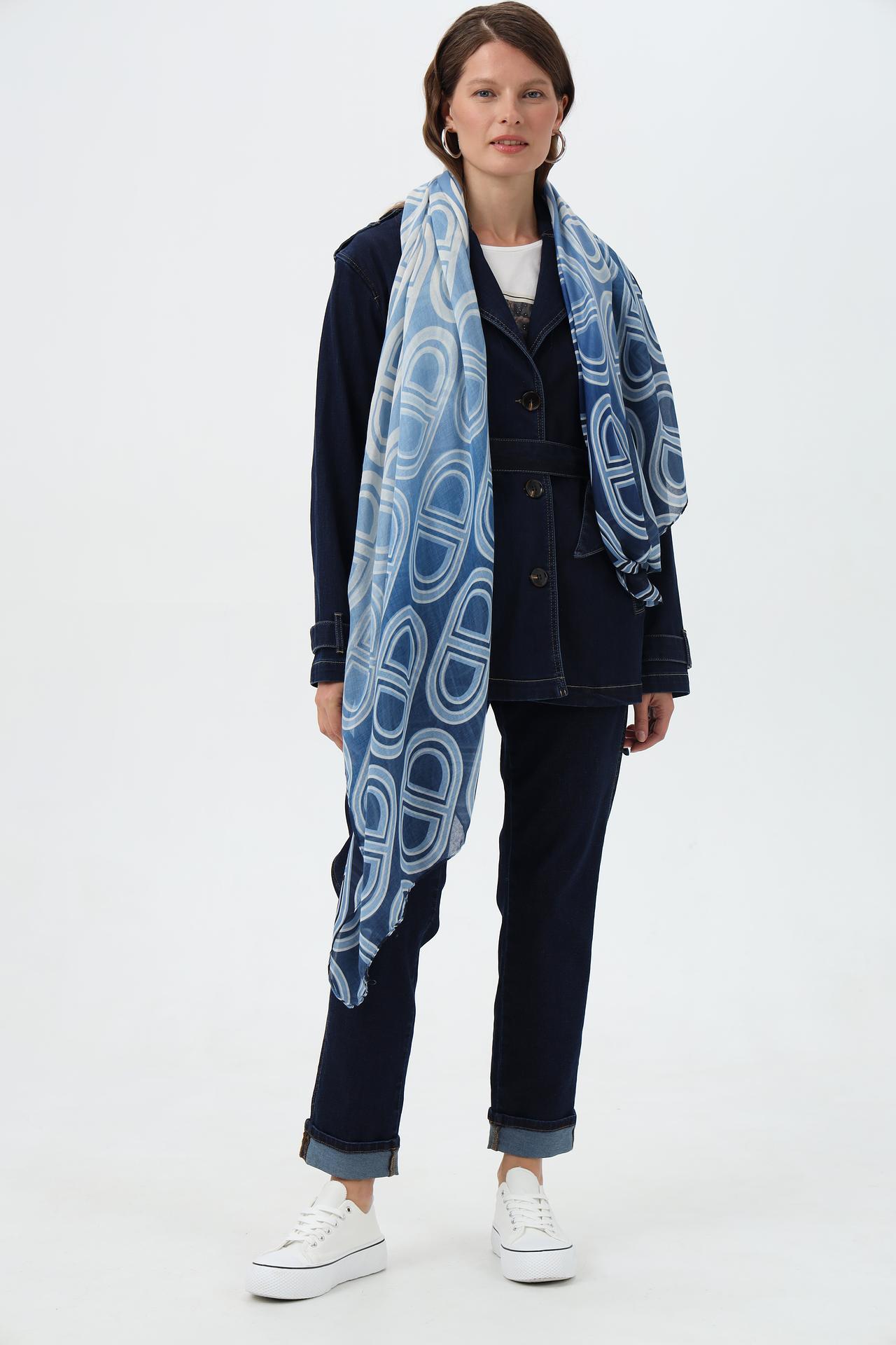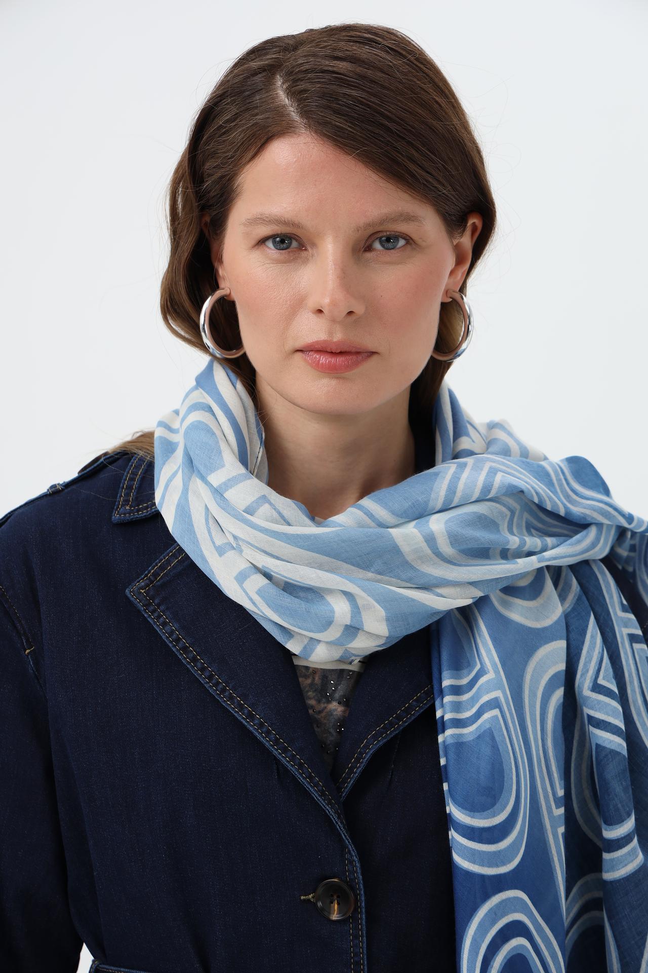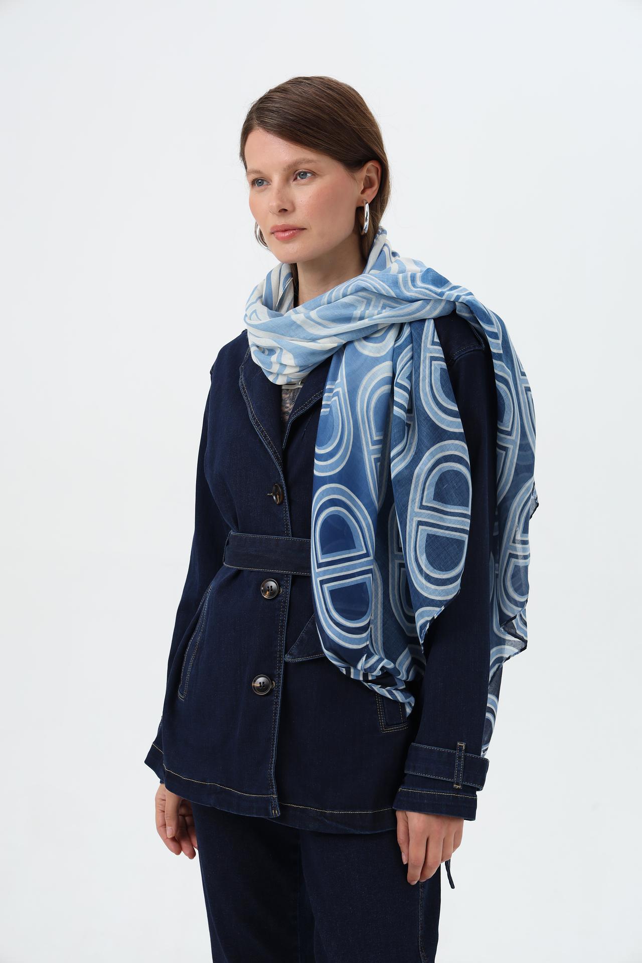 - Дизайн: Яркий и выразительный принт в синих оттенках с геометрическим узором делает этот шарф акцентным элементом вашего гардероба. Интересный рисунок притягивает взгляды и подчеркивает индивидуальность.