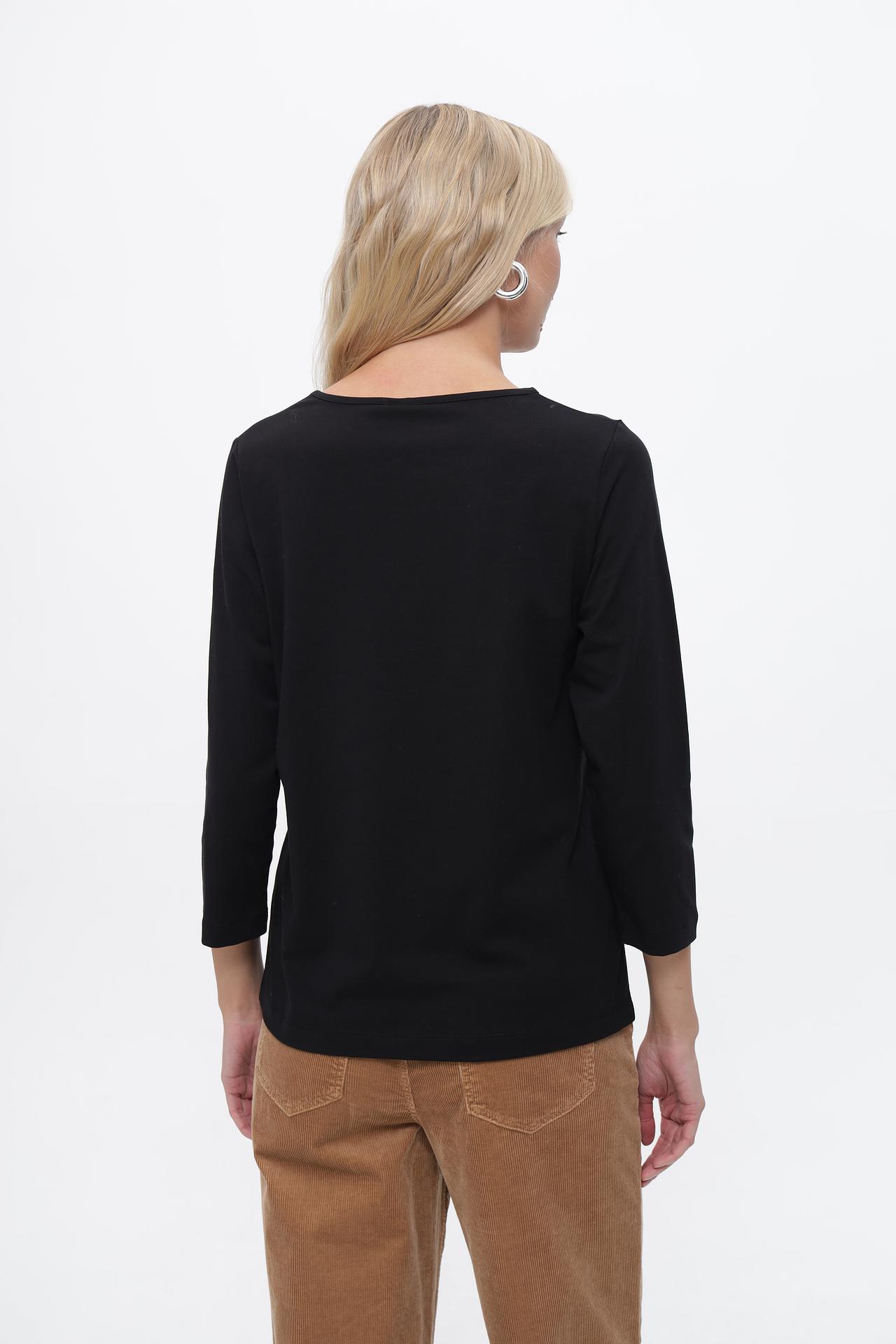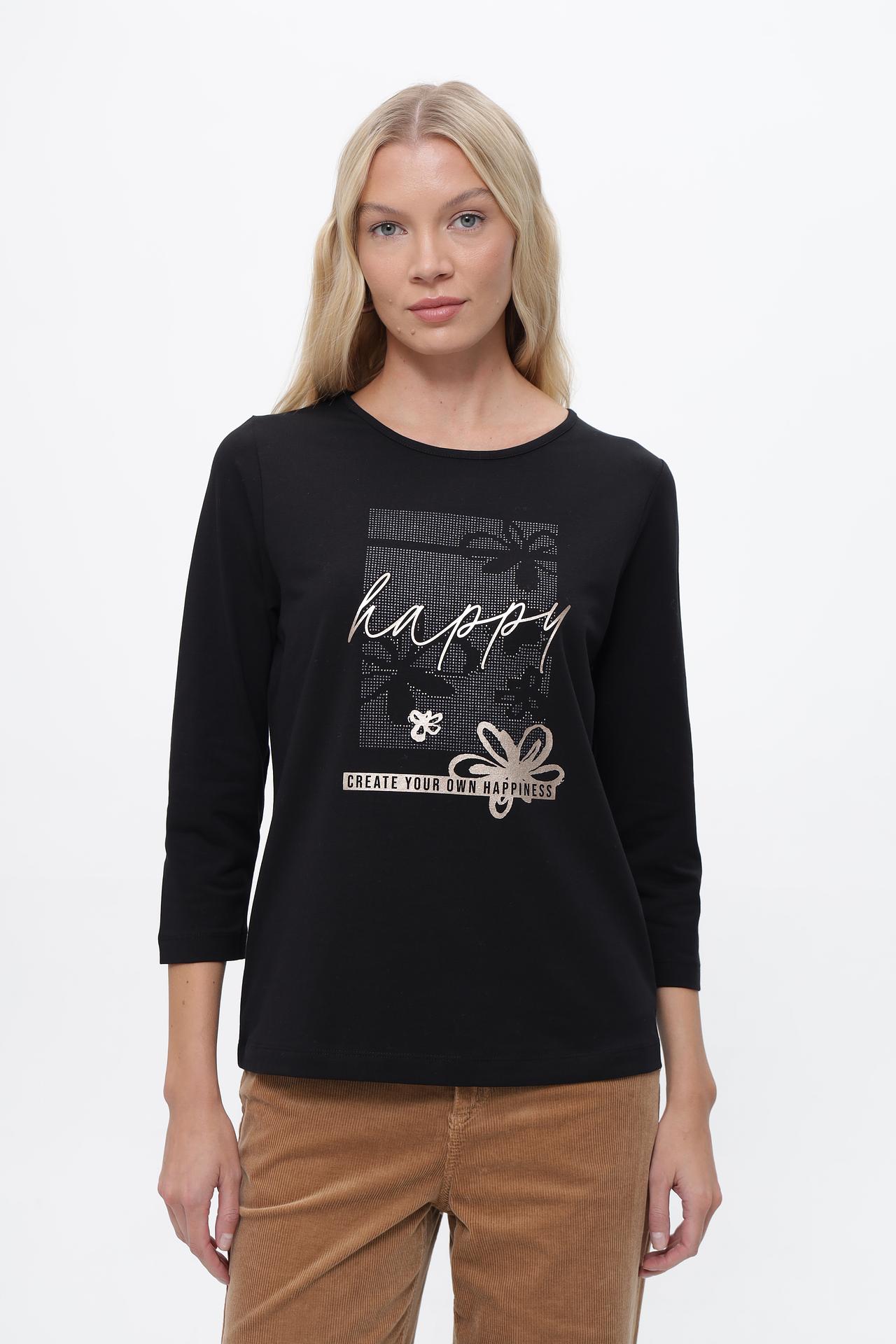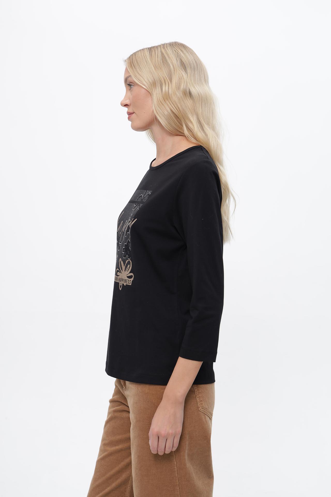 - Дизайн: Лаконичный крой с рукавом три четверти и круглым вырезом горловины. На груди расположен стильный принт с блестящими элементами, который поднимает настроение.