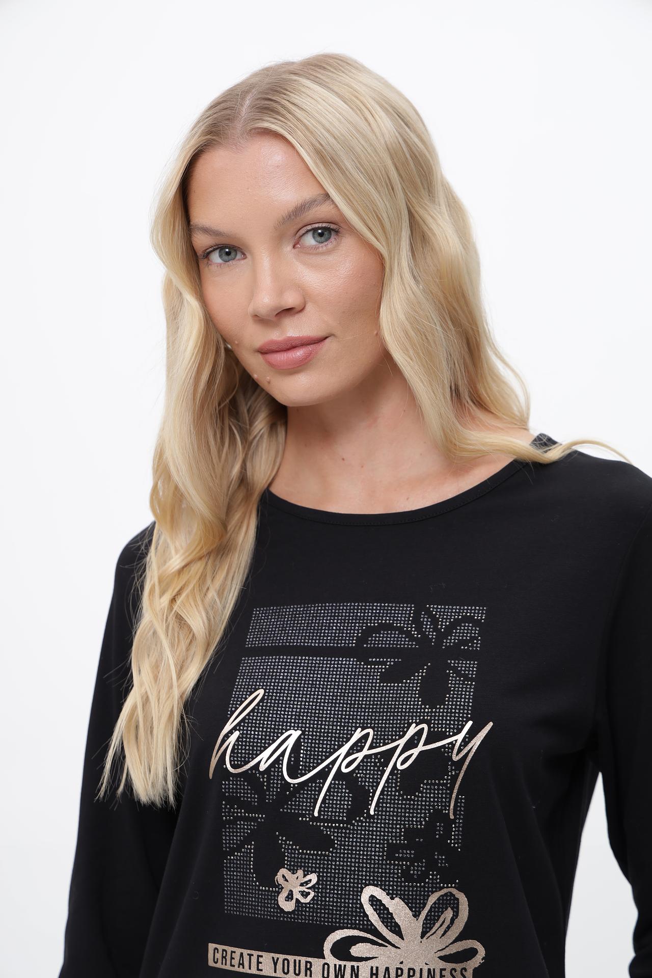 Базовая черная футболка от Rabe collection – идеальное дополнение к повседневному гардеробу. Модель выполнена из приятной к телу ткани, которая обеспечивает комфорт в течение всего дня. Оригинальный принт с надписью 'happy' и цветочными мотивами добавляет футболке индивидуальности и стиля. Универсальный черный цвет легко сочетается с любыми оттенками и предметами одежды, делая эту футболку незаменимой вещью.