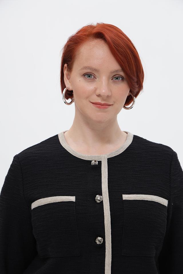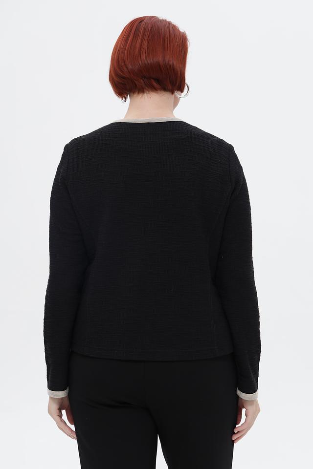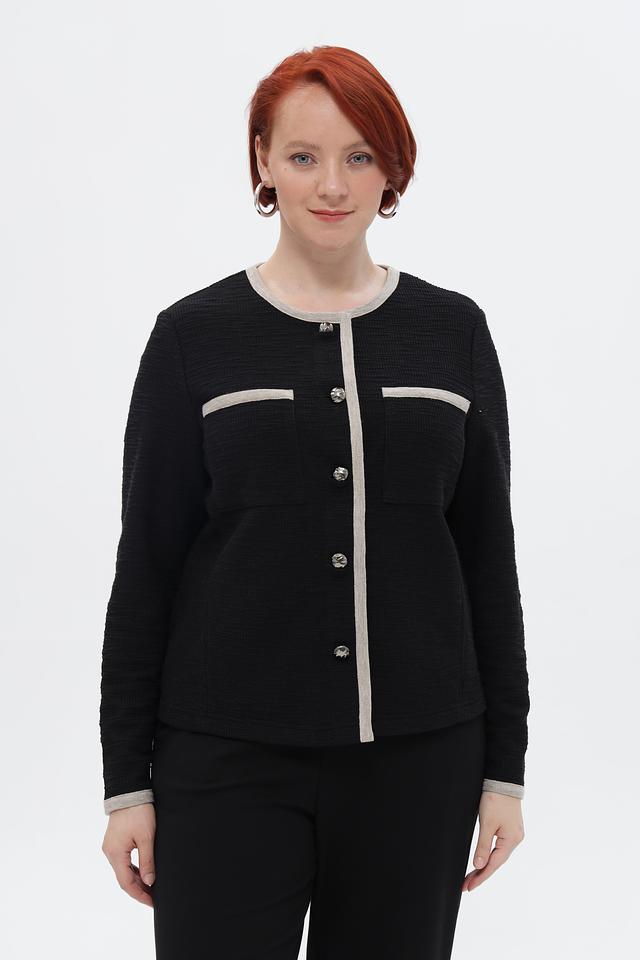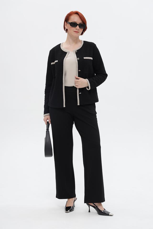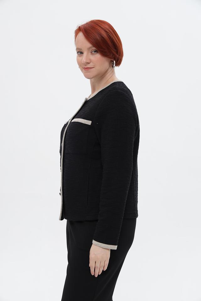 Представляем элегантный жакет от бренда Rabe collection. Модель выполнена в классическом чёрном цвете с контрастной бежевой отделкой по краю, горловине, карманам и манжетам, что придаёт ей особый шарм.