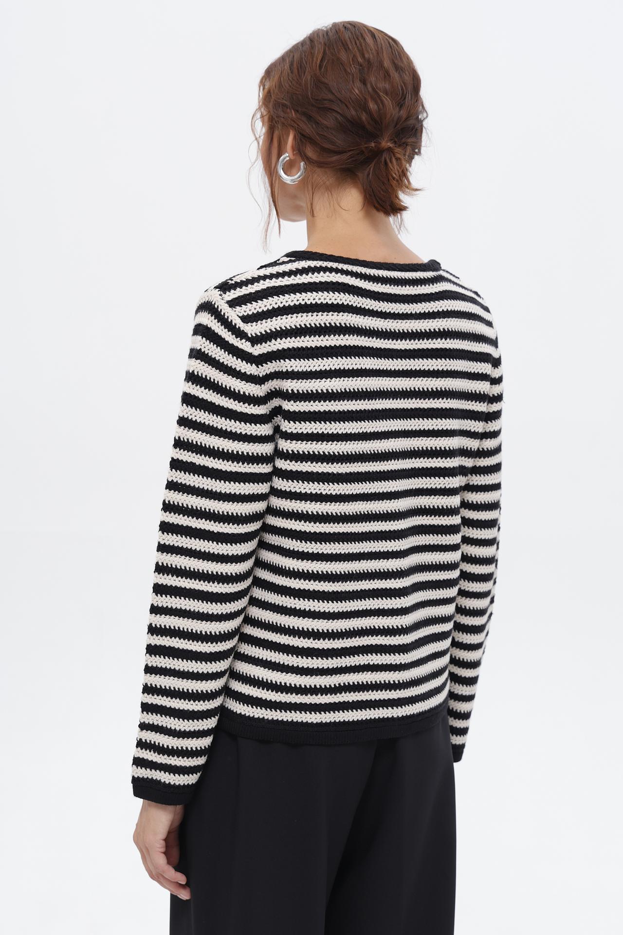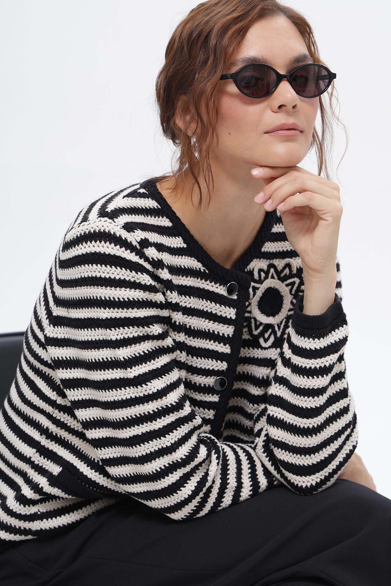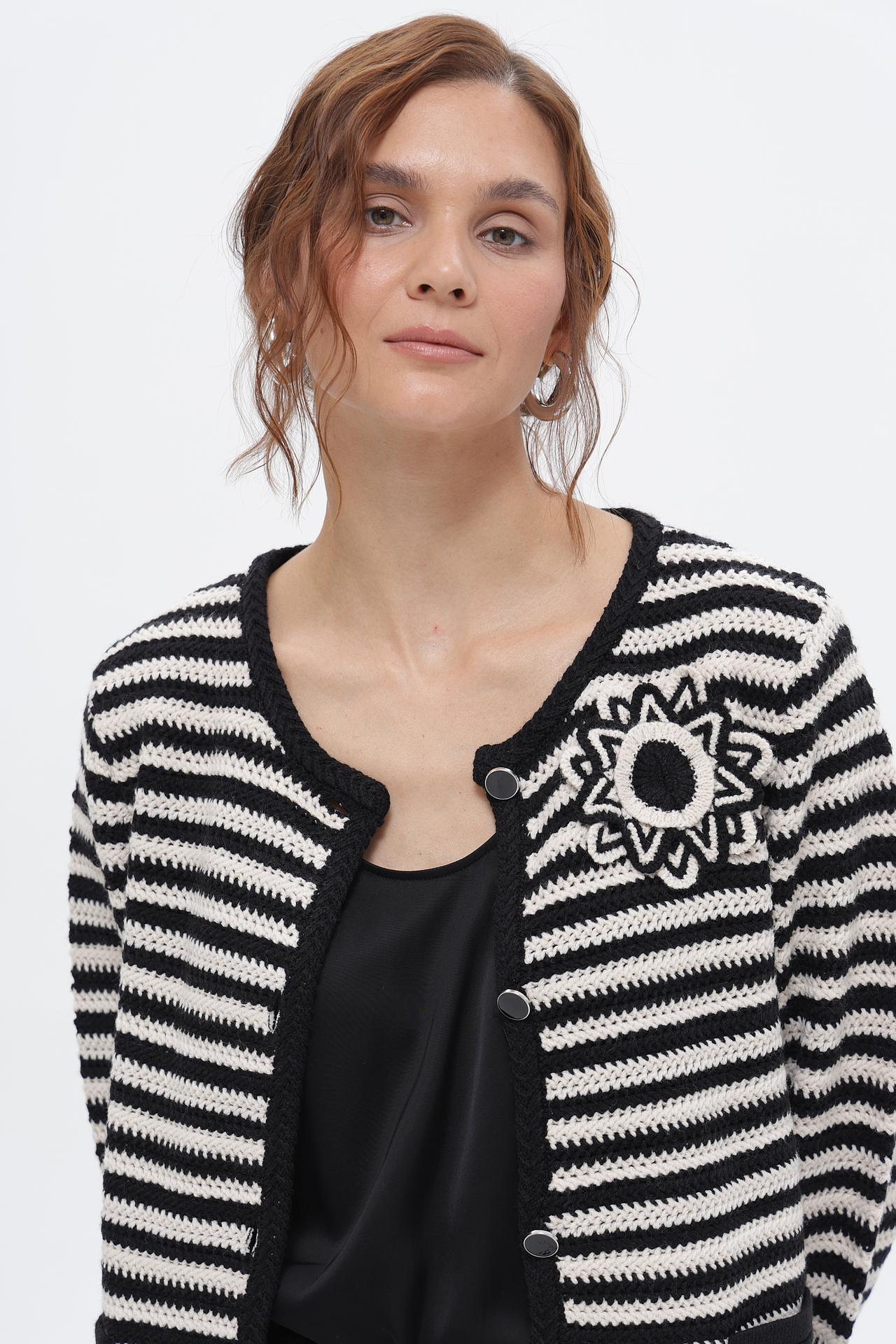 - Дизайн: Классический черно-белый принт в горизонтальную полоску. Оригинальная аппликация в виде цветка добавляет изюминку и акцентирует внимание на детали.