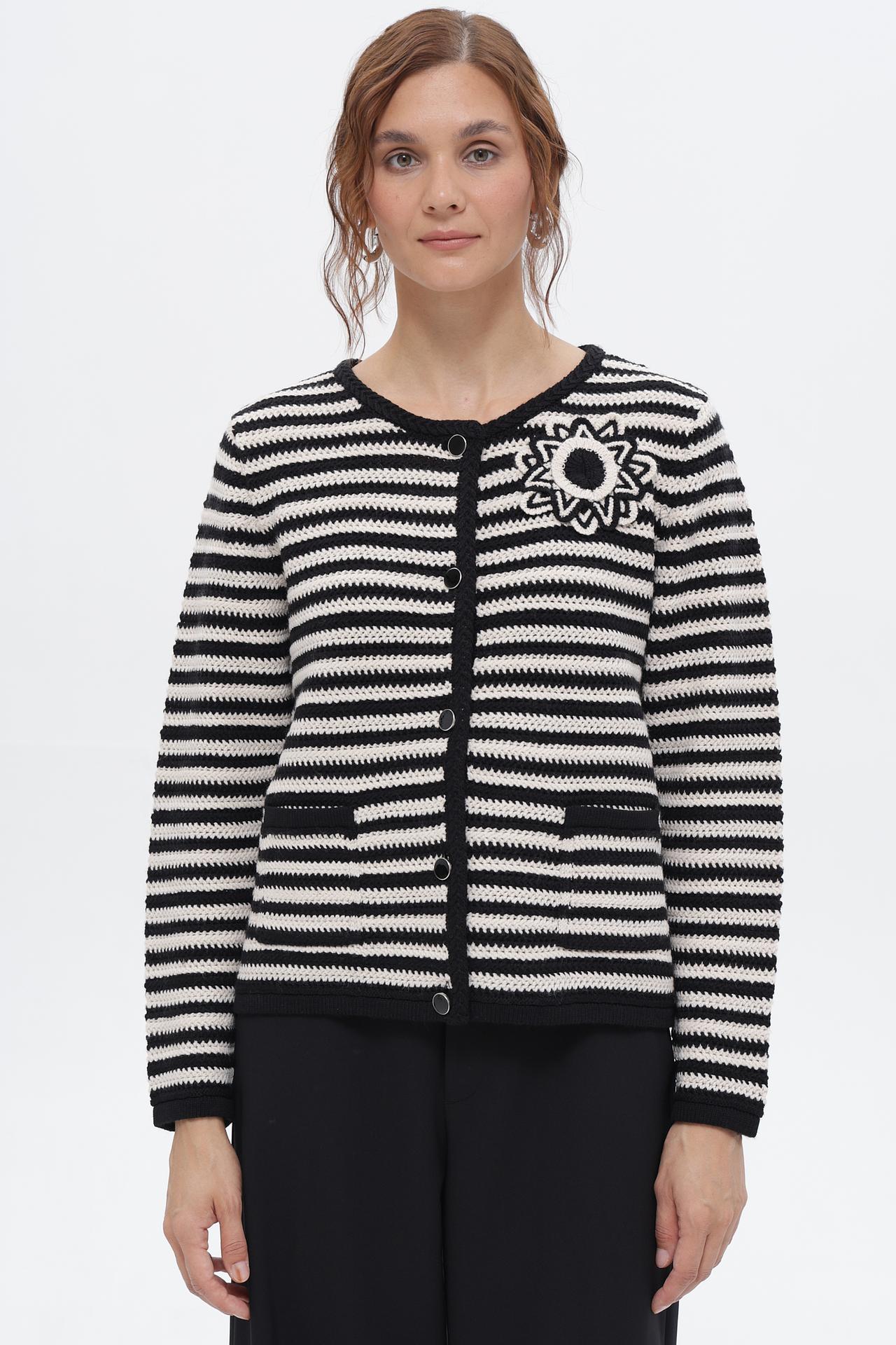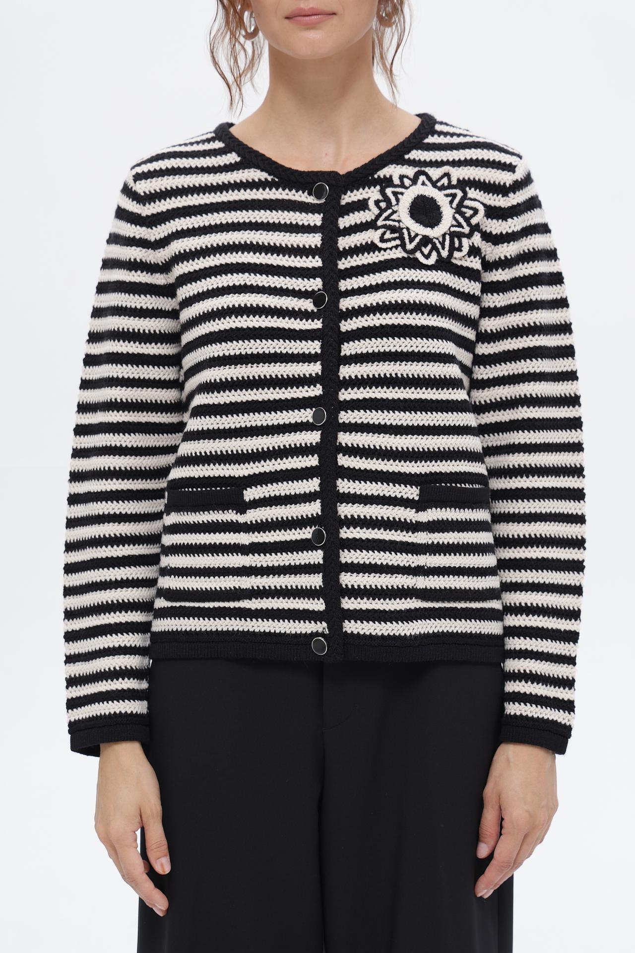 Стильный женский жакет от Rabe collection в классическом черно-белом исполнении. Модель с круглым вырезом горловины и застежкой на пуговицы. Жакет украшен оригинальной аппликацией в виде цветка на груди и двумя накладными карманами.
