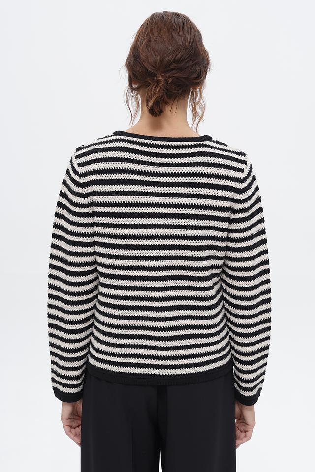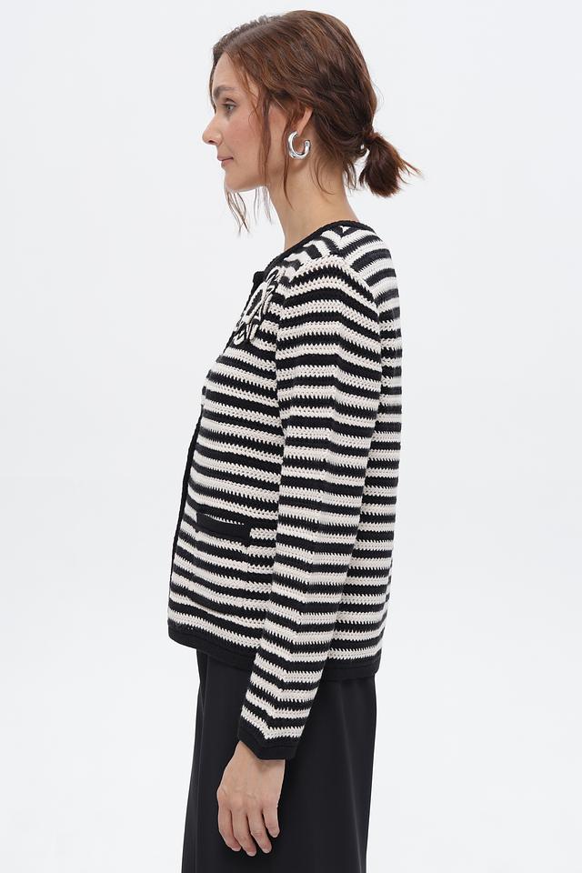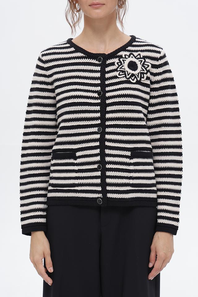 Жакет выполнен в контрастную чёрно-белую полоску, что придает ему особый шарм и универсальность. Декоративный элемент – аппликация в виде цветка – добавляет изделию изюминку и индивидуальность.